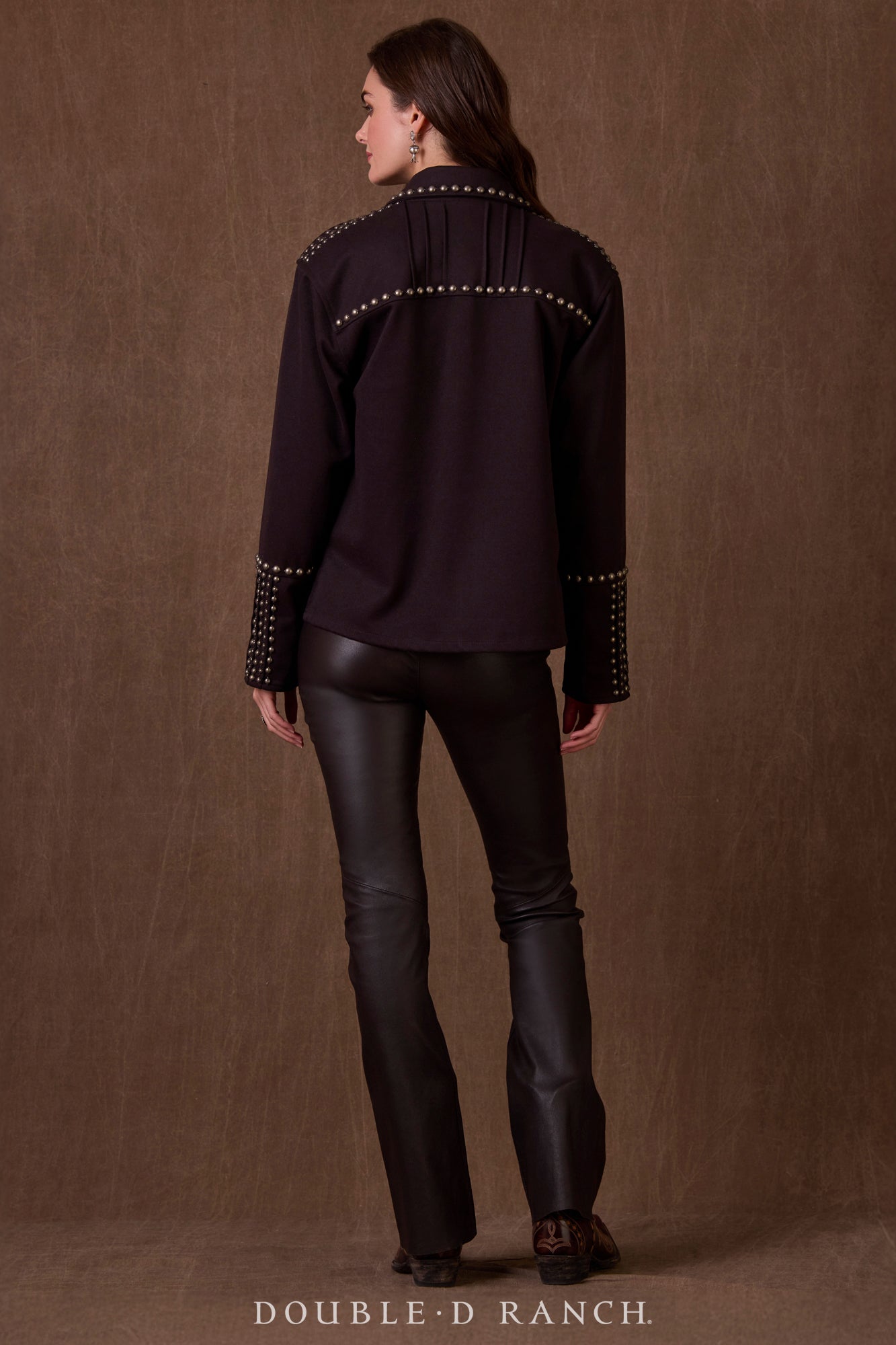 This little beauty is like getting a two-in-one for your wardrobe; the luxe fabric has a heavy hand and the classic straight-cut button-down silhouette can easily be styled open as a jacket or buttoned up as a top. It’s embellished with pintuck pleats, butterfly concho accents, and some statement studding – signature DDR style!