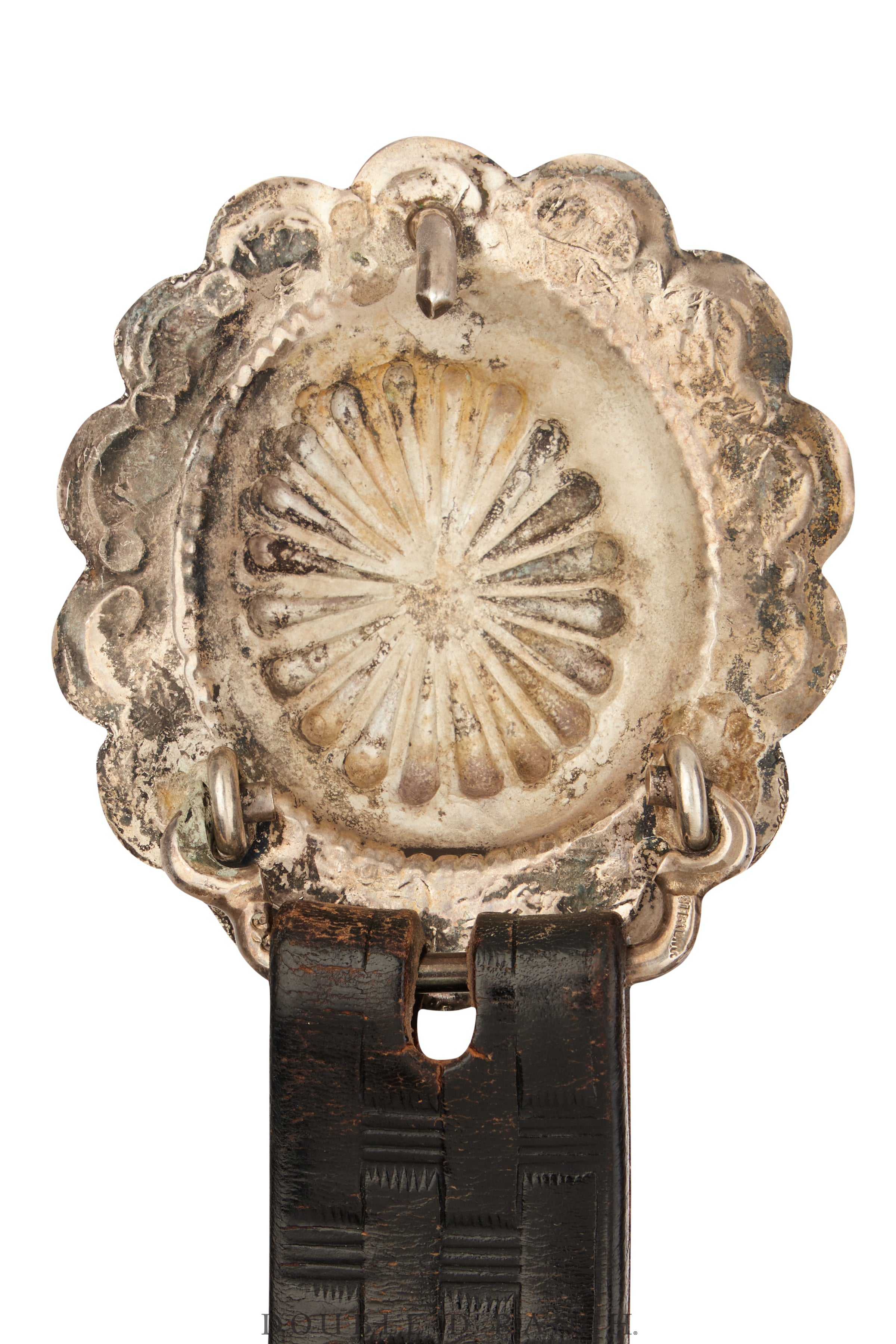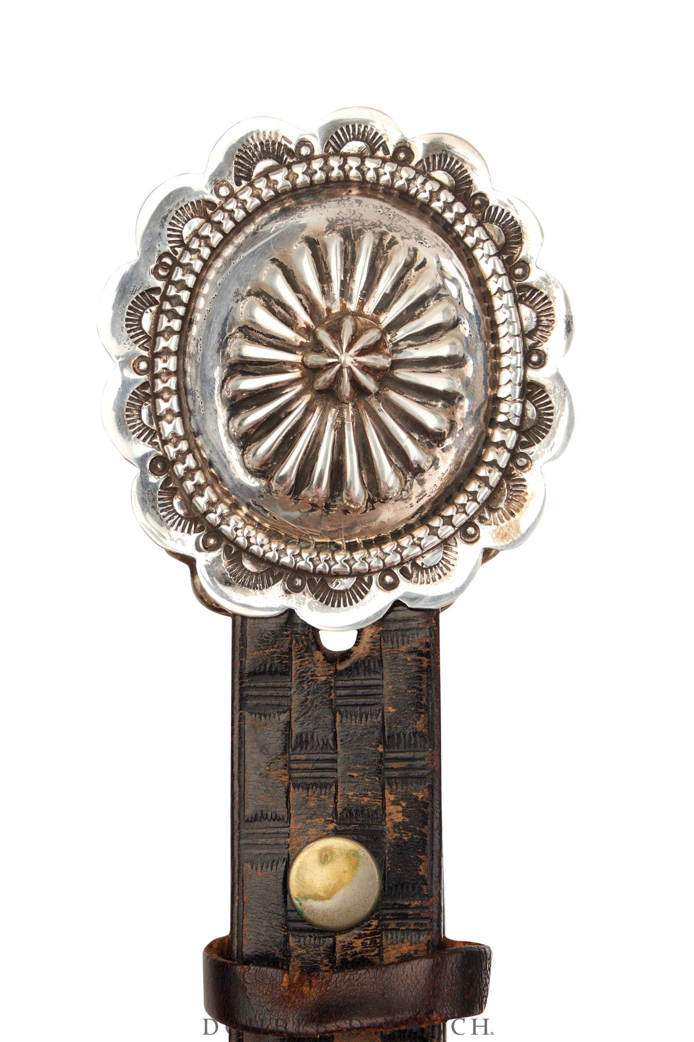 A fun vintage find indeed. This beauty boasts a striking sterling silver buckle with a round, scalloped concho design, patterned stampwork, and a large repousse center. The vintage strap brings everything together—an excellent addition to any cowgirl’s closet.