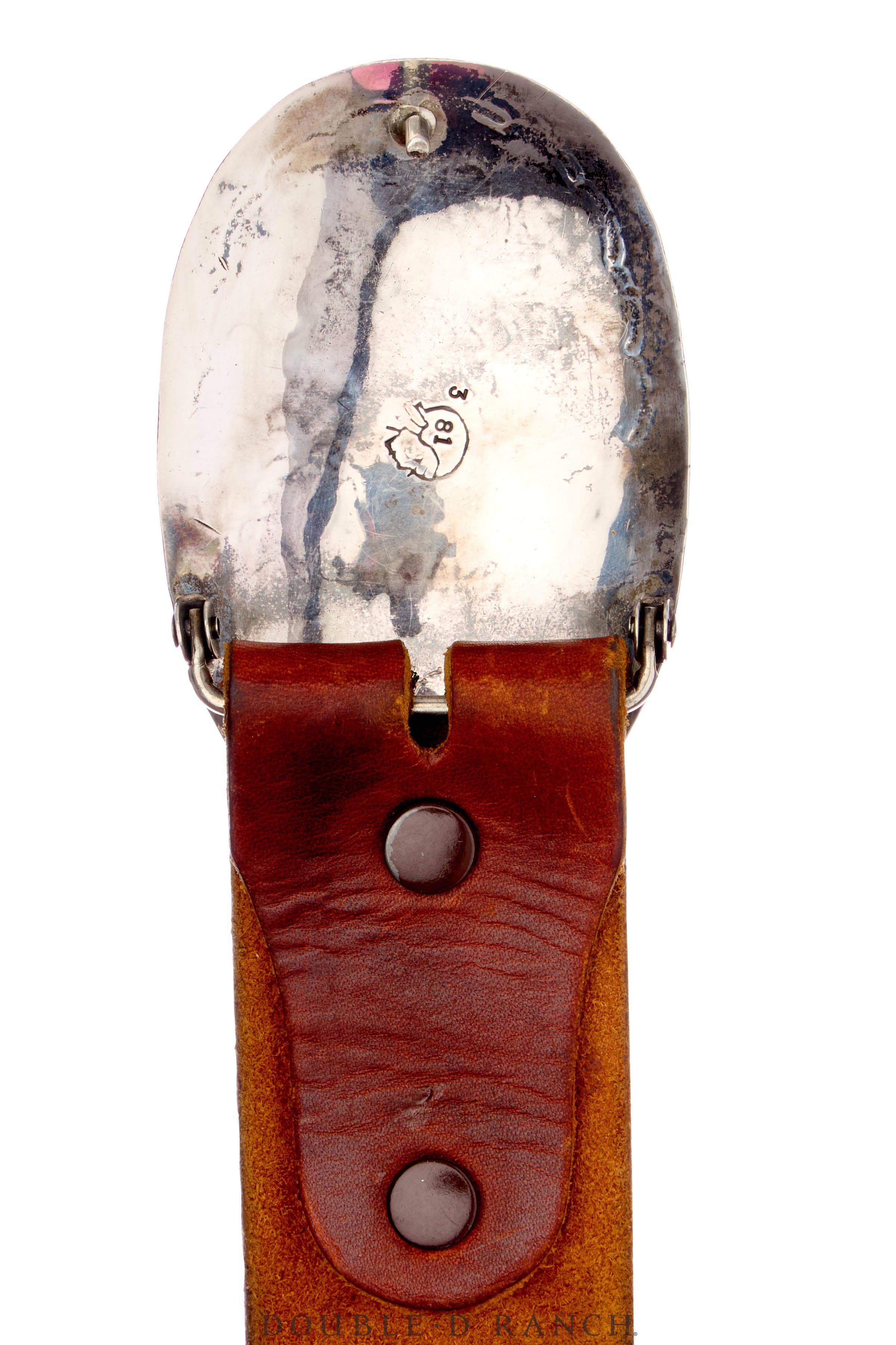 Talk about a statement piece. This vintage beauty boasts a striking sterling silver buckle in a sleek round concho design with a stamped border detail. A single stone of beautiful, blue, eye-catching turquoise sits dead center. The vintage strap brings everything together. A wonderful addition to any cowgirl’s closet.
