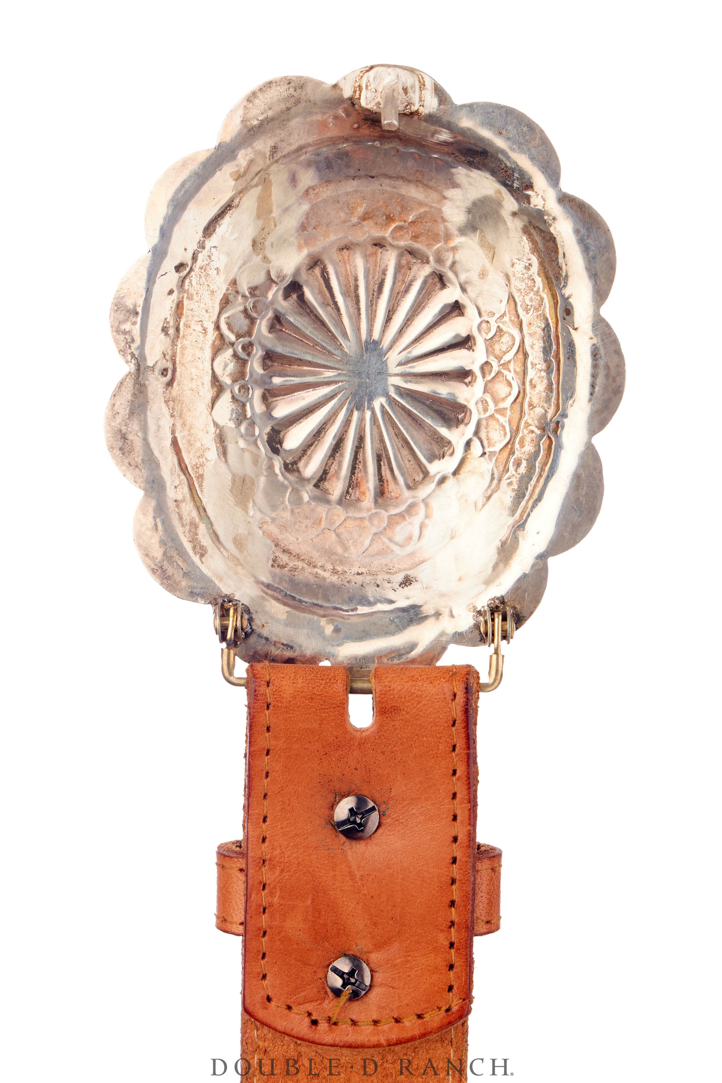 Talk about a statement piece. This beauty boasts a striking sterling silver buckle in a classic concho design. The intricate stampwork, tiny eyelets, and central repousse are complemented by a single stone of beautiful blue turquoise. The vintage strap is amazing, intricately tooled with its own unique design.