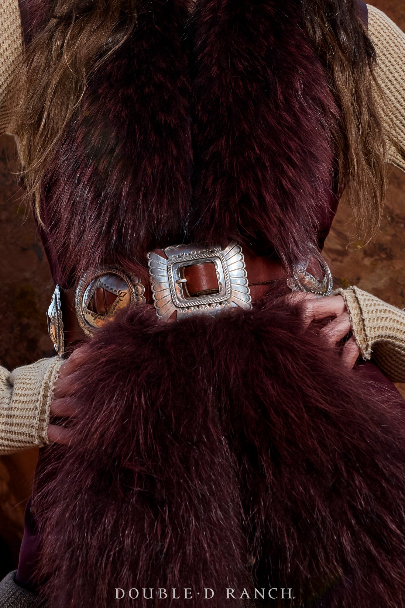 This stunning statement belt is a remarkable vintage find dating back to the 1940s. Crafted in 1st Phase revival style, it boasts 9 classic stamped silver scallop conchos visibly laced onto a wide leather strap, finished with a complementing bowtie concho buckle. Classic and collectible!