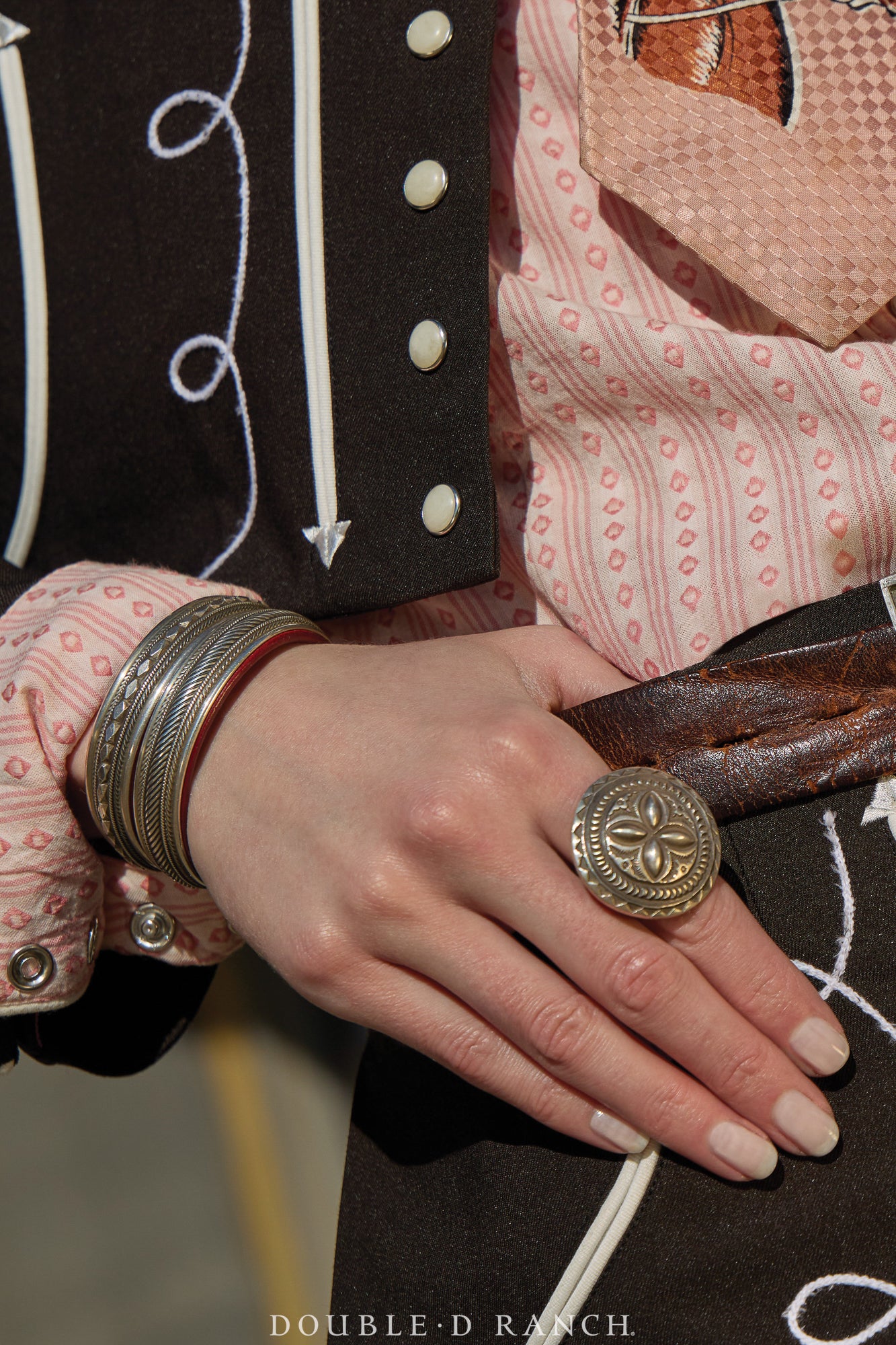 This beauty is a creation by Ramona Heiss, apprentice of renowned jewelry artisan Charlie Favour. The bracelet is a band of sterling silver rope details and, in the signature style of her mentor, lined with leather. A sleek stacker cuff for a guy or a gal.