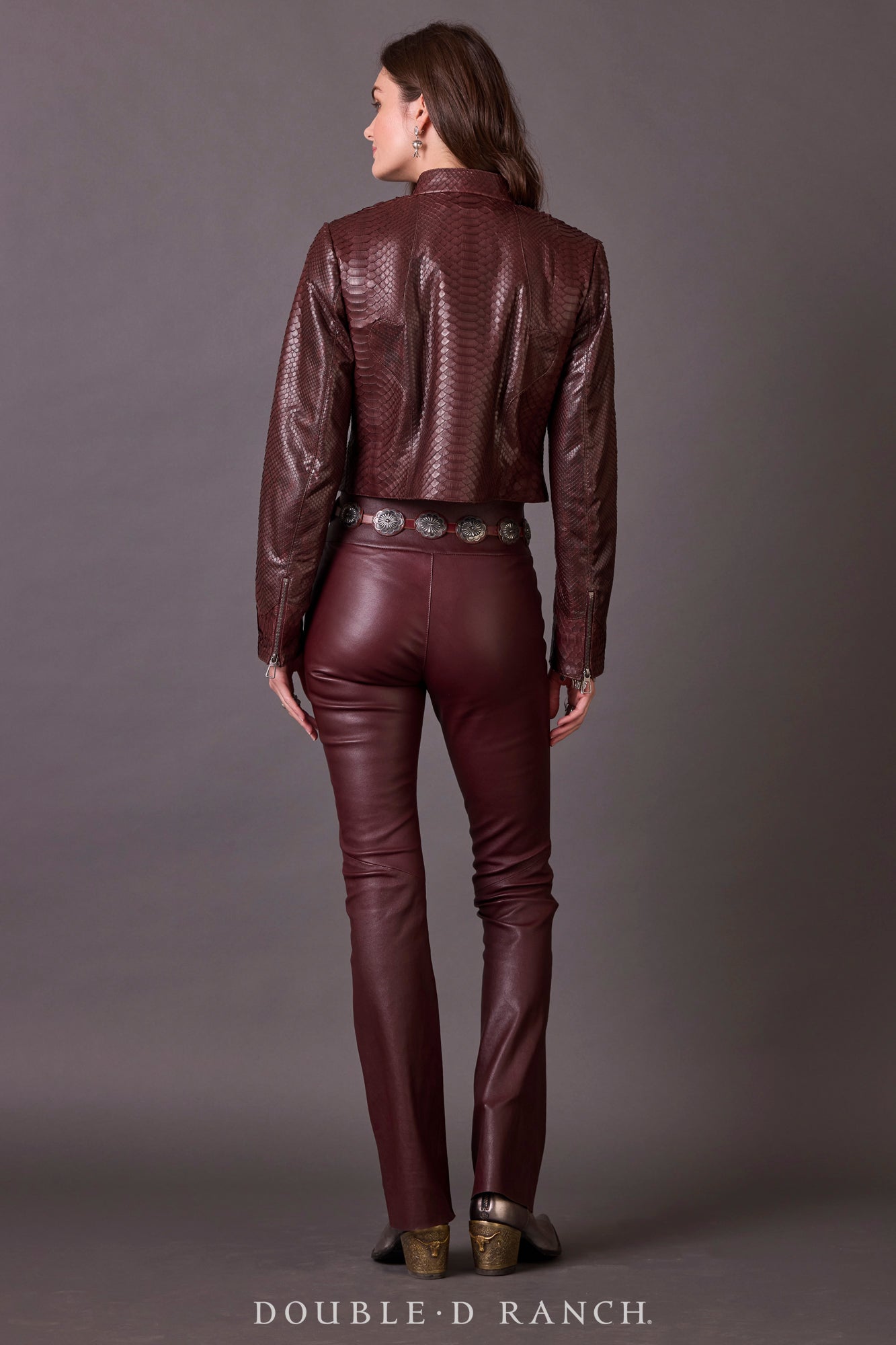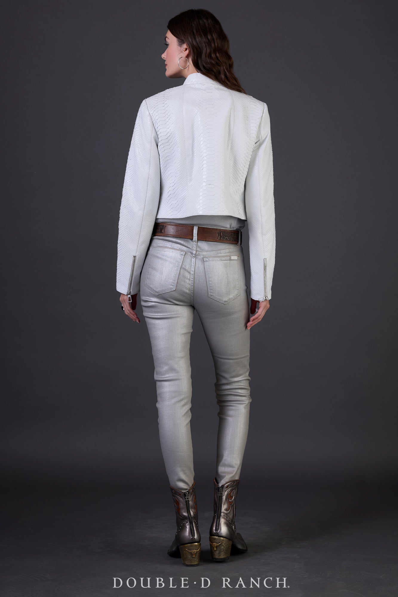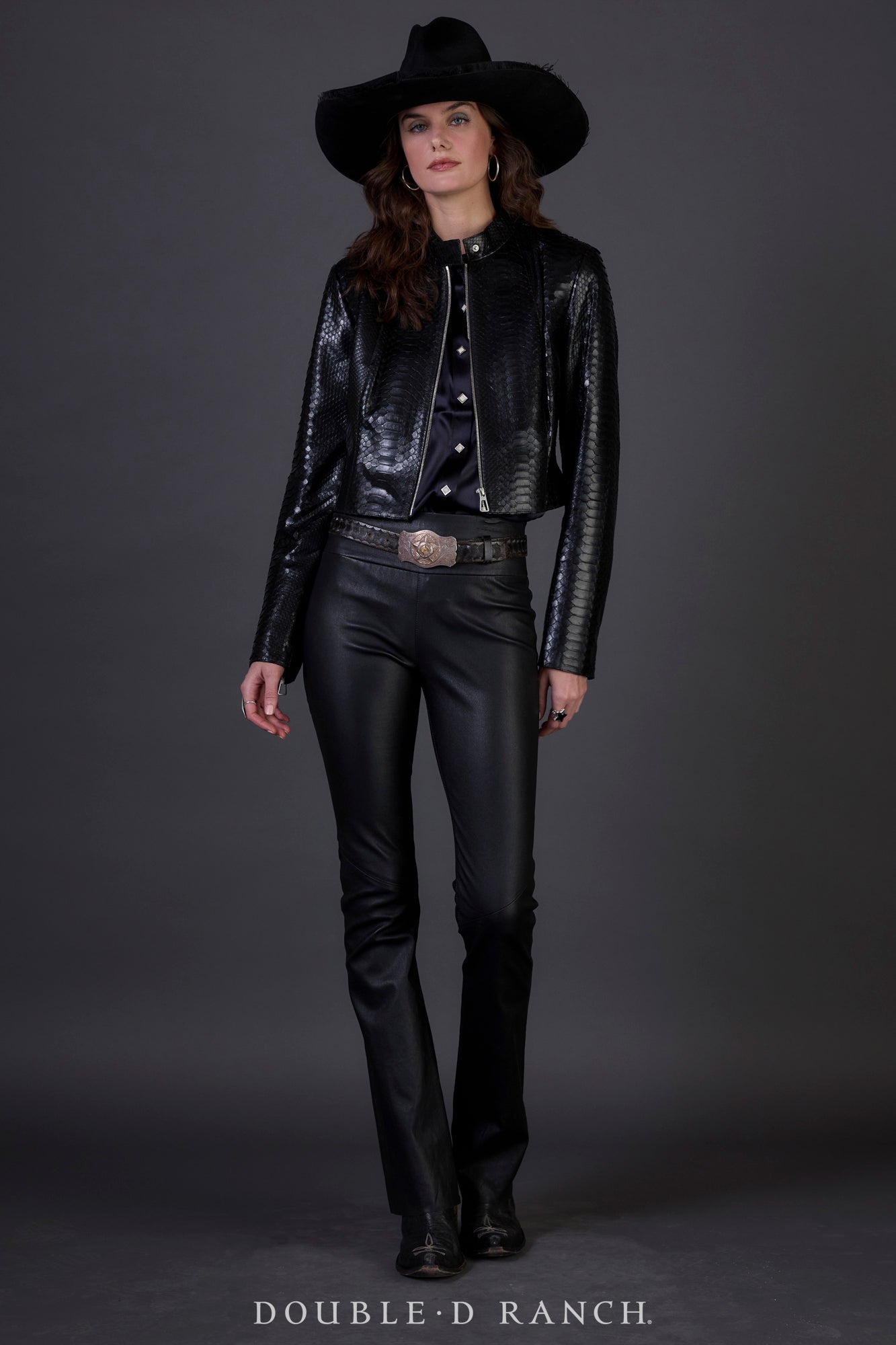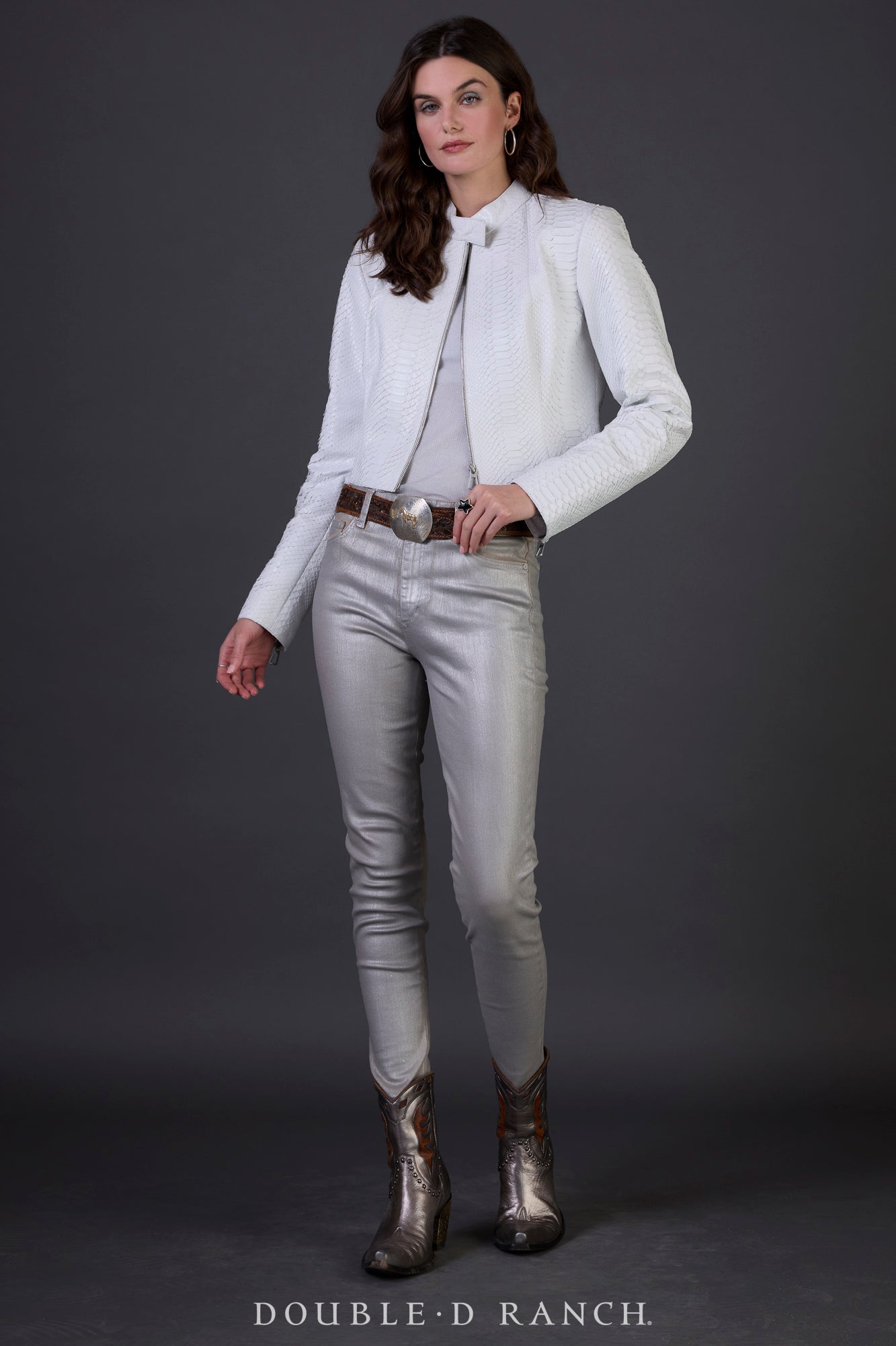 Crafted in extraordinary python leather as part of Double D Ranch’s elite Silver Label, this memorable monochromatic biker marries chic simplicity with striking statement style. The exquisite texture is amplified by the sleek silhouette for an overall aesthetic that’s undeniably timeless.