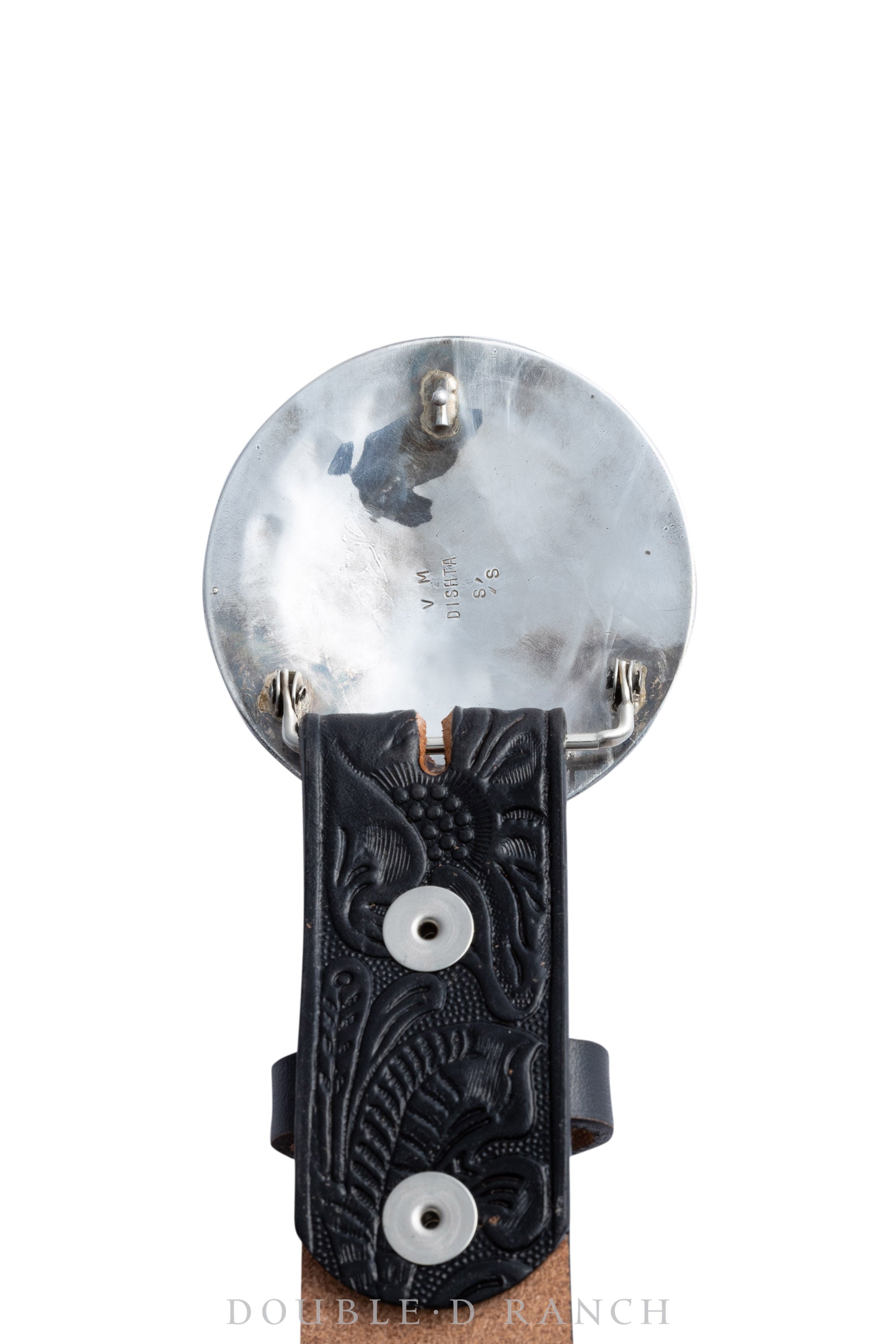 What was once just admired for its craftsmanship and detail, Dishta’s pieces are now highly coveted and collectible. We are thrilled to be able to offer this awesome buckle and bolo set. This magnificent set features a wagon themed inlay of turquoise, coral and mother of pearl. The silverwork has a phenomenal level of detail and includes twisted wire, diamond and flower applique and decorative loops. In addition to the silverwork in the buckle and bolo slide is the absolutely stunning attention to detail in the bolo tips that are the rear view of a wagon with a moving wheel.