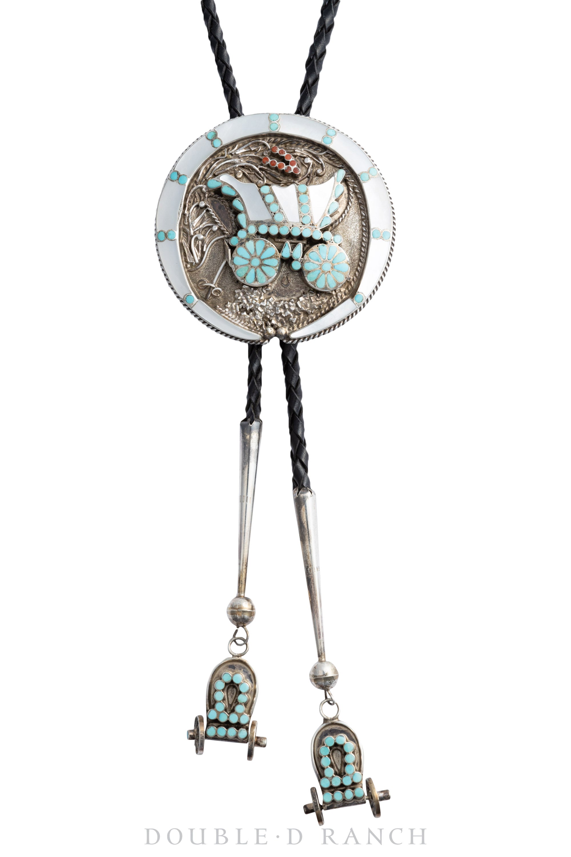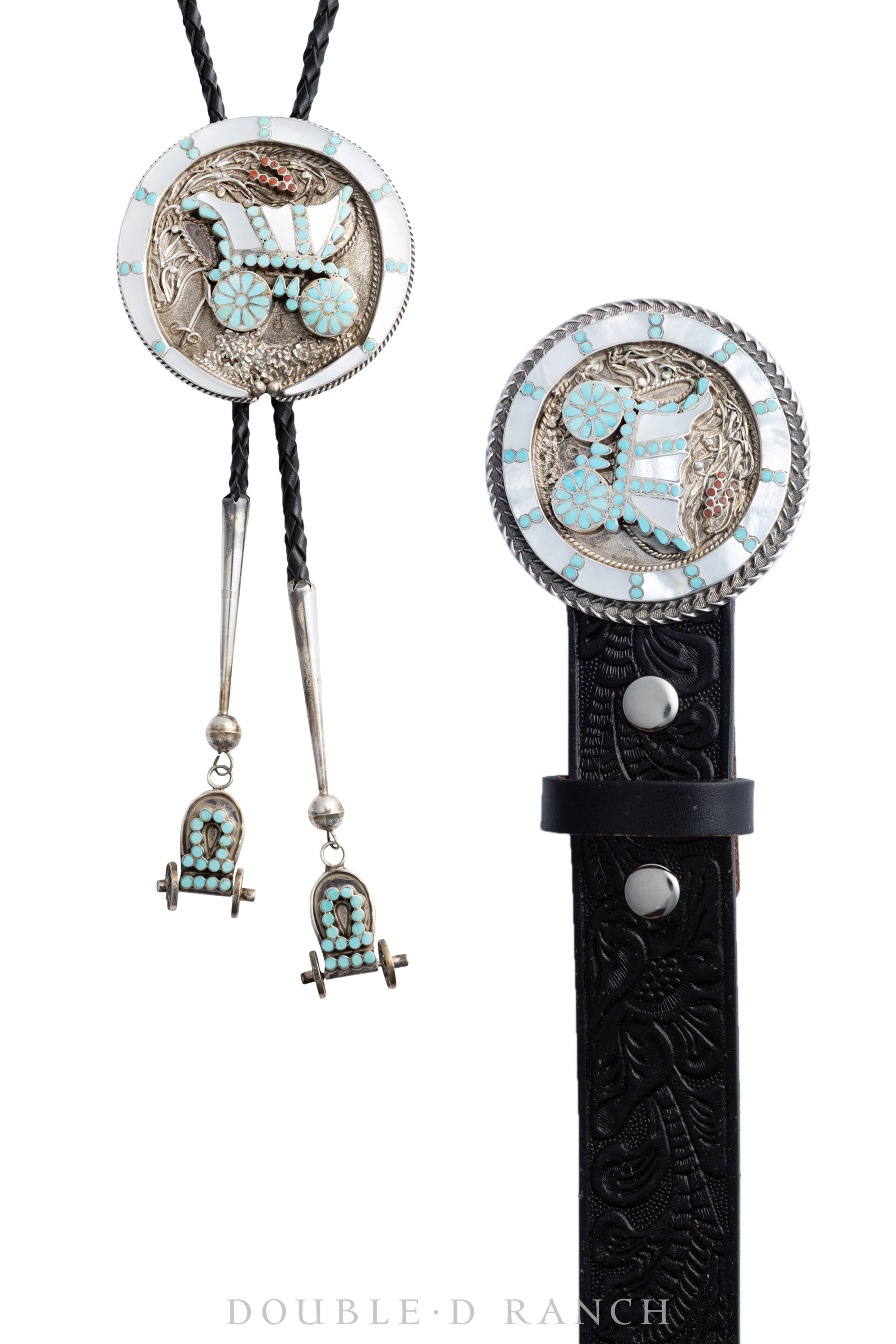 • Belt & Bolo Set, Inlay, Multi Stone, Conestoga wagon, Dishta, Vintage, 1900
