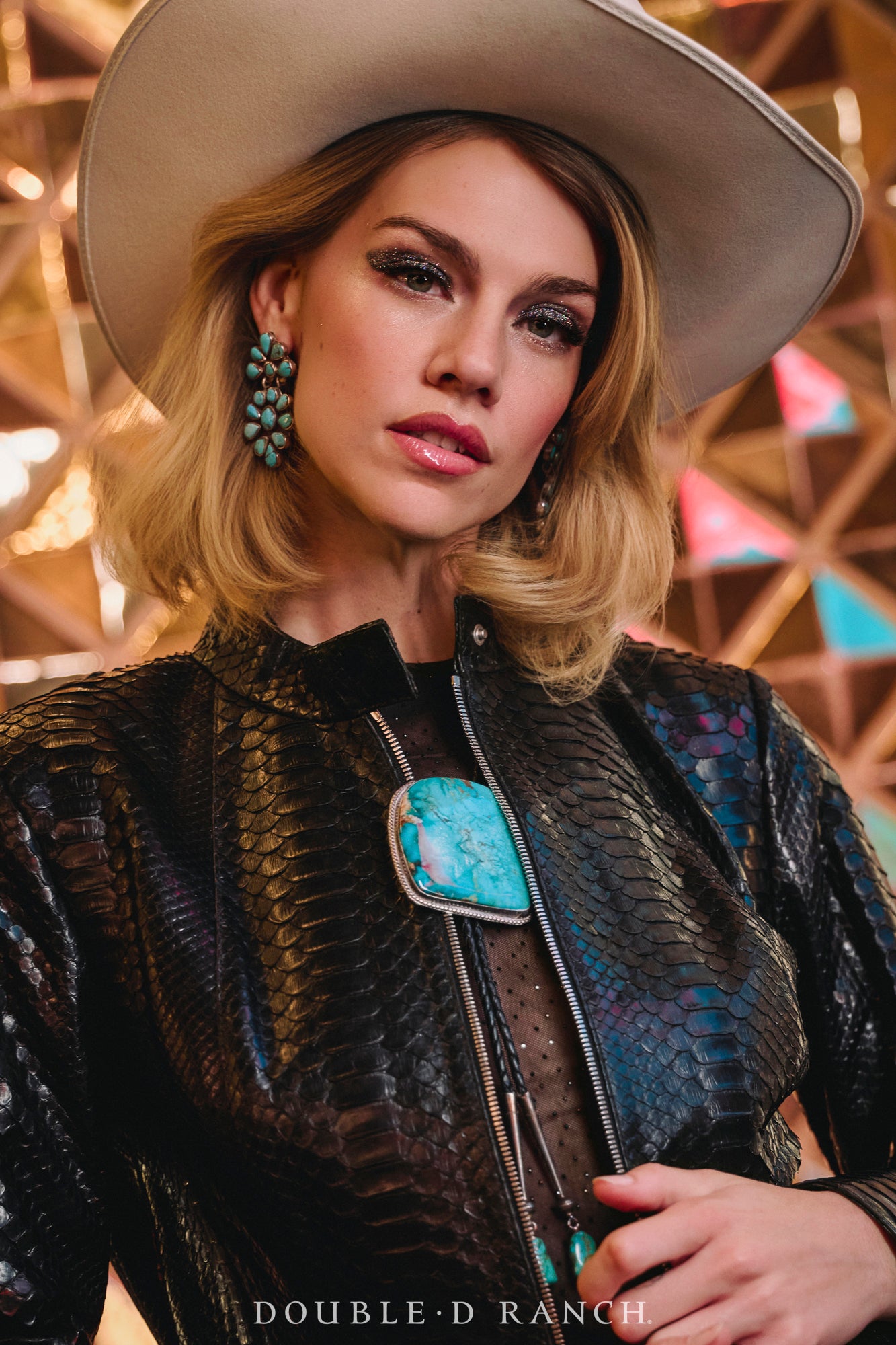 Big, bold, and beautiful are three words that describe this vintage Navajo bolo tie. The bolo itself is a large, unique shaped turquoise stone set in a simple bezel with a sterling silver rope border. Its color is a light baby blue with large mineral deposits throughout the stone. It has a tension clamp on the back to keep it in place on the black braided bolo cord that has sterling silver aiguillettes and round turquoise stone dangles on its ends. Bring big bold beauty to your style with this bolo.