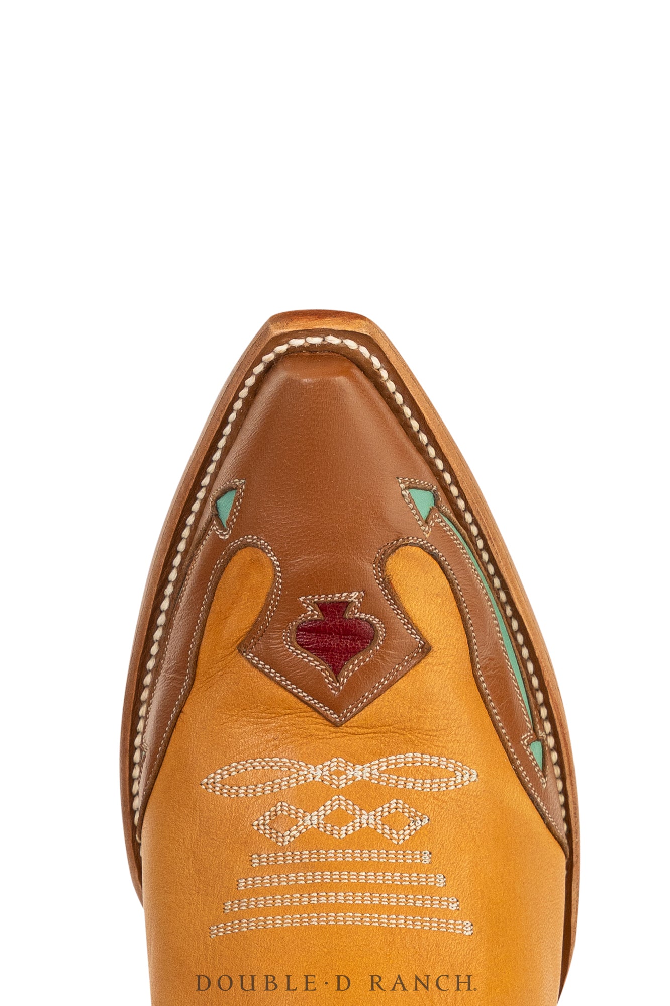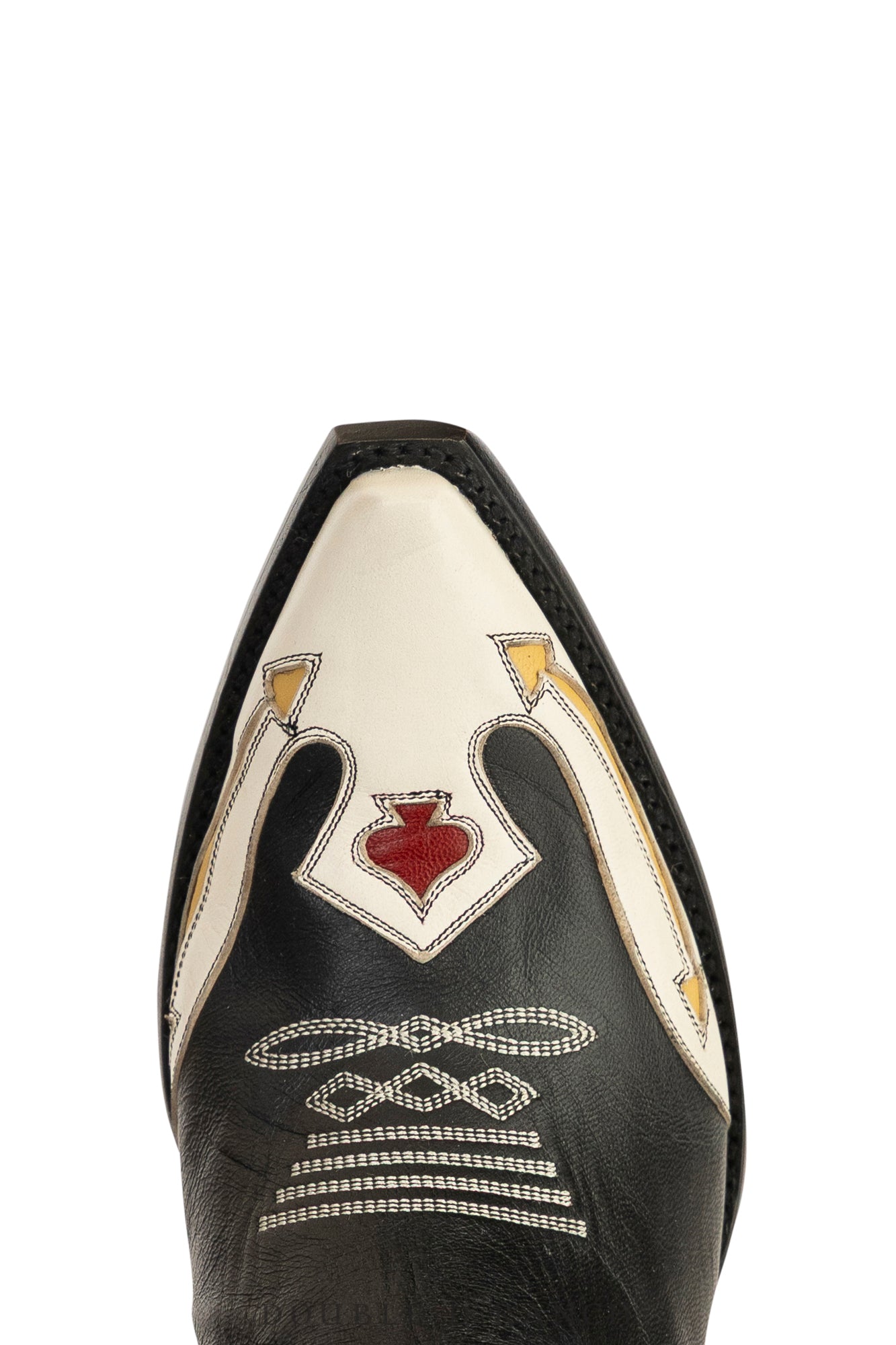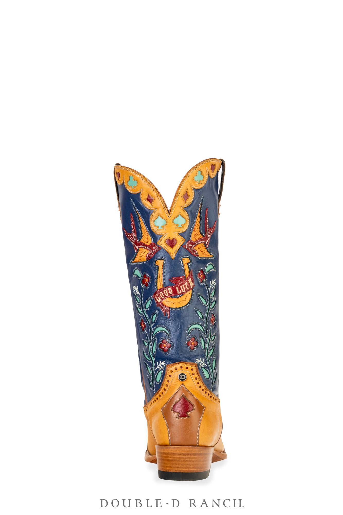 These bold boots are the perfect blend of beautiful and bad*ss. The color combinations are striking and the inlay and embroidery is exquisite, boasting icons like a lucky horseshoe, classic Western welts, and all the symbols of the poker suits, balanced out with florals and birds and the daintiest dot trim. From the rodeo to the casino and everywhere in between, these are boots worth bettin’ on!