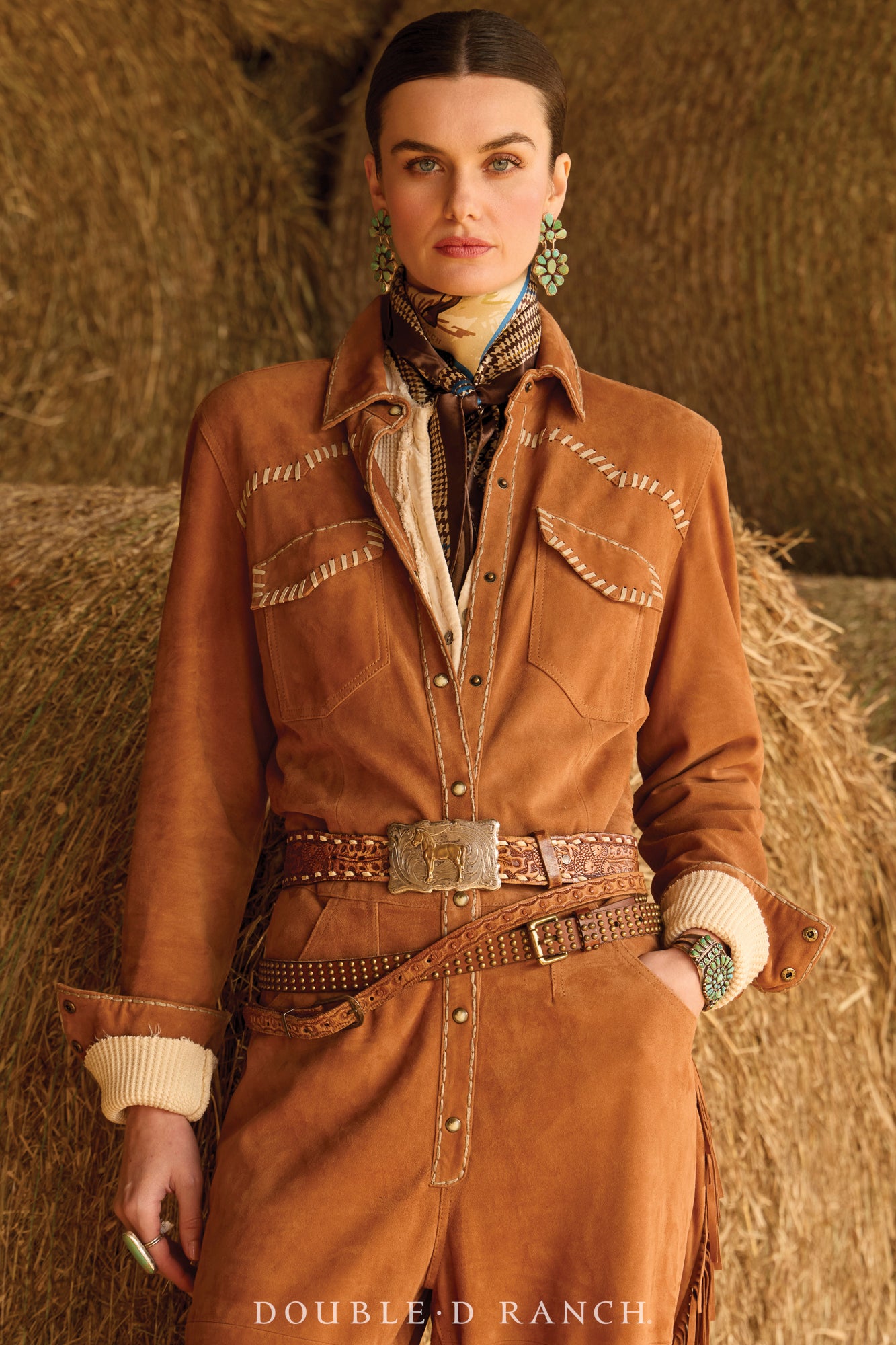 Oh, we are so here for two-steppin’ in a one piece! Obviously not your average jumpsuit, this fun ‘fit is a gorgeous bridle-hued goat suede complemented with contrasting white stitching and leather whip stitch lacing, finished with classic pearl snaps and some fabulous fringe. We can picture this styled so many fun ways – we can’t wait to see it on you!