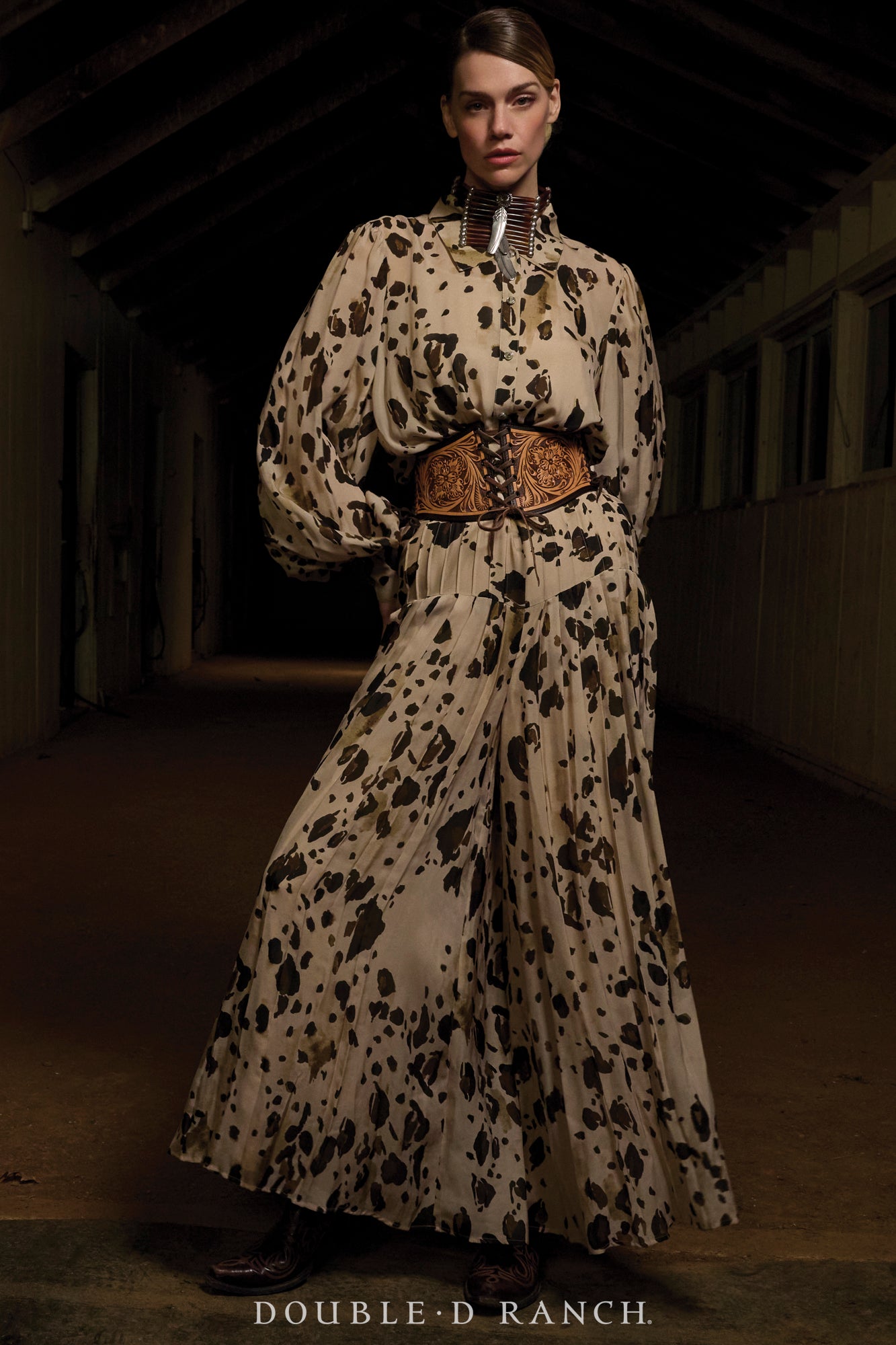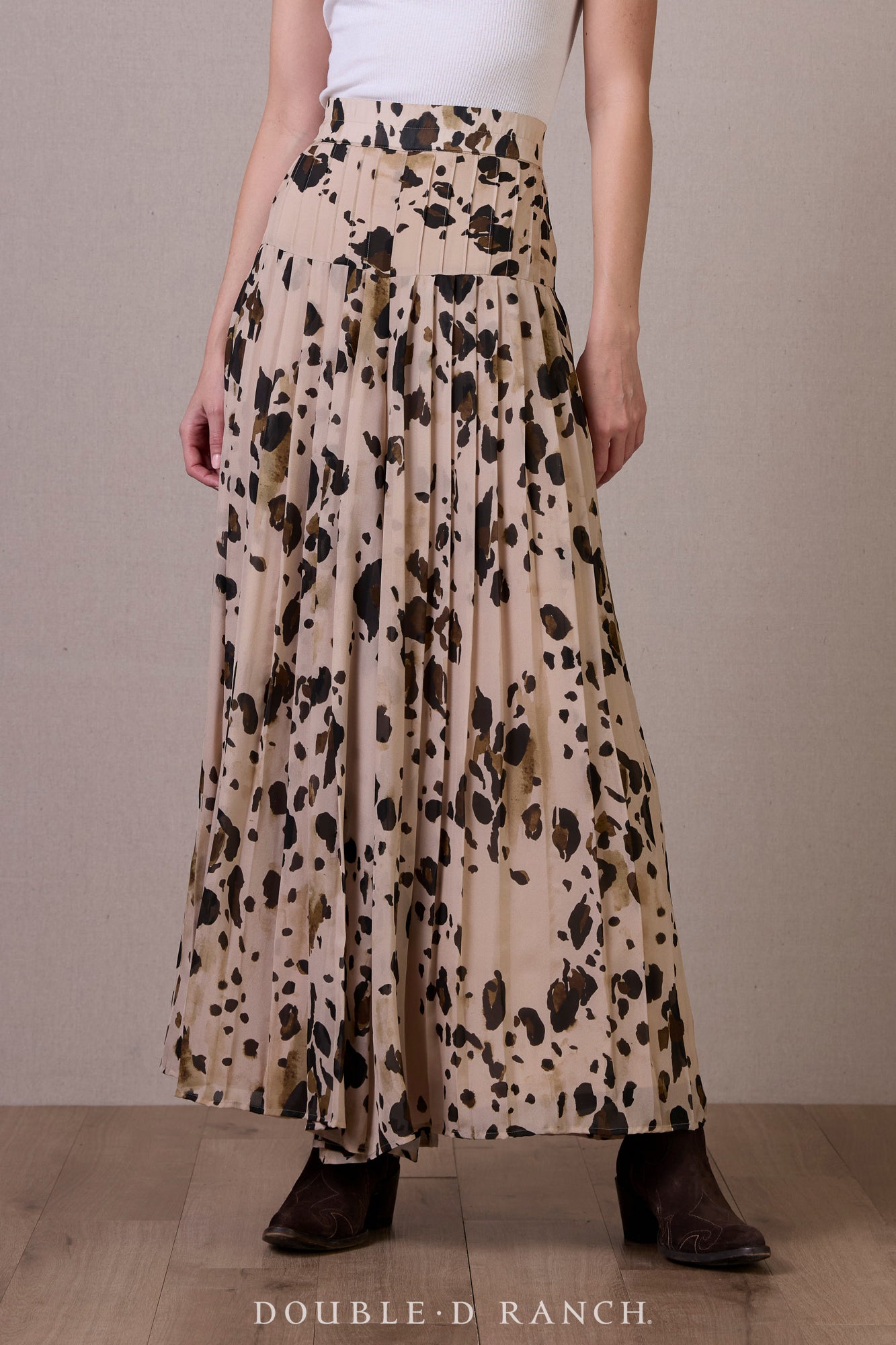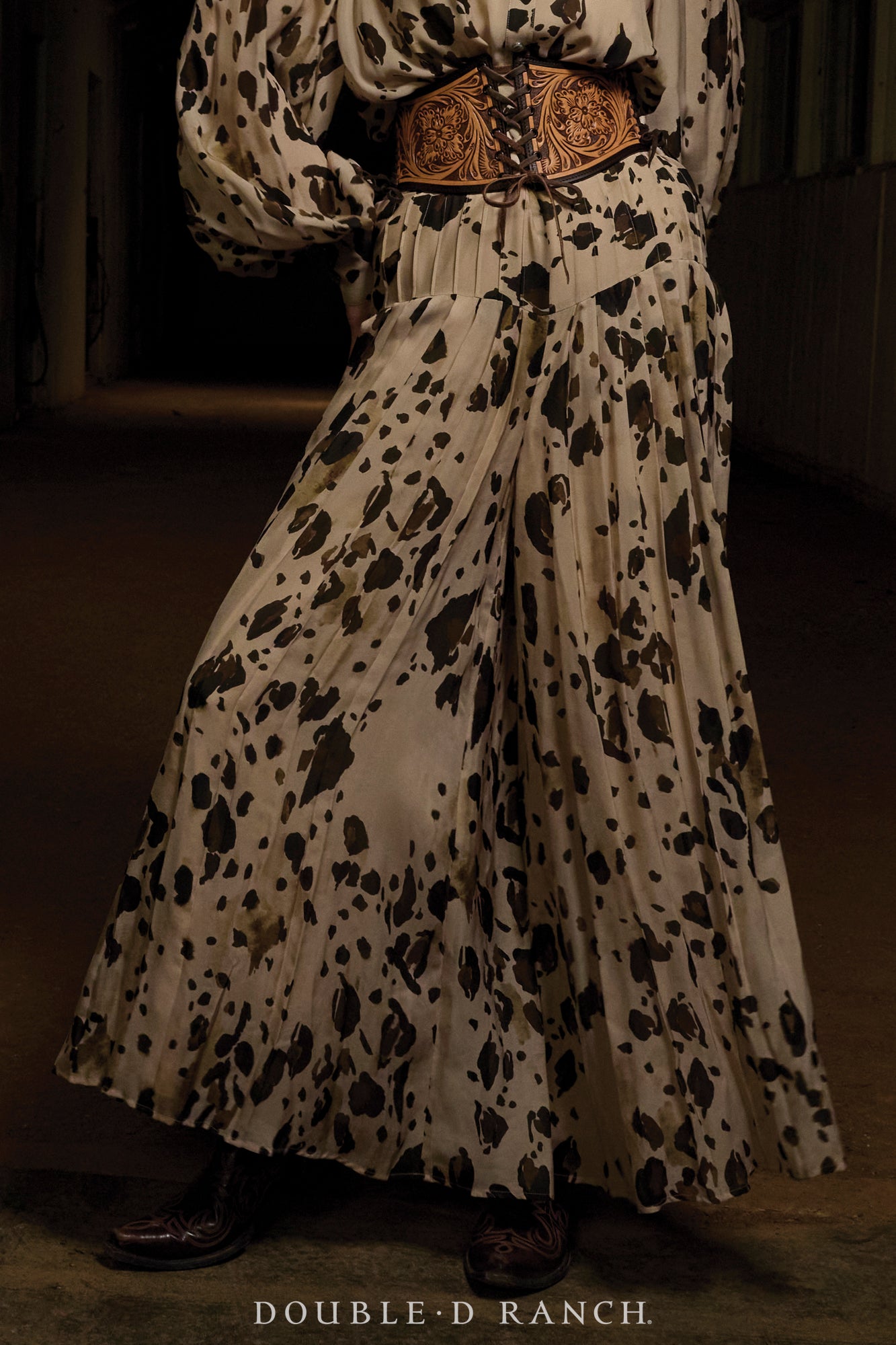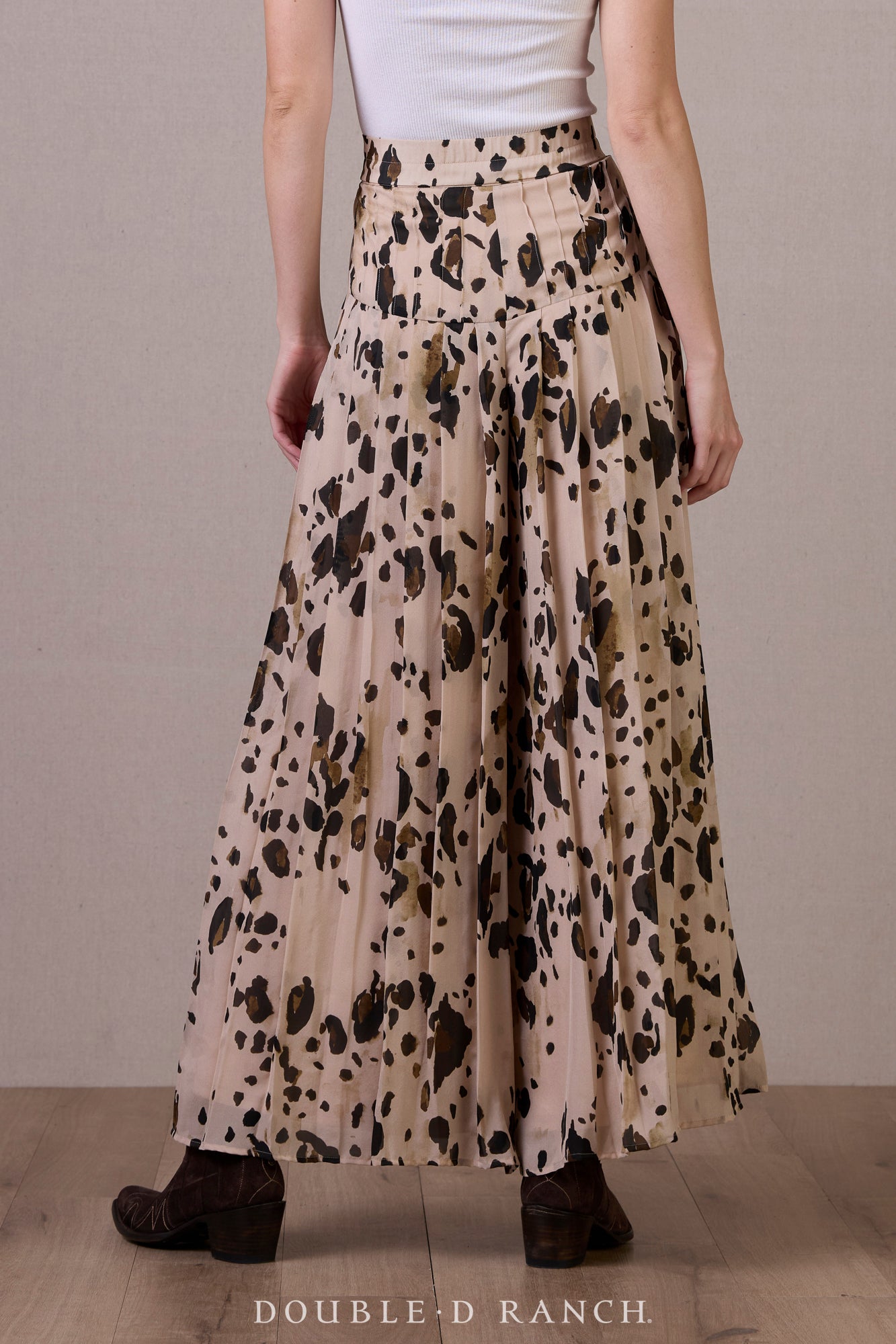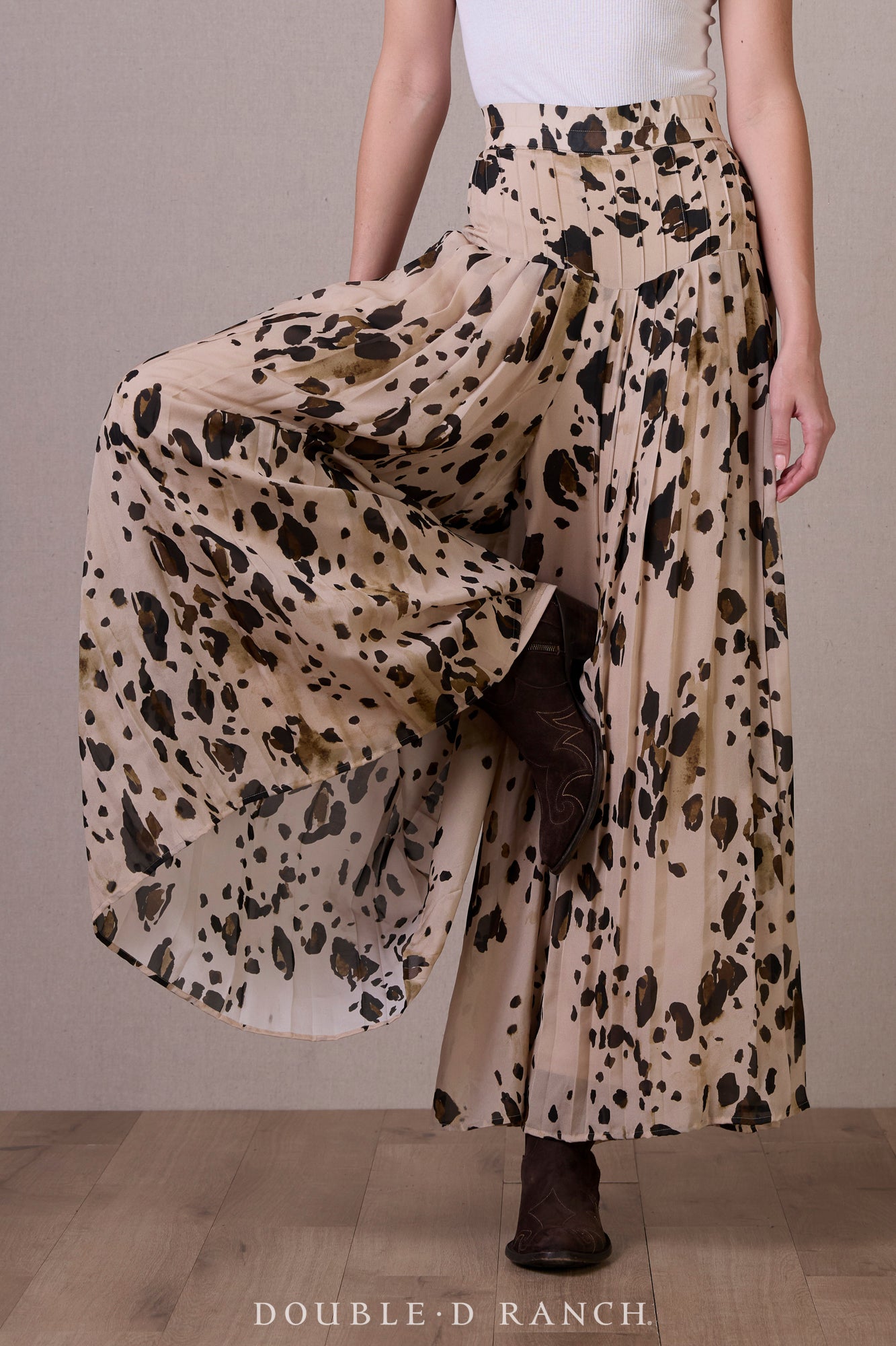 It just wouldn’t be right to design a whole equine-inspired collection without creating a pony print! (Don’t come for us about calling it chrome, we know it’s more of a paint pony print.) It may be one of our favorite animal prints ever, because it’s got a decidedly Western vibe – instantly reads more livestock than exotic – and the grounded earthy hues truly work as a neutral, which we’ve always believed in treating animal prints as anyway. We’re especially enamored with this iteration, because with the fitted waist and full-volume leg, it’s all the beauty of a pleated broomskirt, but the comfort and functionality of a pant! These might just be the GOAT of the pony print!