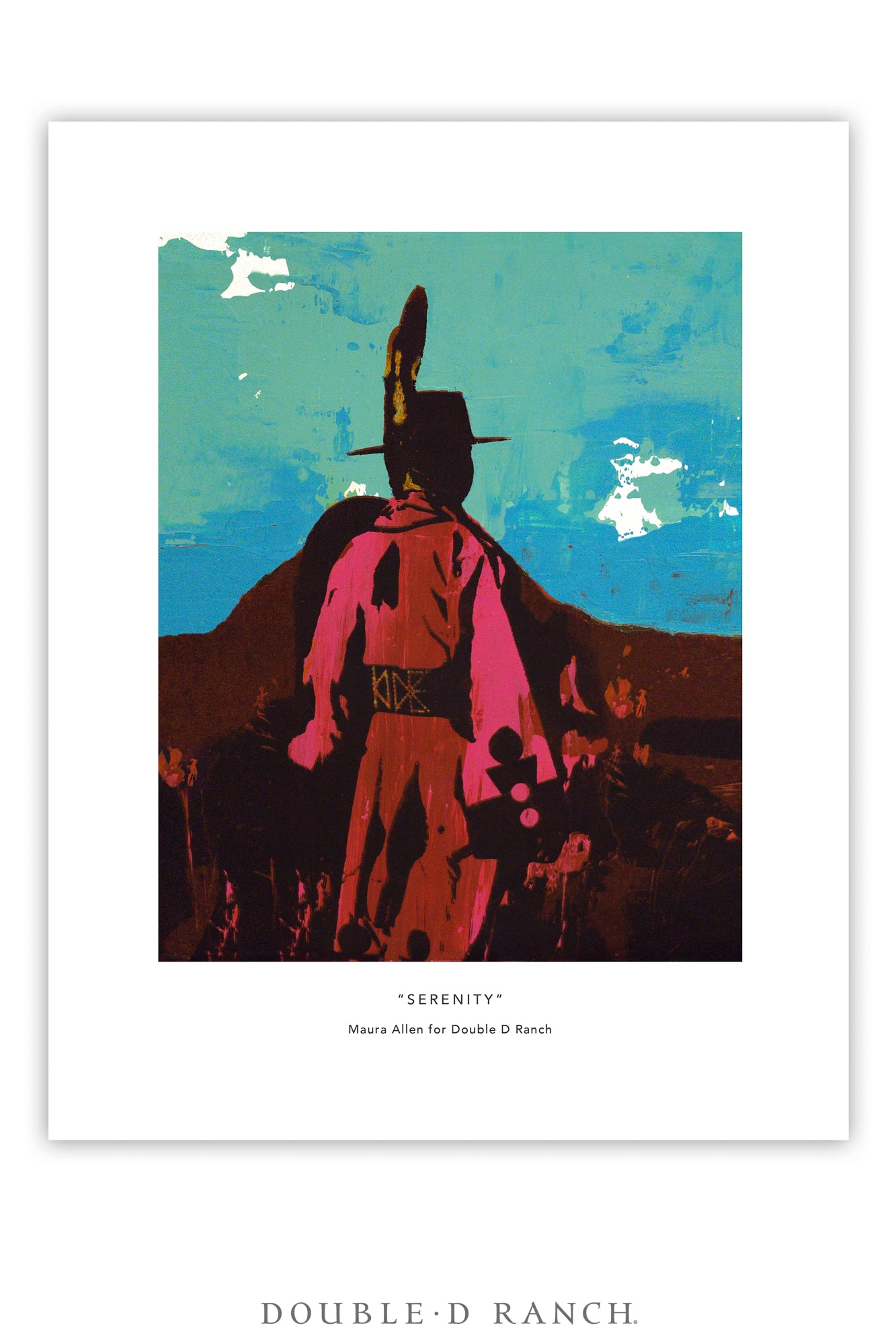 We had the opportunity and pleasure of collaborating with Maura on the 2025 Holiday Collection, incorporating some of her pieces into prints or transforming them into pieces all their own. This piece was commissioned specifically for the collaboration, and became one of the cornerstones of Past & Present, appearing as its own signature silk blouse, as the primary image on the season’s commemorative scarf, and also on a tee. Maura admits that the colors of the collection pushed her a little outside her traditional palette, and “that’s one of the best things that can happen to an artist.” Not only is it a beautifully poignant portrait, it also has a unique place in the Double D Ranch story – a multi-faceted win for your wall!