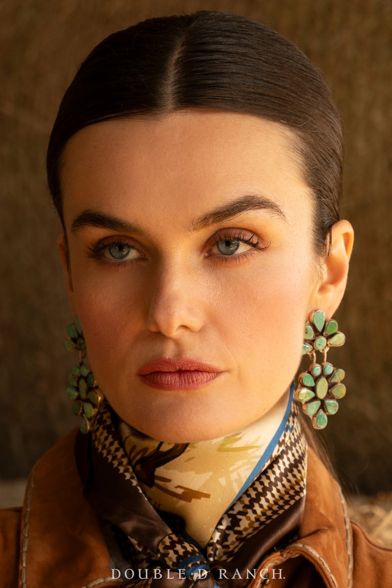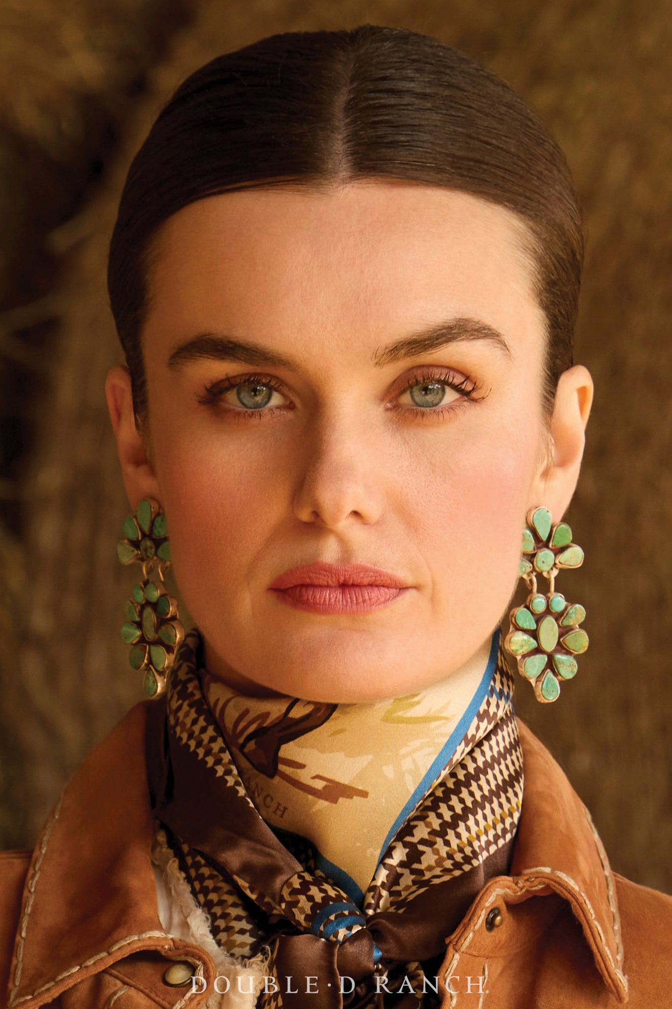 These chandelier earrings are Betz’ most sought-after shape. Crafted in green-hued turquoise, each stone is hand cut and set by the artisan. Hinged for light movement, these statement earrings have post back closures.