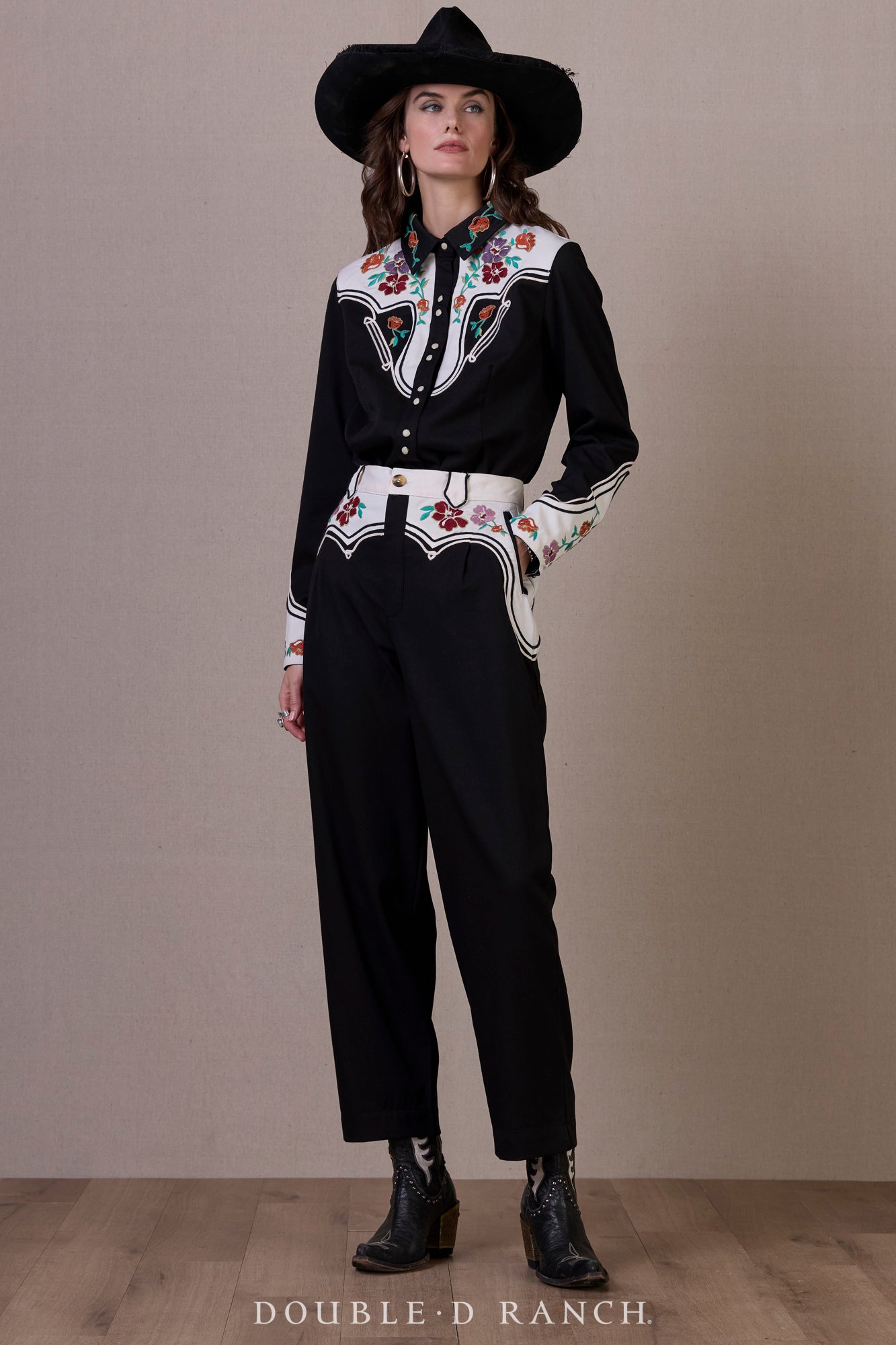 Traditional twang is getting a modern makeover with this chic two-toned pearl snap. The crisp black and white is complemented by colorful florals and elevated by details like multi-layered piping trim and pearl snaps set in twos. A gorgeous top that brings an element of polish to the pearl snap.