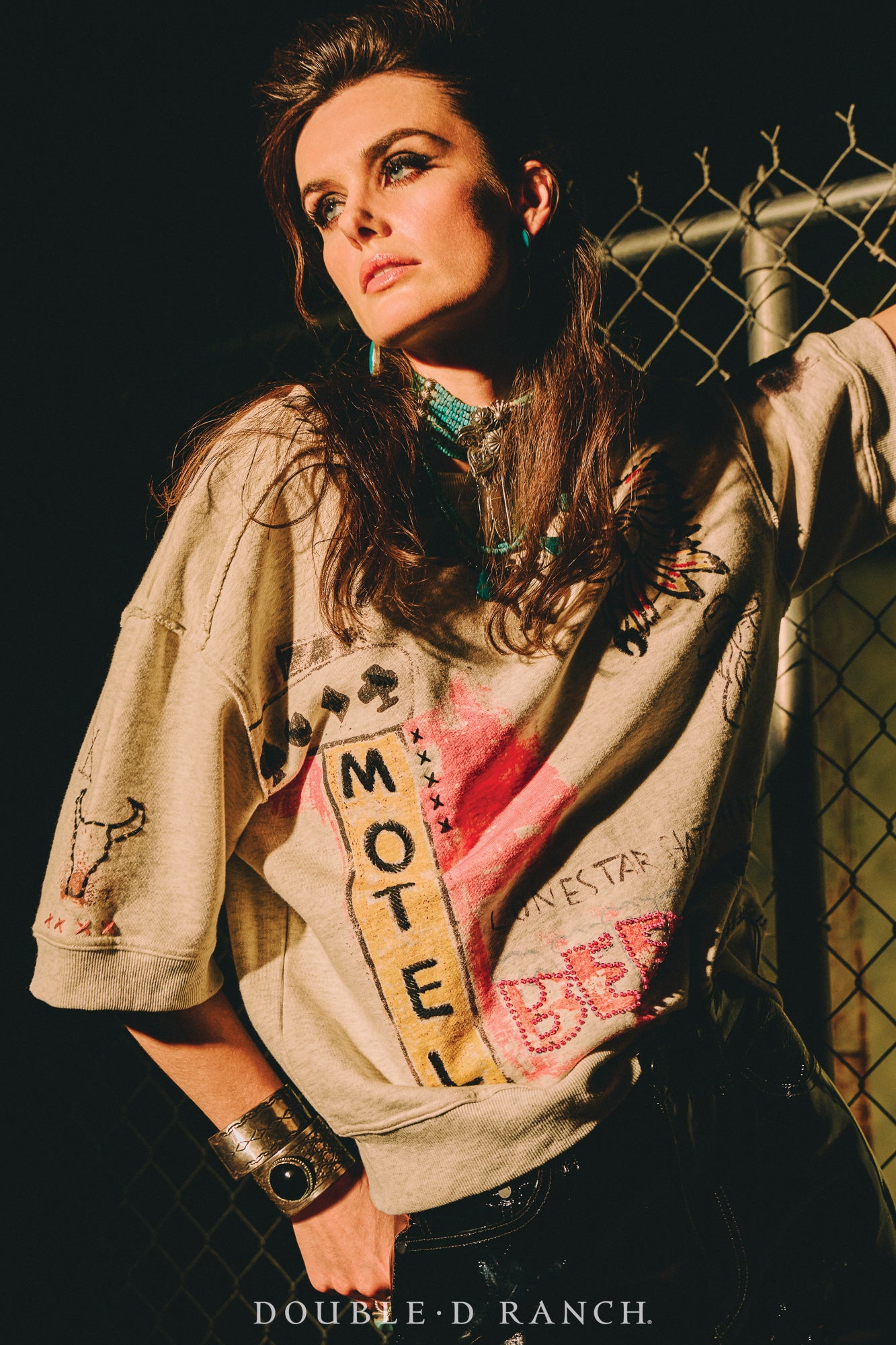 We accidentally sneak-peeked this top in a social media video about something else, and our phones lit up immediately – sold the one right off the model! This is an irresistible must-have from Cowboy Graffiti. Crafted in 100% cotton, it feels just like your favorite sweatshirt, but it’s embellished with all the essence of the collection and colorful artwork elements from our creative collaboration with Ryan Buenning. Plus, it’s short-sleeved, so you can rock it year-round!