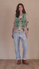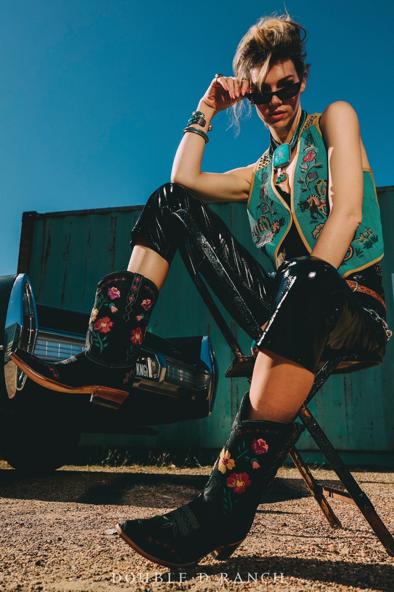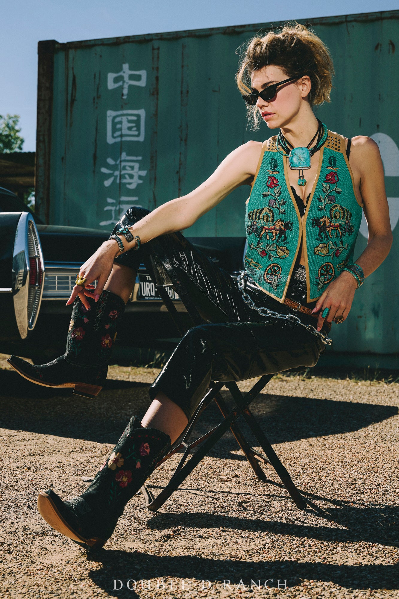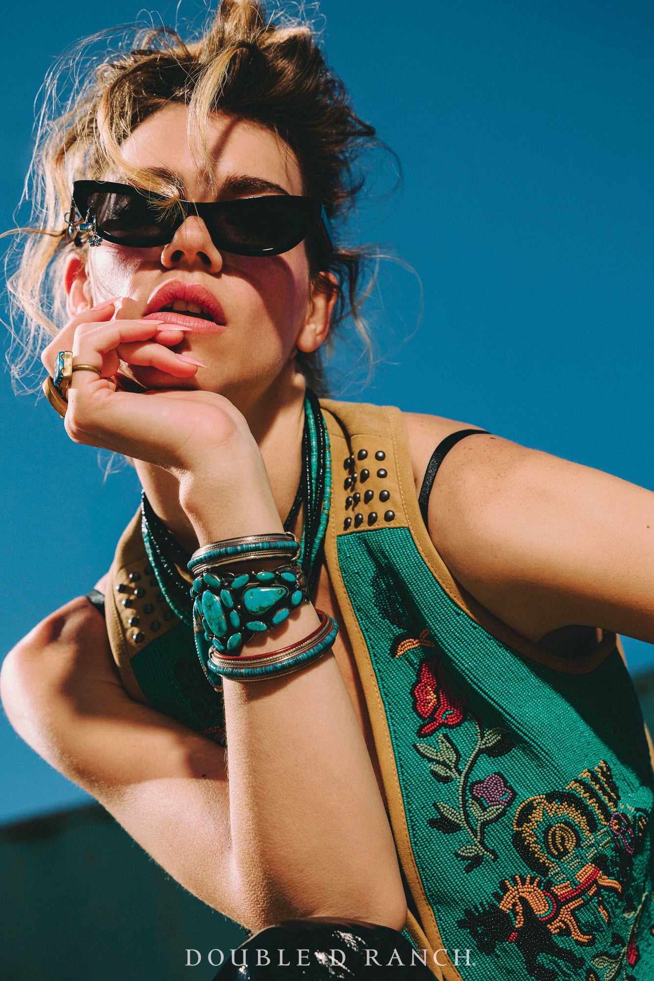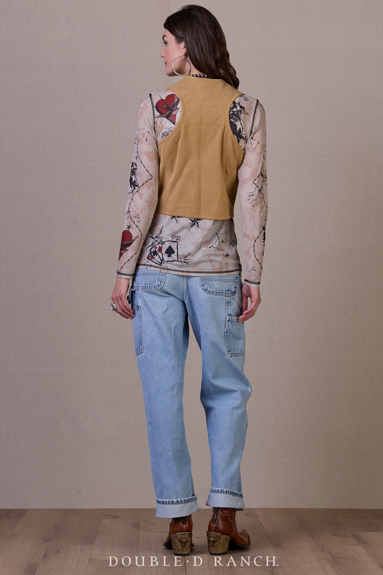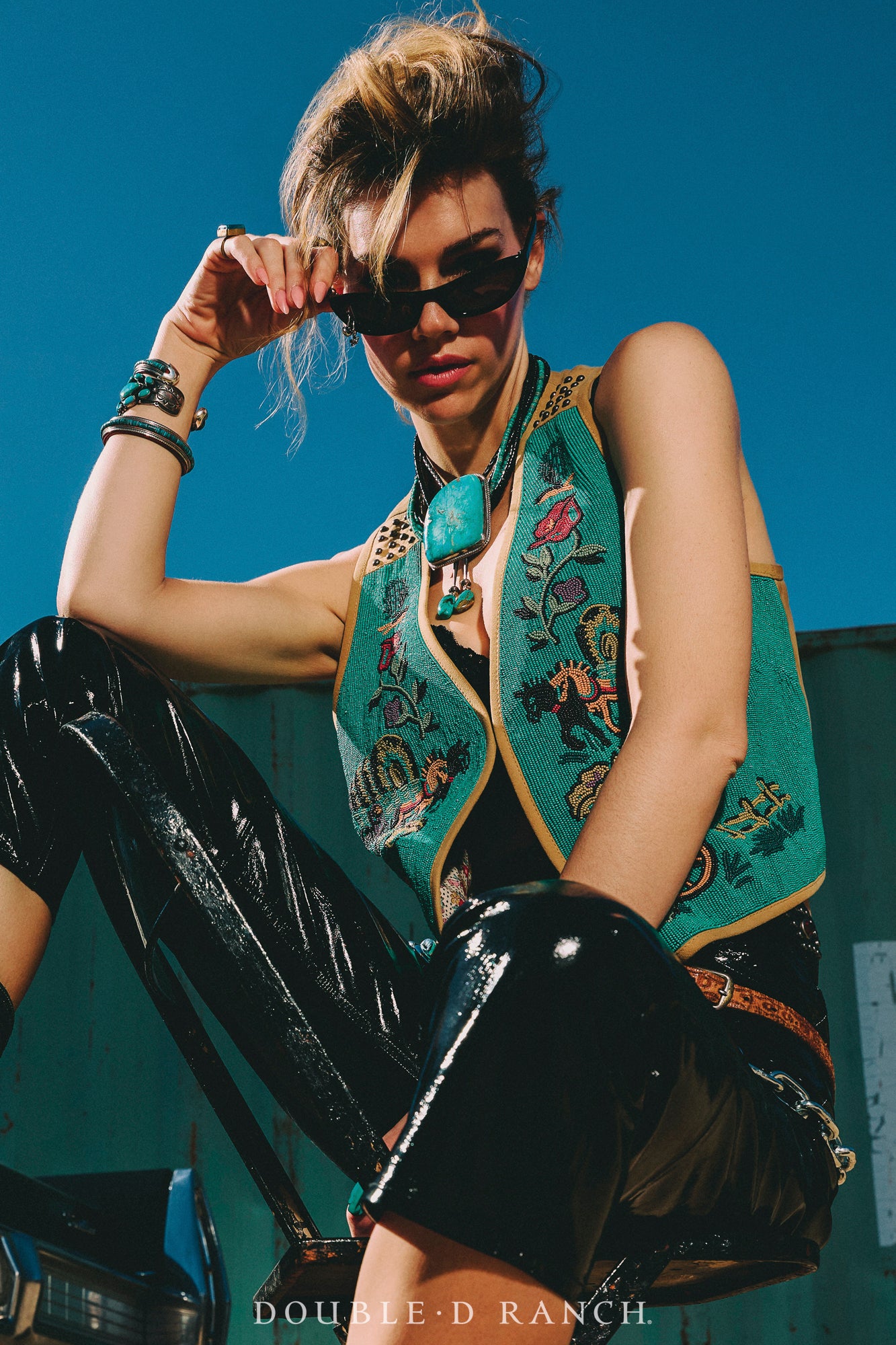 We love this vest as the perfect punctuation piece. It’s a classic straight-line racerback silhouette with a single hook-and-eye closure, and the gorgeous goat suede is heavily beaded with a retro-Western motif in vibrant color choices. The shoulders are accented with what we call “pierced” studding, which gives it just a hint of edge. You can add this beauty to any outfit, and suddenly, it IS the outfit.