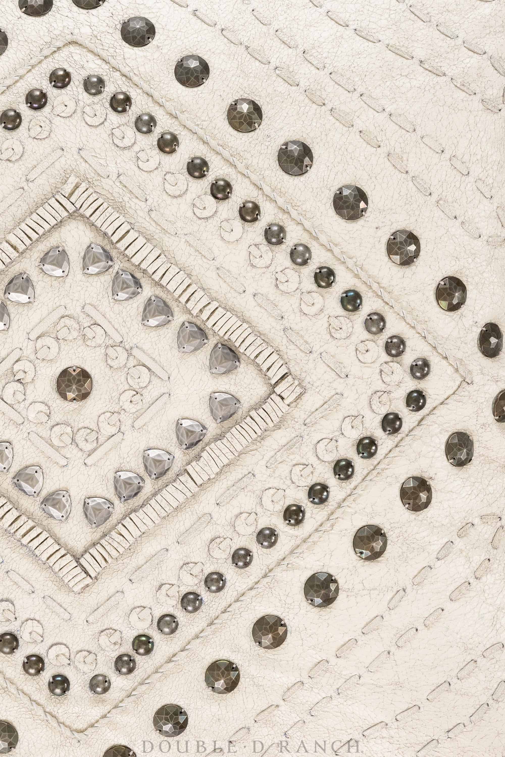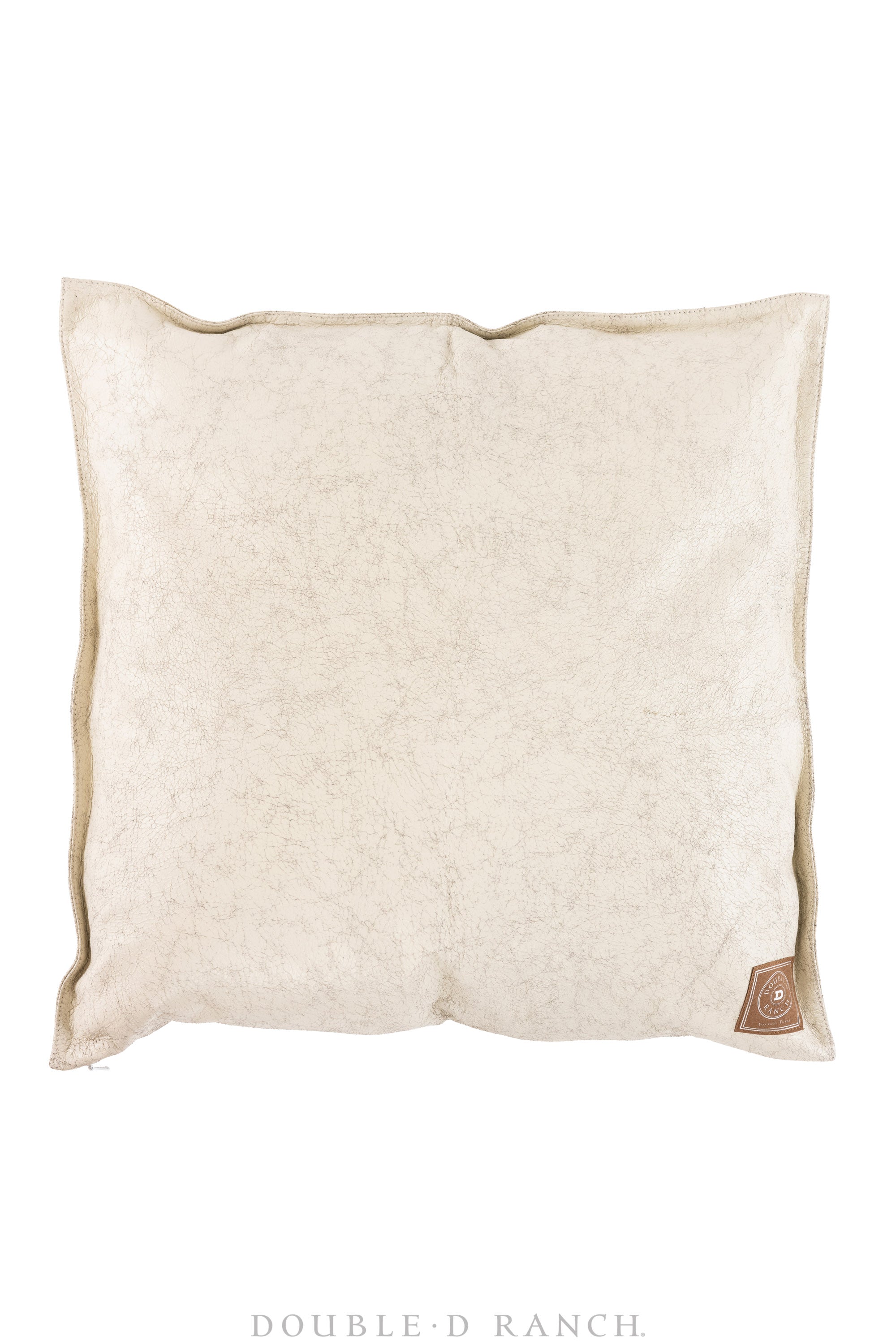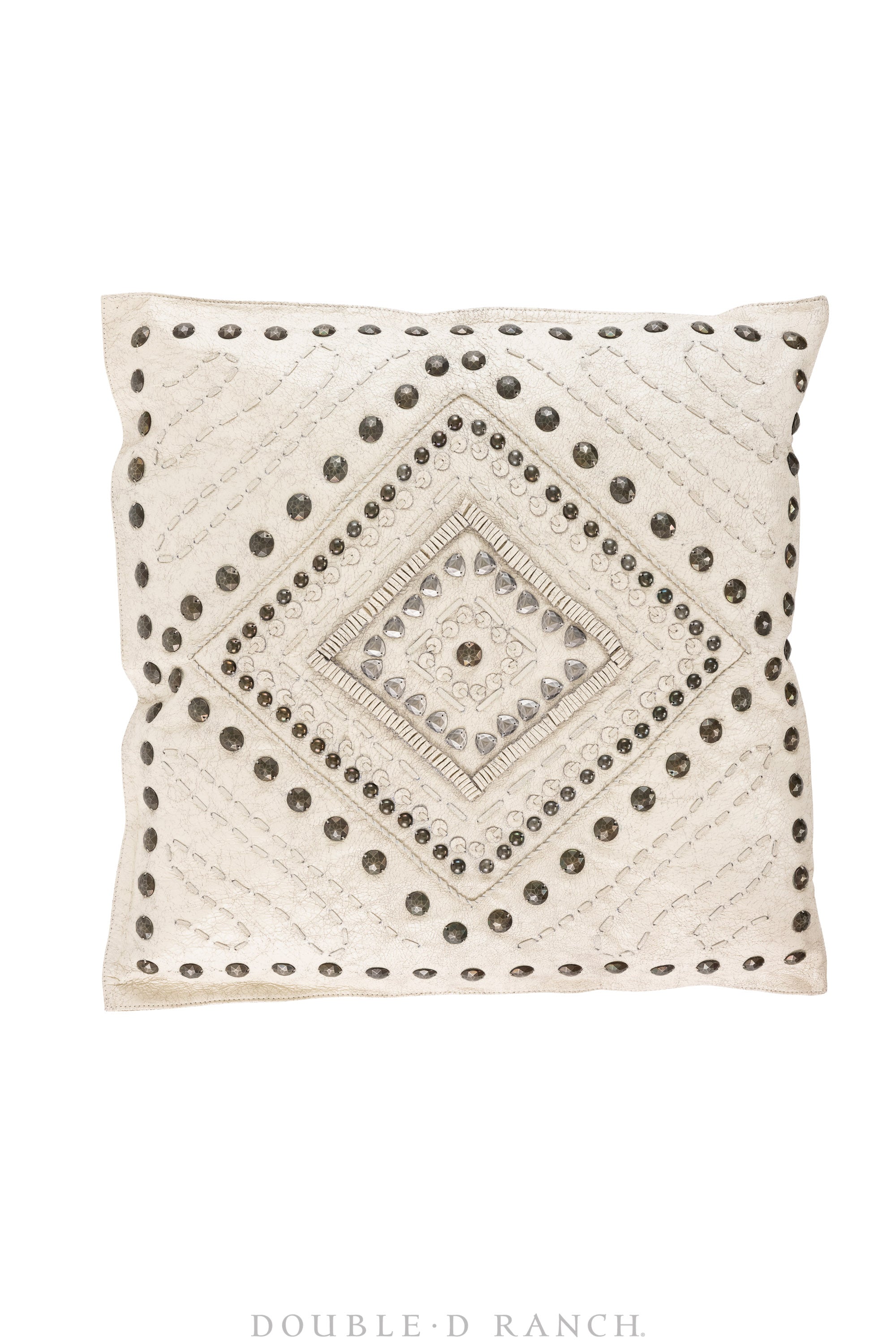 This stunning square pillow is a luxe leather embellished with ornate stitching and geometric studding. Chic and statement.