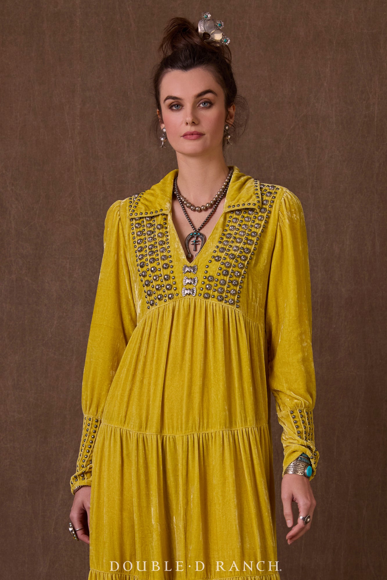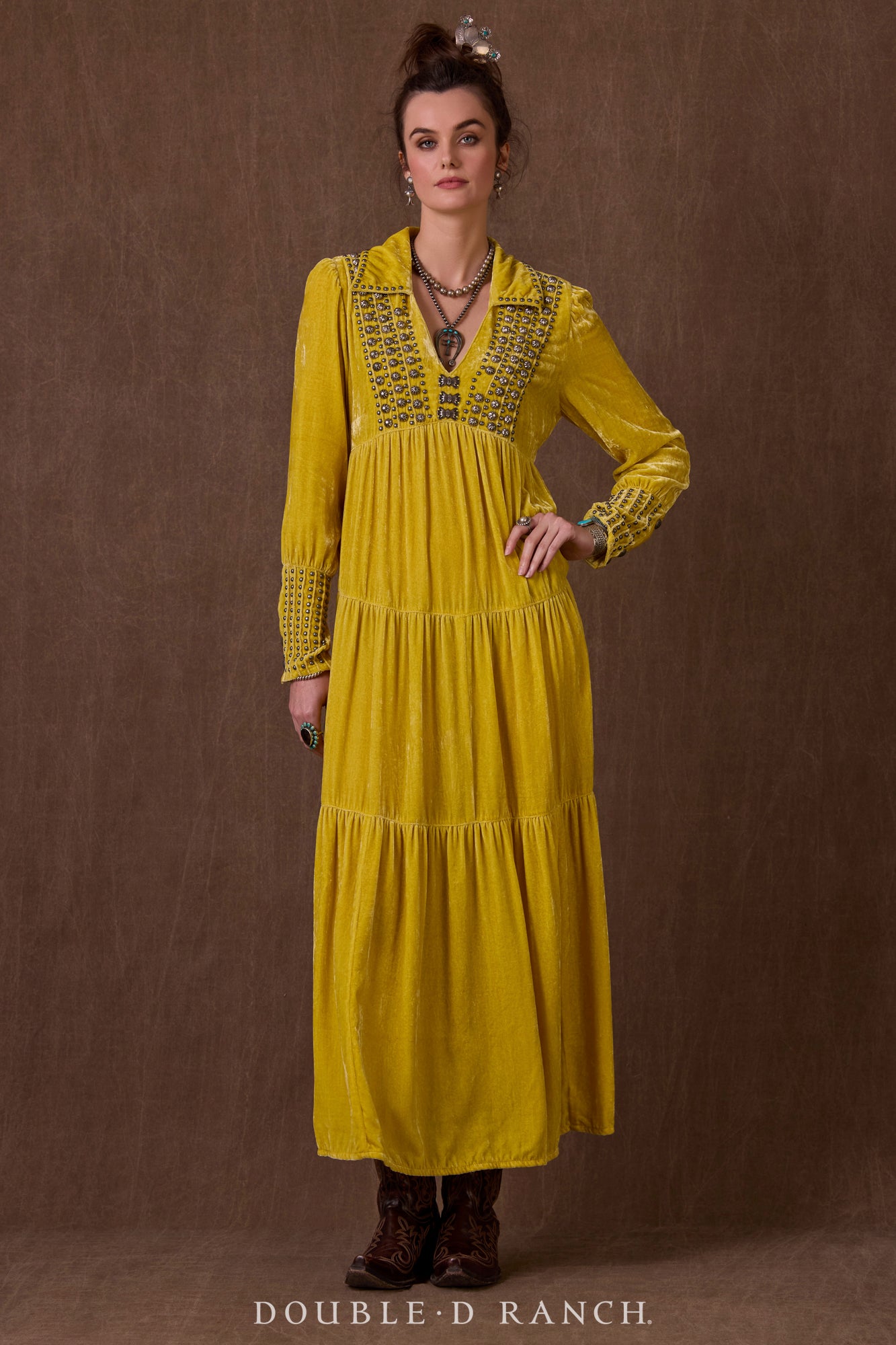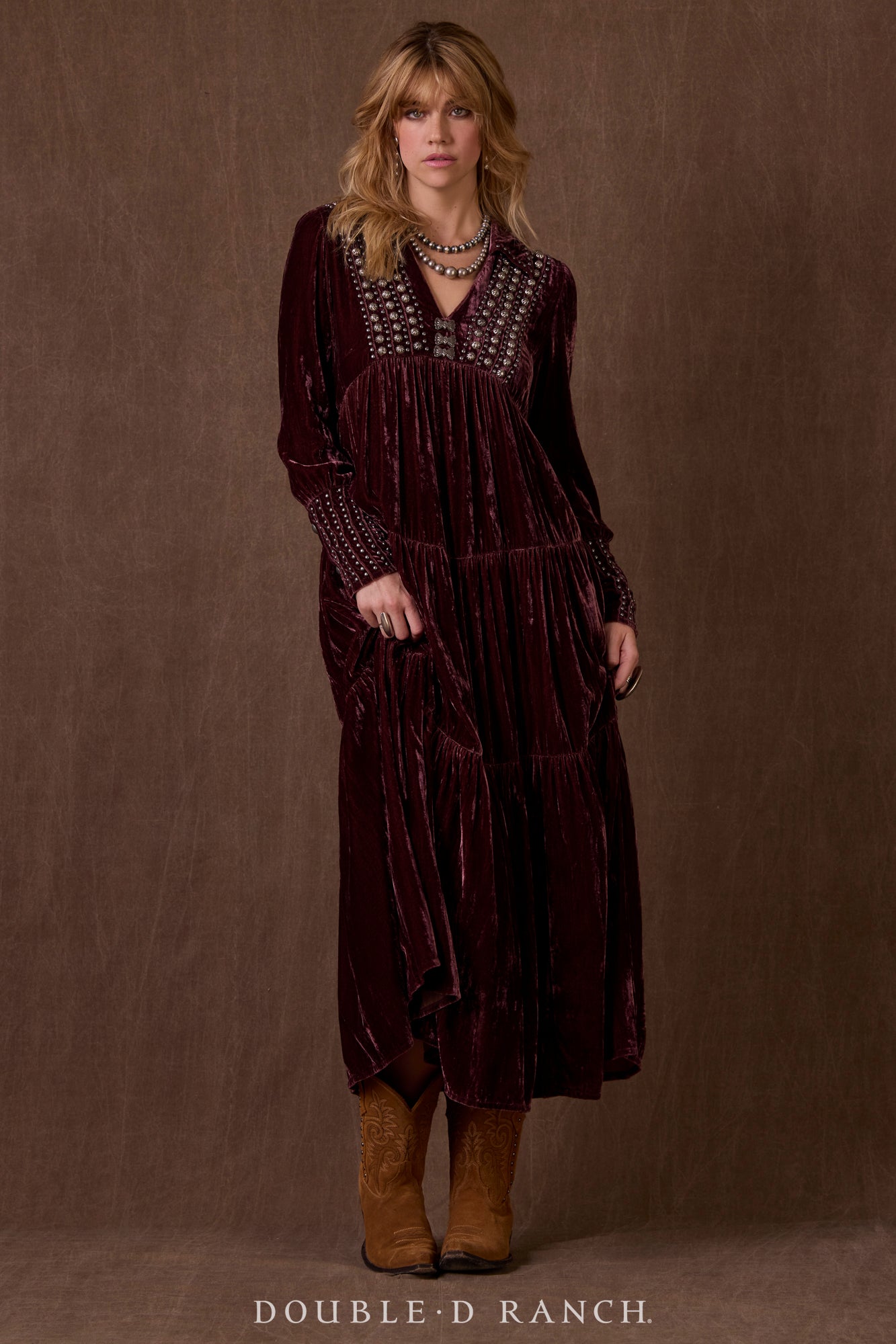 How could we possibly drop a holiday collection without a luxe velvet maxi? This beauty went on wish lists the second it was sneak-peeked! The silhouette is a full-length long sleeve with gathered tiers that give it a flattering fit and flow, and it boasts a demure-but-alluring shallow V-neck that’s finished with a collar for an extra pop of class. It’s embellished with custom concho accents and traditional metal studding that enhance the overall southwestern aesthetic. Obviously, it’s a must – and you might need it in more than one color!