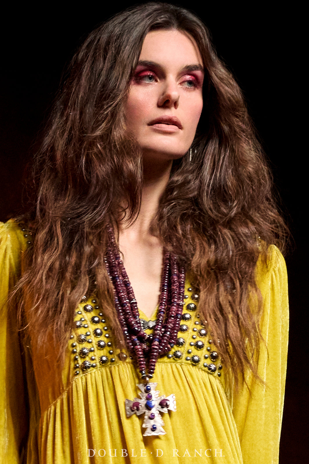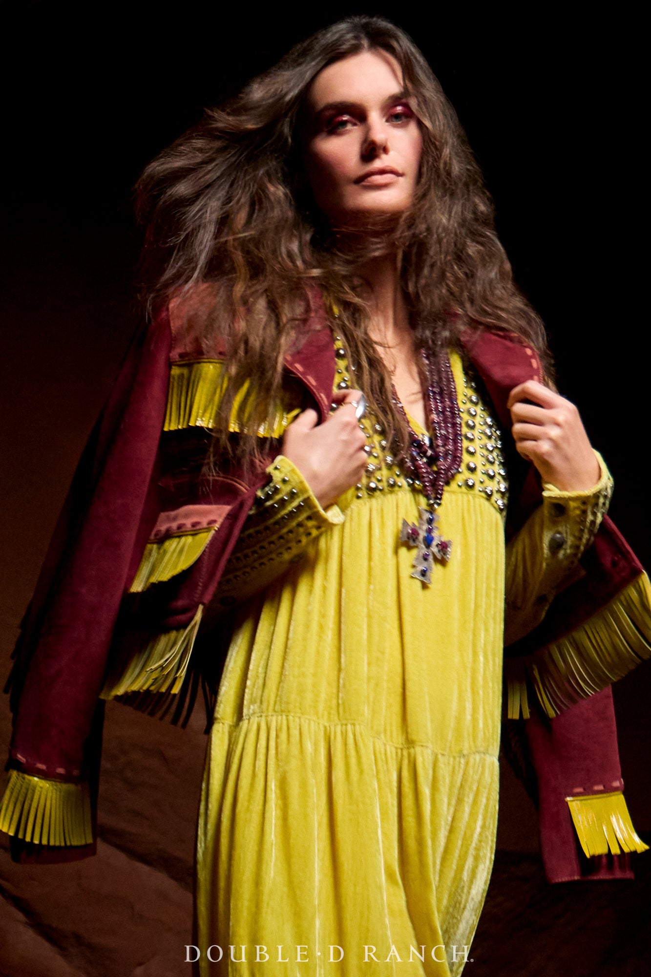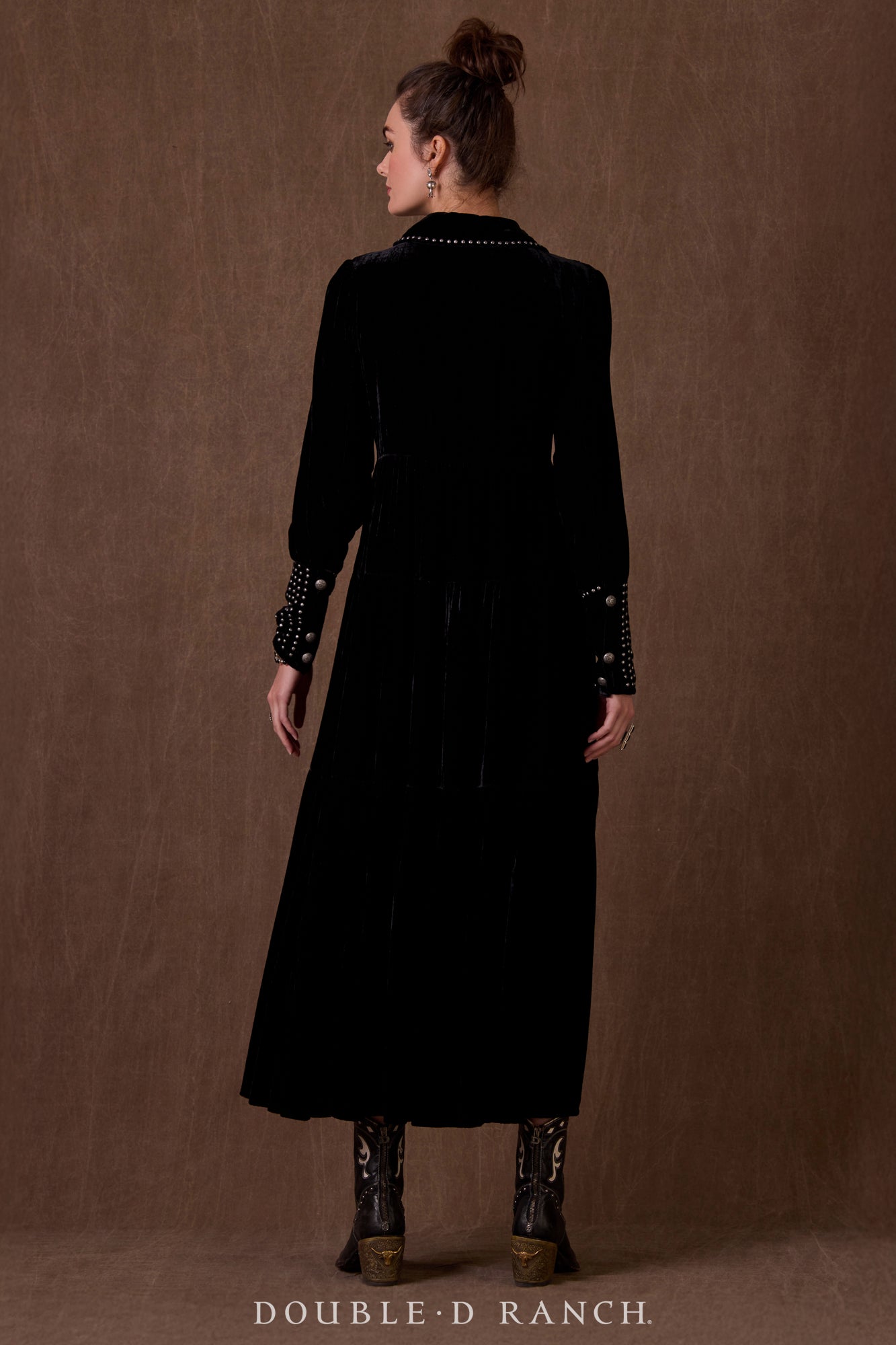 How could we possibly drop a holiday collection without a luxe velvet maxi? This beauty went on wish lists the second it was sneak-peeked! The silhouette is a full-length long sleeve with gathered tiers that give it a flattering fit and flow, and it boasts a demure-but-alluring shallow V-neck that’s finished with a collar for an extra pop of class. It’s embellished with custom concho accents and traditional metal studding that enhance the overall southwestern aesthetic. Obviously, it’s a must – and you might need it in more than one color!