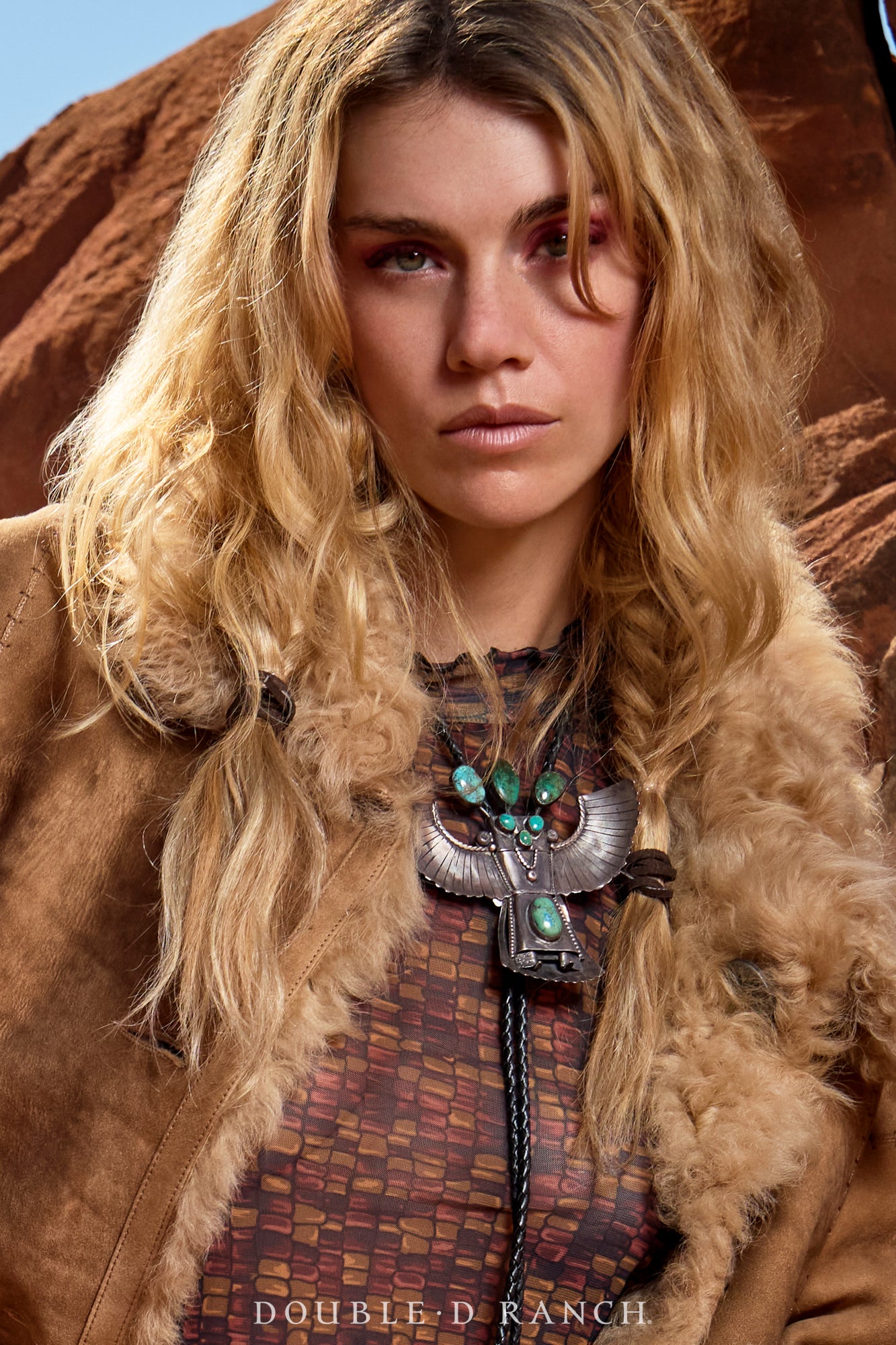 The kachina is important within the Native American culture which is exhibited in this gorgeous vintage bolo. The sterling silver slide depicts a detailed and dimensional kachina adorned with five stones of bright blue turquoise set in simple bezels. Along with sterling silver rope and drop details. What sets this piece apart are the large and rare sterling silver wings added to the slide. The cord is a traditional braided leather tipped with sterling silver aiguillettes. A stunning statement piece for any guy or gal.