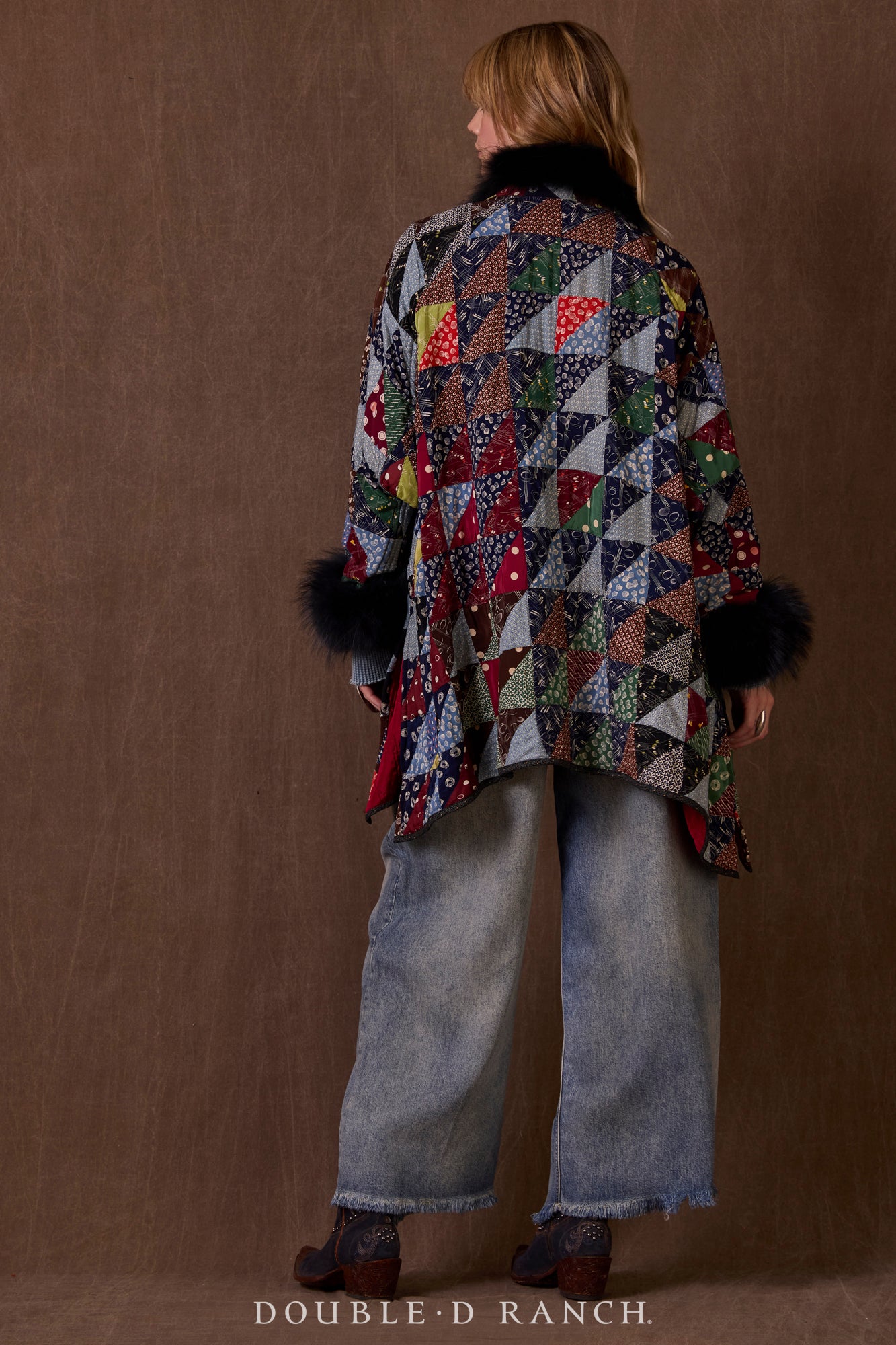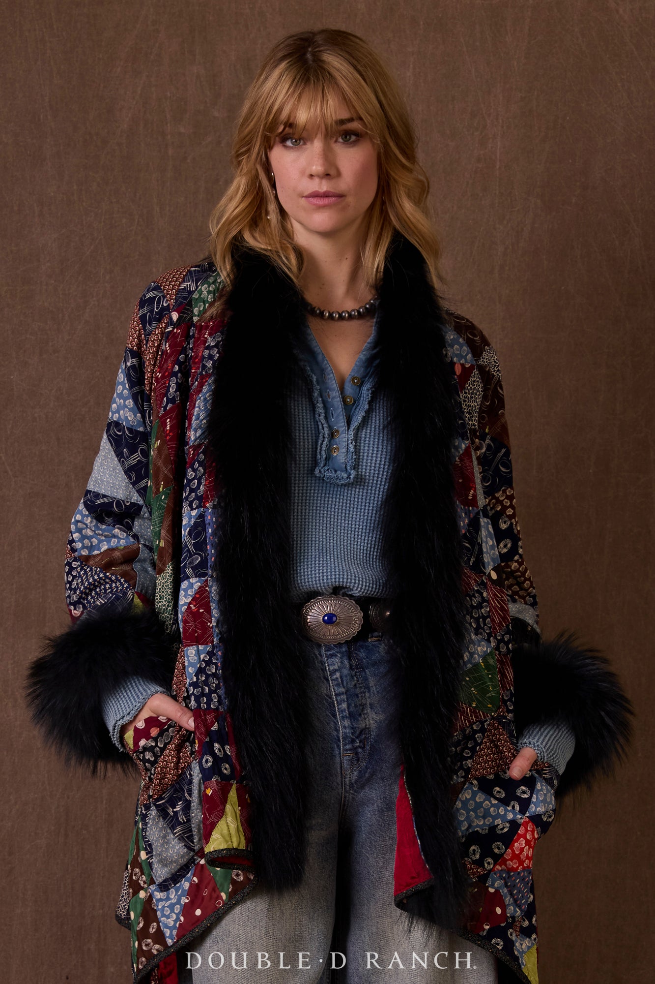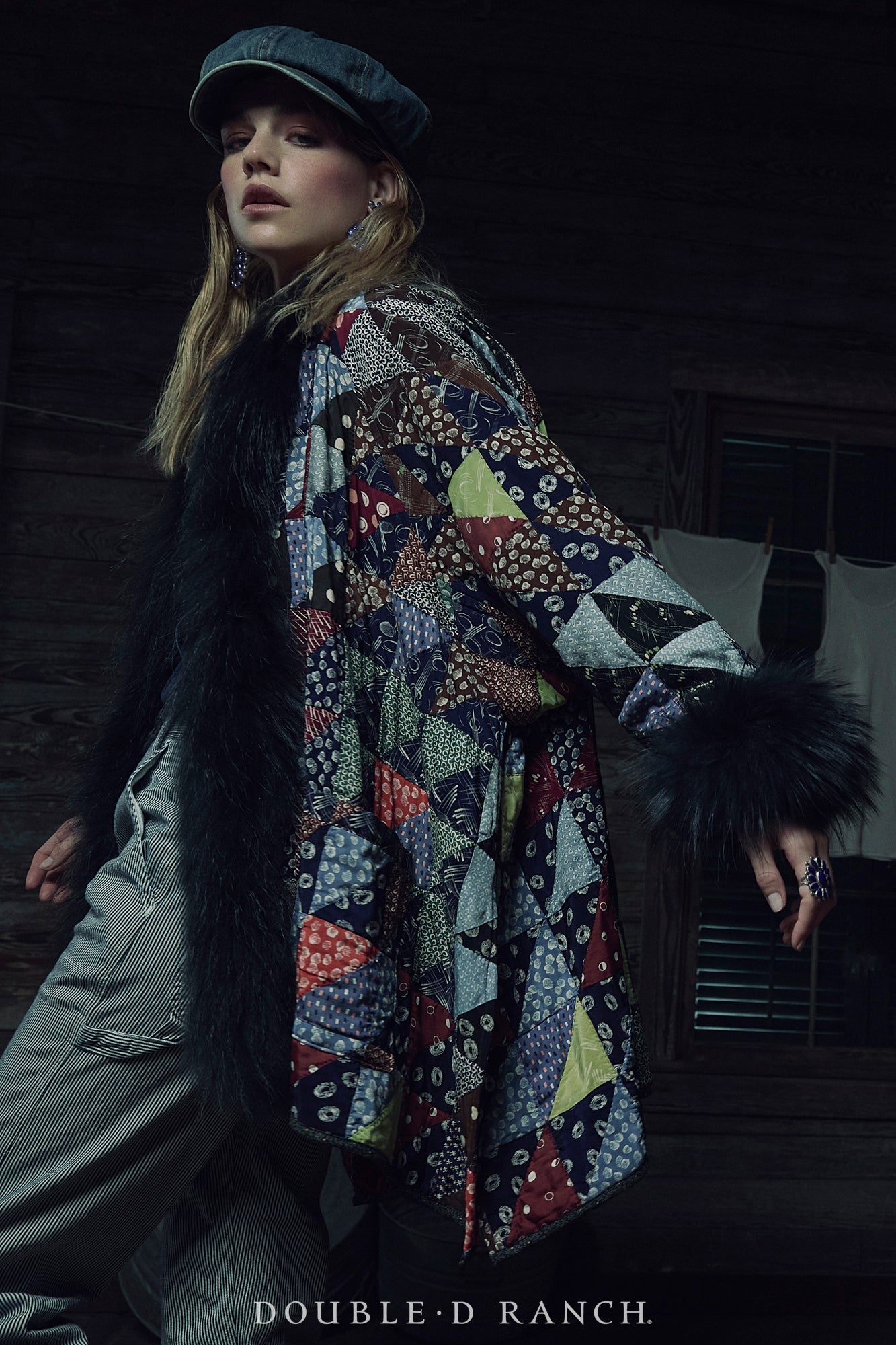We’ve given an authentic vintage quilt new life in this extraordinary one-of-a-kind duster. Through a collaboration with Lady Lancaster, we’ve transformed this colorful quilt – complete with its original knots – into a gorgeous statement coat. We finished it with an exquisite fur collar and cuffs, dyed a deep blue hue to complement this ‘coat of many colors’. Naturally, as the only one in existence, it’s an instant collector and a unique opportunity to own a remarkably rare piece of the Double D story.