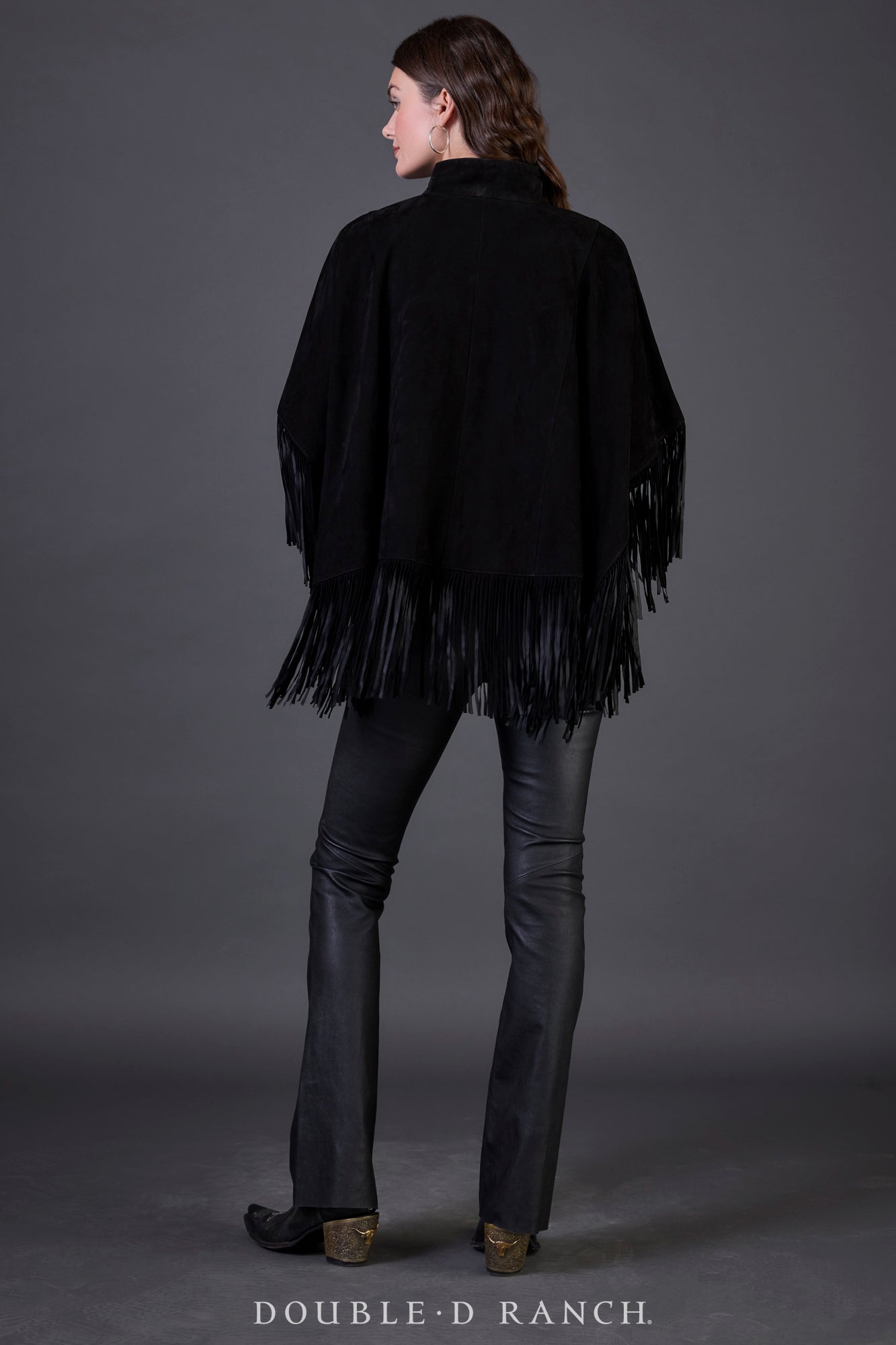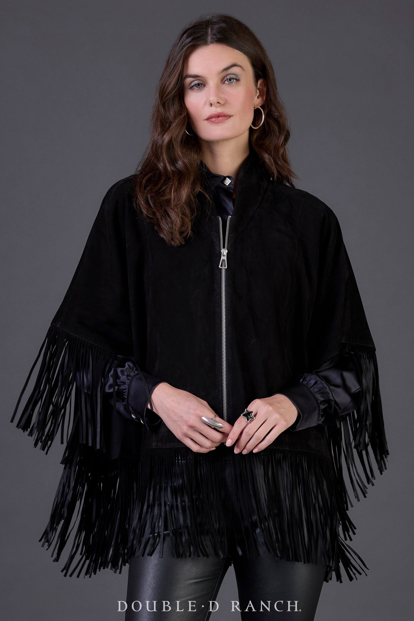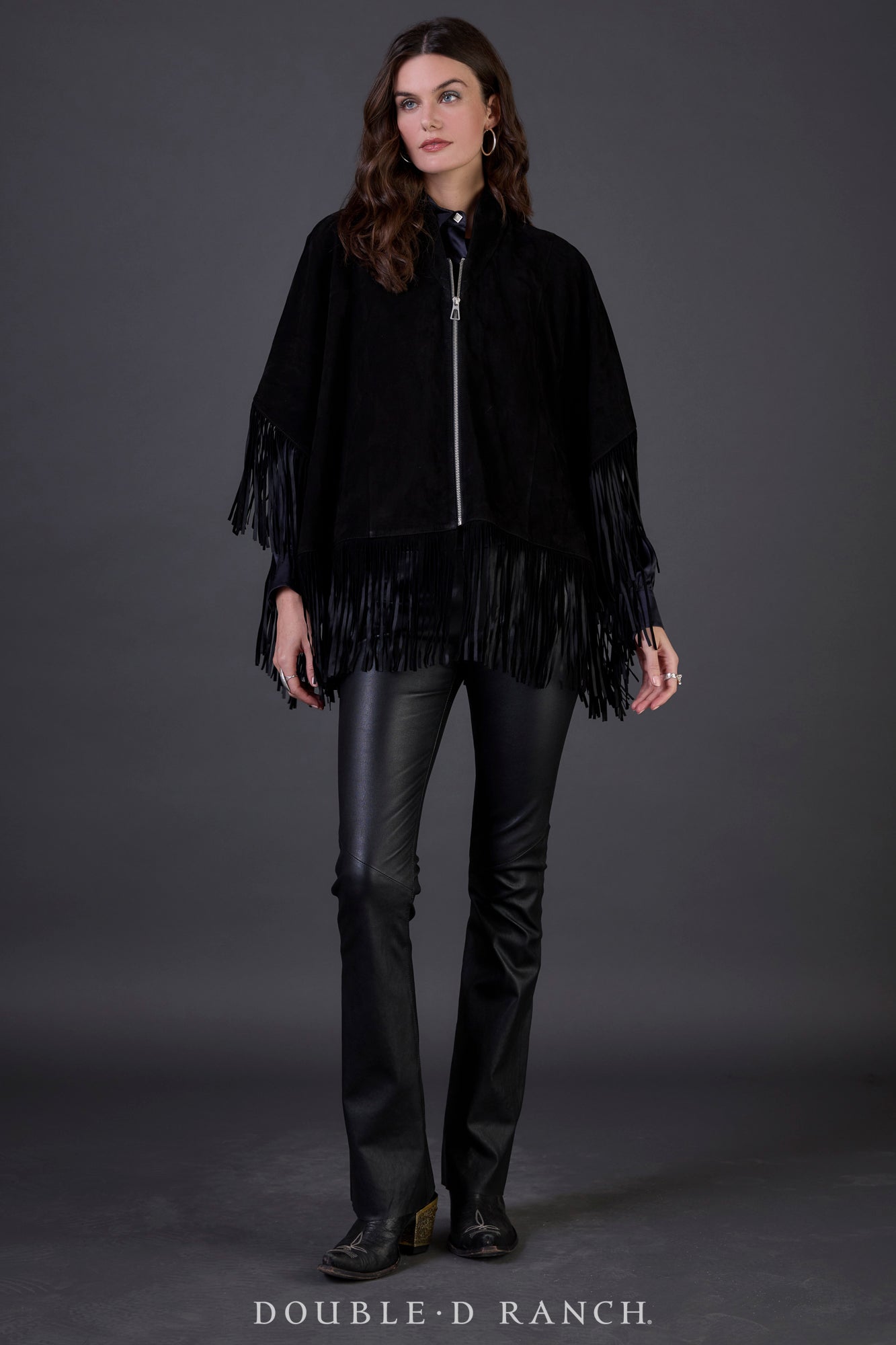 Capes are trending strong right now as an upscale alternative to your classic jacket or shawl. The effortless silhouette makes it easy to wear over almost anything, and the breezy flow of the fit allows it to serve as elegant outerwear when the temps don’t call for a full-on jacket. This luxurious lamb suede iteration boasts a sleek, squared silhouette with a full front zipper, and it’s framed in 306 degrees of long tonal fringe for a Western vibe and eye-catching movement.