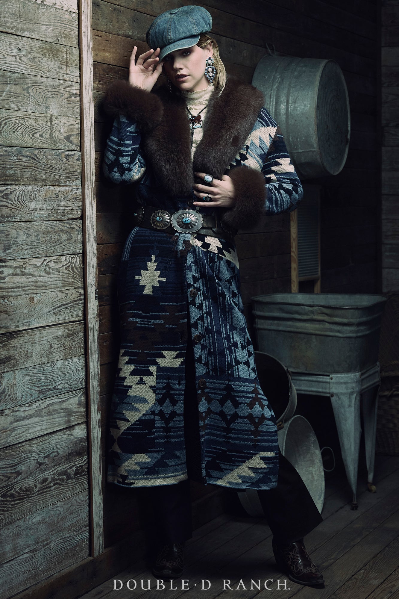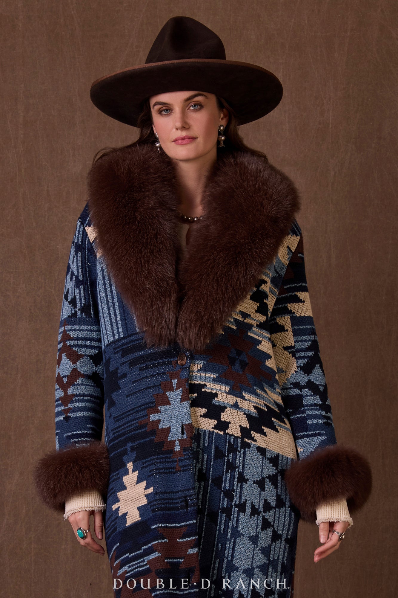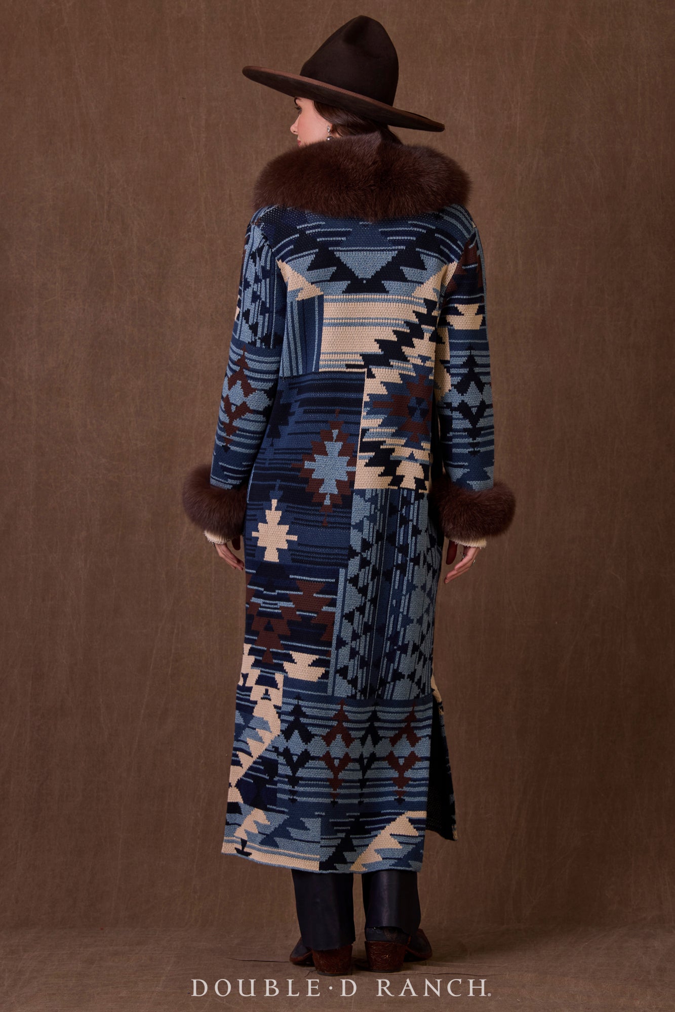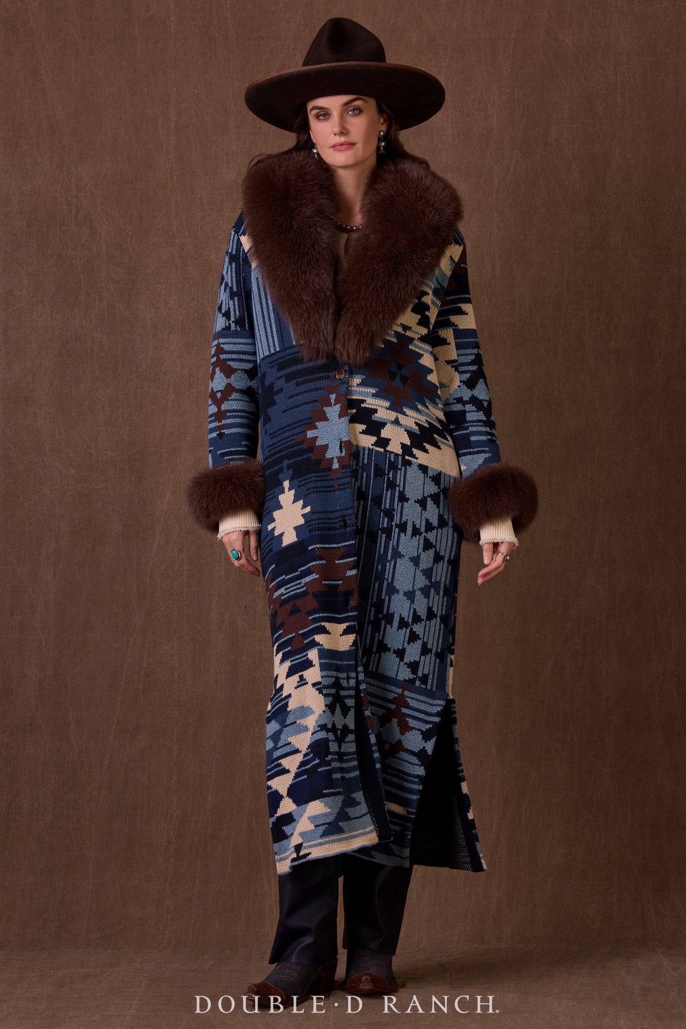 This statement duster brings together beautiful blues and browns in bold blanket patterns, quilted together in a way that adds a unique level of visual interest. The long, luxurious knit jacket is finished with fabulous full-volume fur that elevates it to a whole new level.