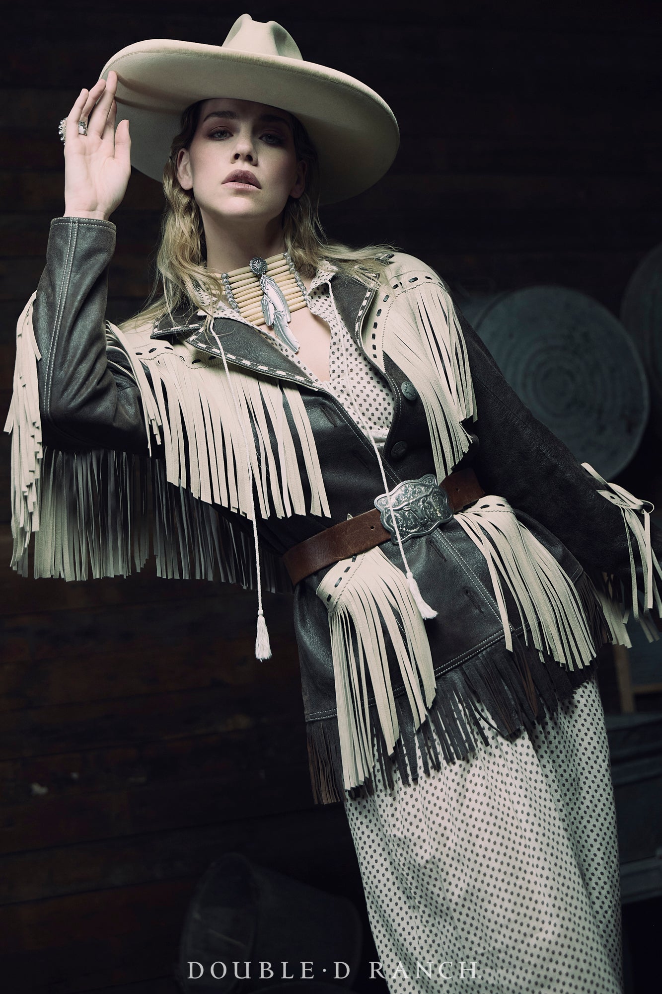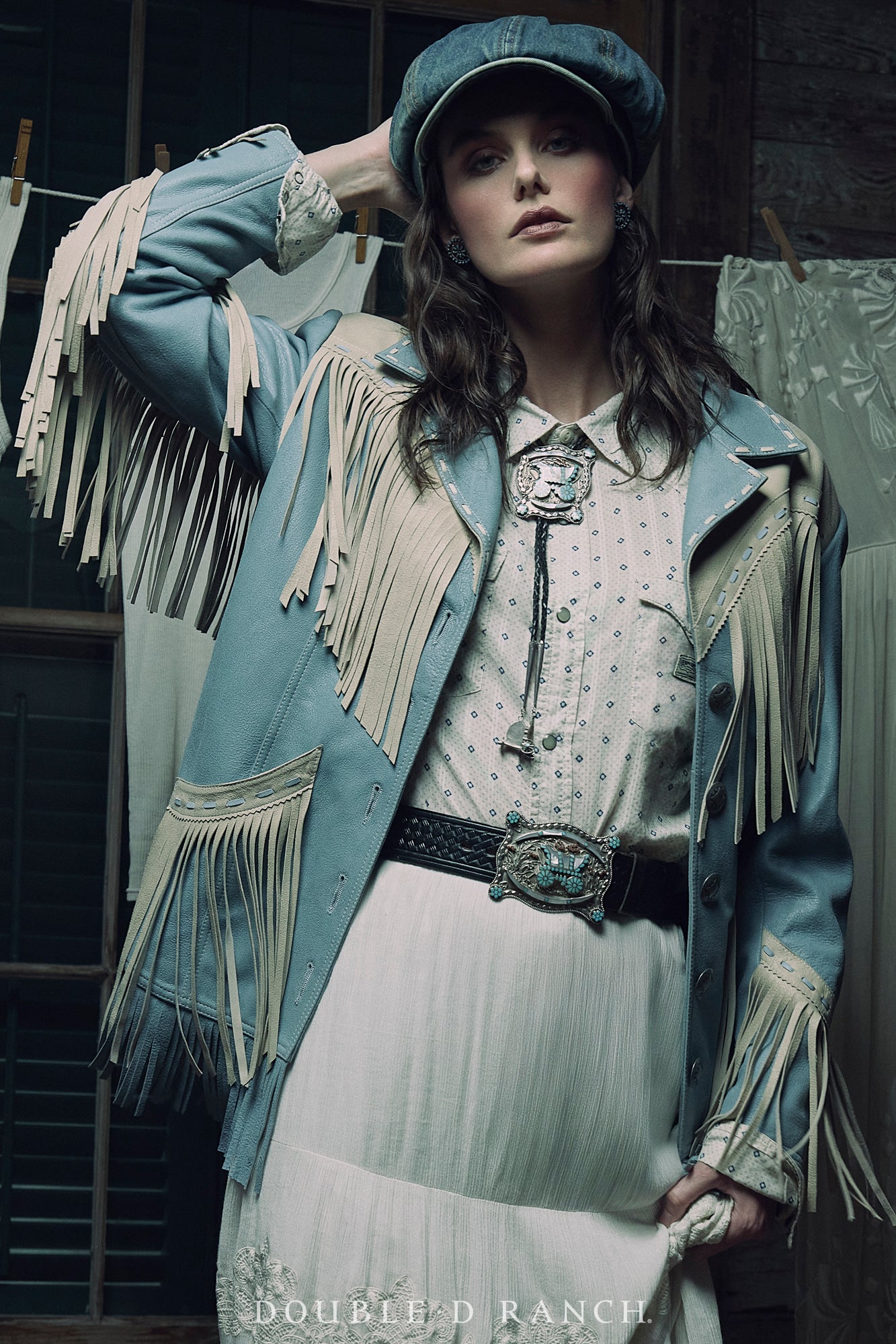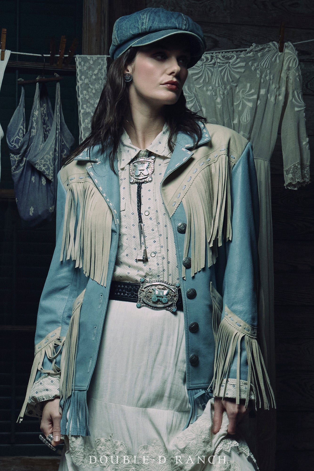 We are SO drawn to this dreamy jacket! The supple sheep suede is constructed to make the most of the complementing contrasts of the two different colors. The relaxed-shoulder silhouette hits just below the hip and is heavily adorned with long, lovely fringe at the yoke, the pockets, the sleeves, and even the hem. It’s finished with contrast leather lacing and custom concho buttons. Talk about a timeless statement piece!