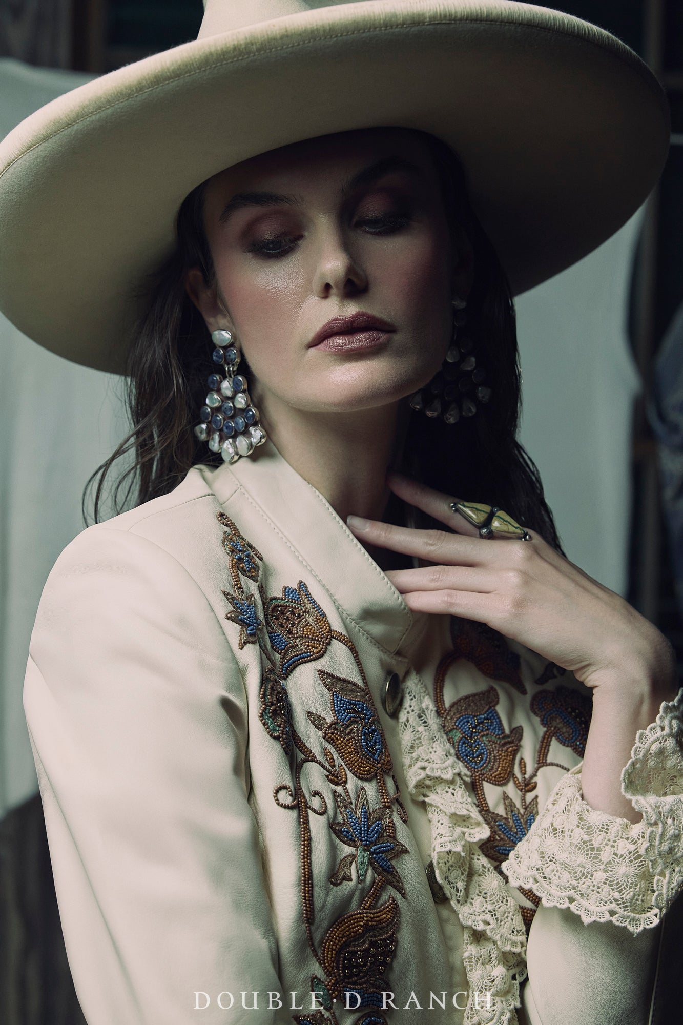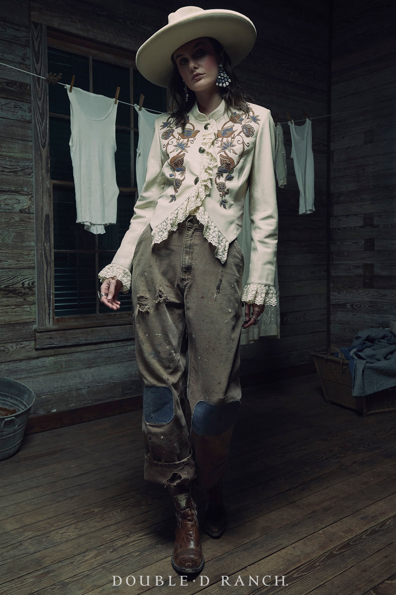 The trunks in Granny’s Wash House held generations' worth of garments, including wedding ensembles. We incorporated some of the elements that we loved about those pieces – like lace frills, intricate embroidery, and formal-feeling silhouettes – into this exquisite jacket. Crafted in a luxe ‘bone’ sheepskin, this chic cropped jacket has an upscale appeal with a feminine feel.
