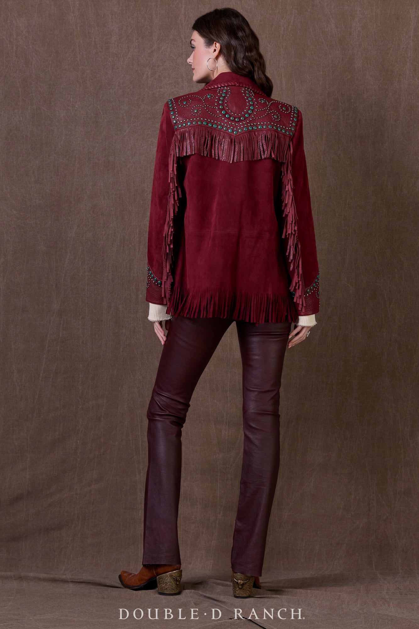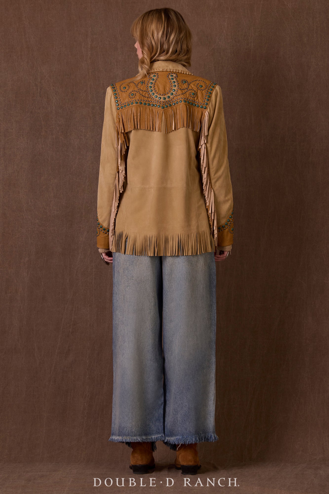 Talk about a wardrobe win! This stunning statement jacket is an irresistible sheep suede accented with a tonal contrast yoke and cuff, embellished with ornate metallic and teal studding that add a scroll details and of course, our (and every cowgirl’s) favorite – a horseshoe! It’s finished with some tonal fringe to complement the overall aesthetic and give it some fun movement. It’s neutral enough to wear just about everywhere, but statement enough it’ll become your signature.