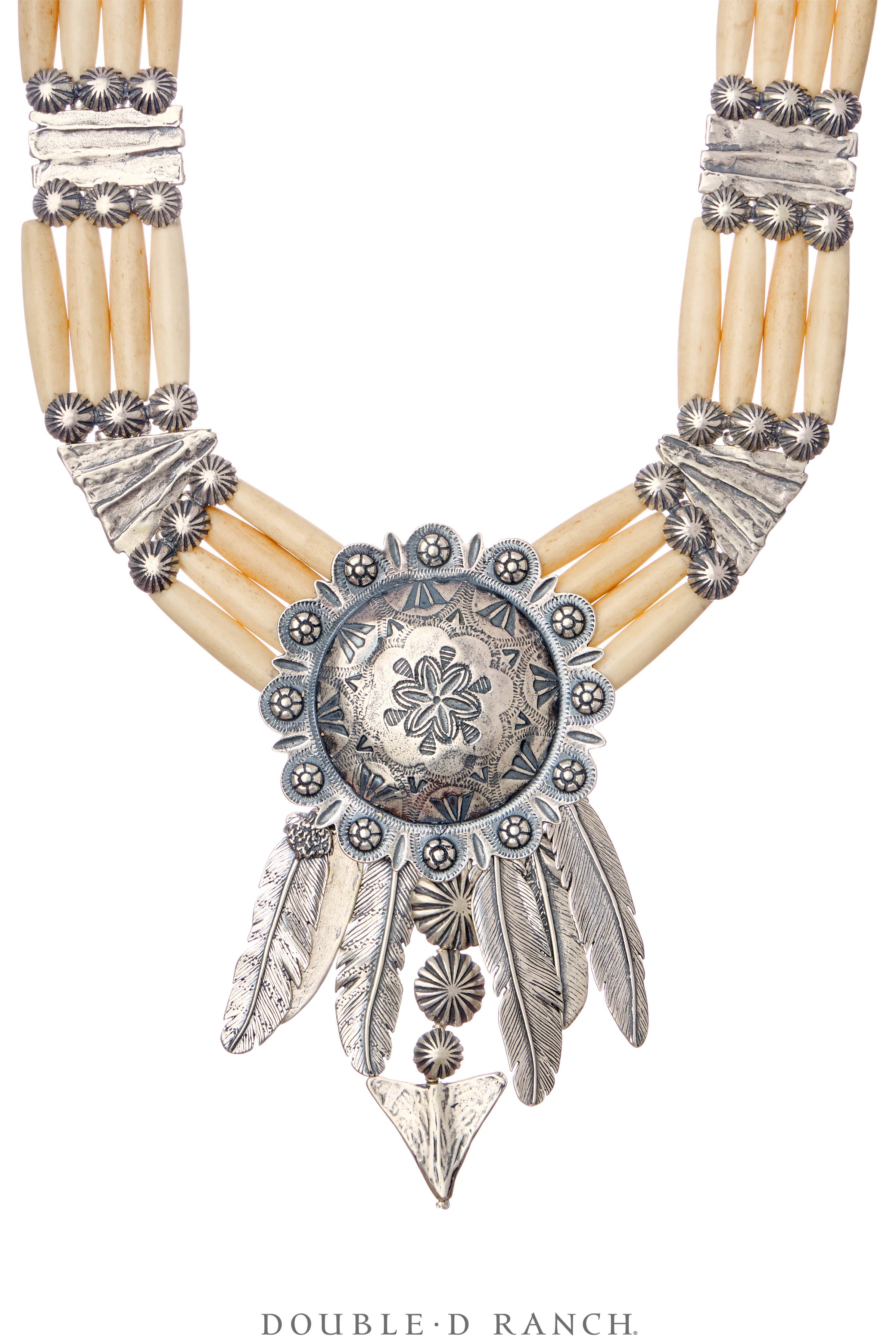 The Nokomis is one of the most beloved and coveted silhouettes, crafted from strands of hairpipe hinged with silver spacers and fluted conchos, finished with an ornate concho centerpiece and intricate silver feather dangles.