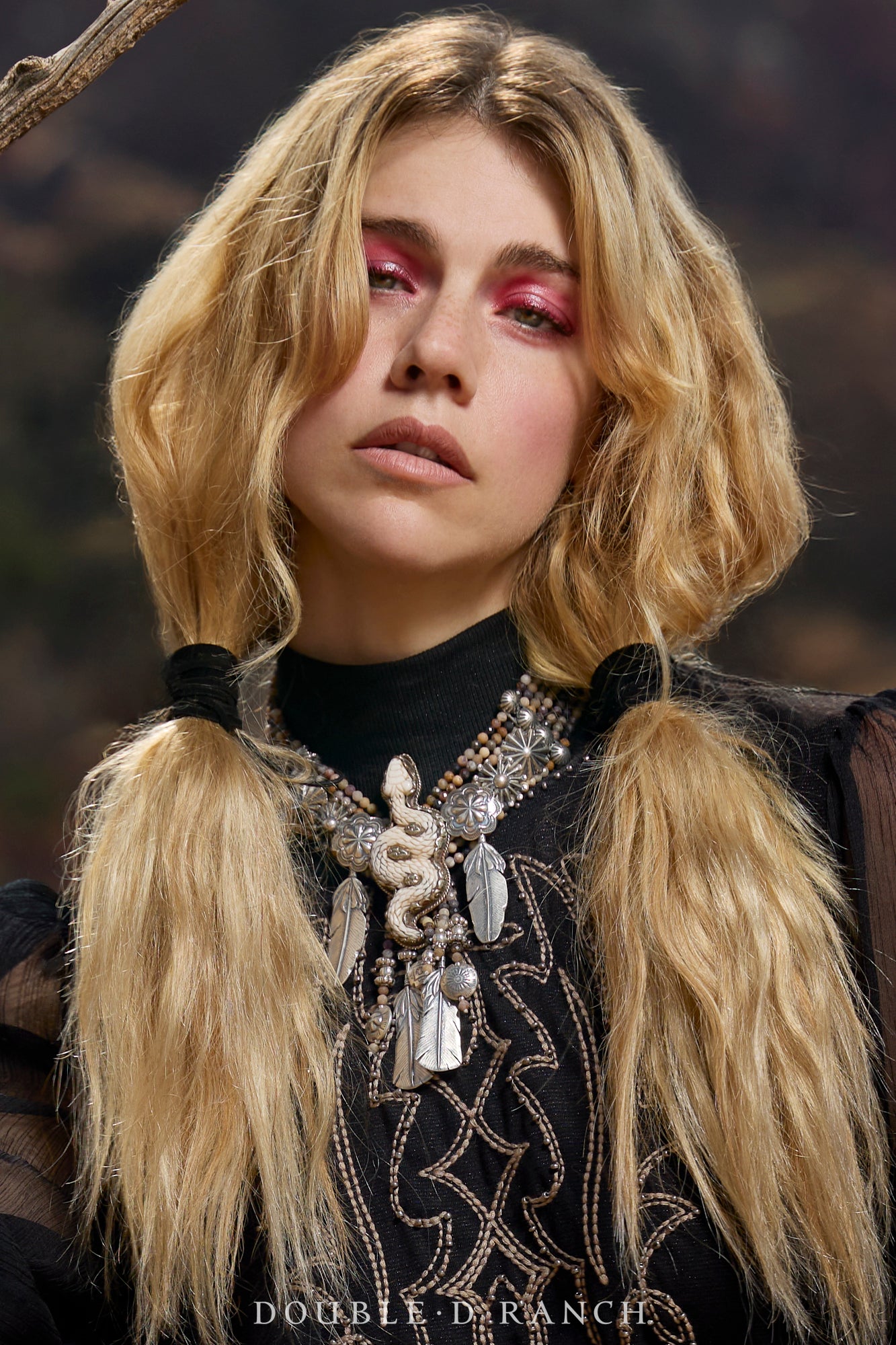 If you’re fairly well-versed in Southwestern jewelry, the legendary label needs no introduction. It’s long been known for its striking statement pieces (particularly chokers) crafted from and inspired by the archaeological digs of Doug Hancock, interpreted into wearable works of art and marketed by his wife Mary for decades. Well, we’re beyond thrilled to announce that the Mummy’s Bundle line is now a part of Double D Ranch, created from the original casts and by the same macrame artisan as the previously revered pieces. This alluring Abrielle necklace is a multi-strand choker crafted from strands of bumblebee jasper beads accented with silver conchos, and finished with a focal point of a bone snake shield complemented by bead-and-feather dangles.
