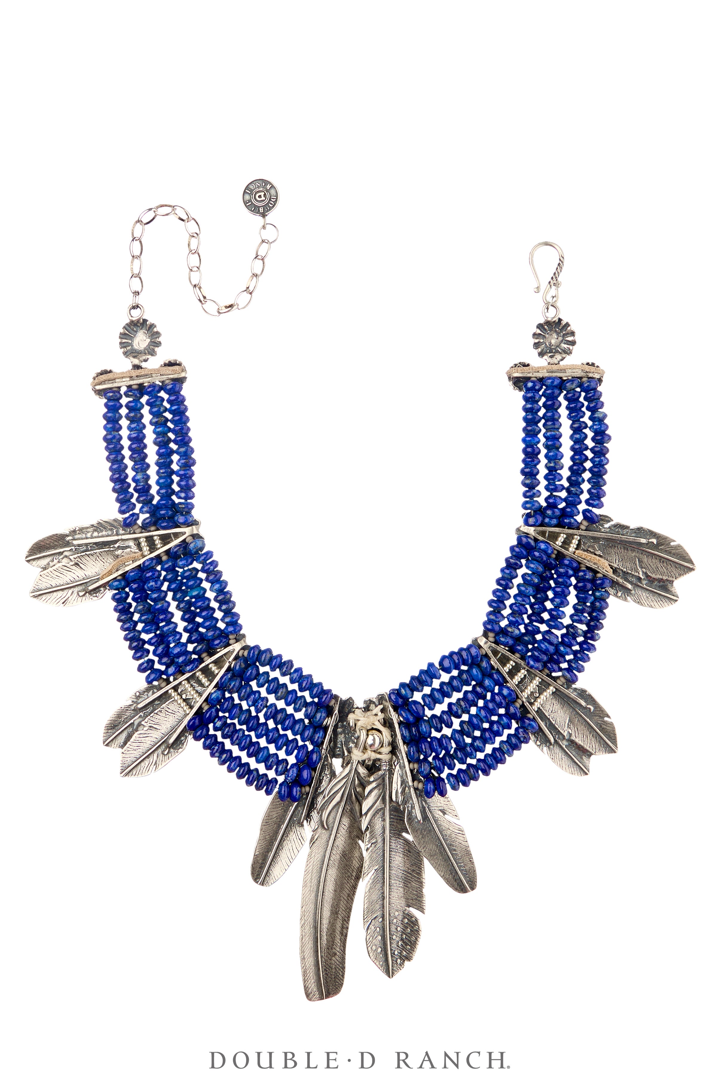 This stunning statement necklace is a 6-strand collar silhouette, crafted from beautiful blue lapis lazuli beads, accented with custom cast conchos and intricate sterling silver feather dangles.