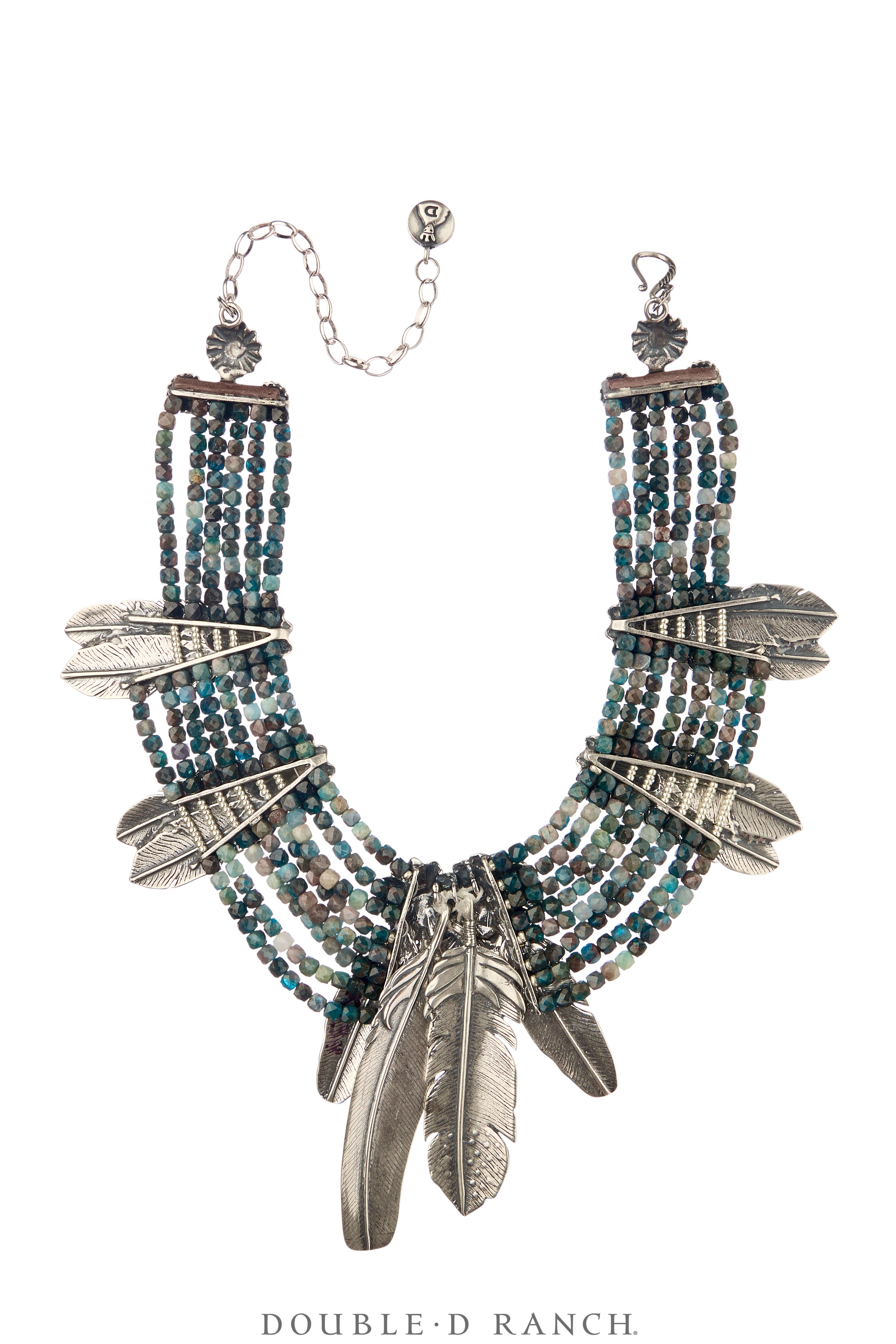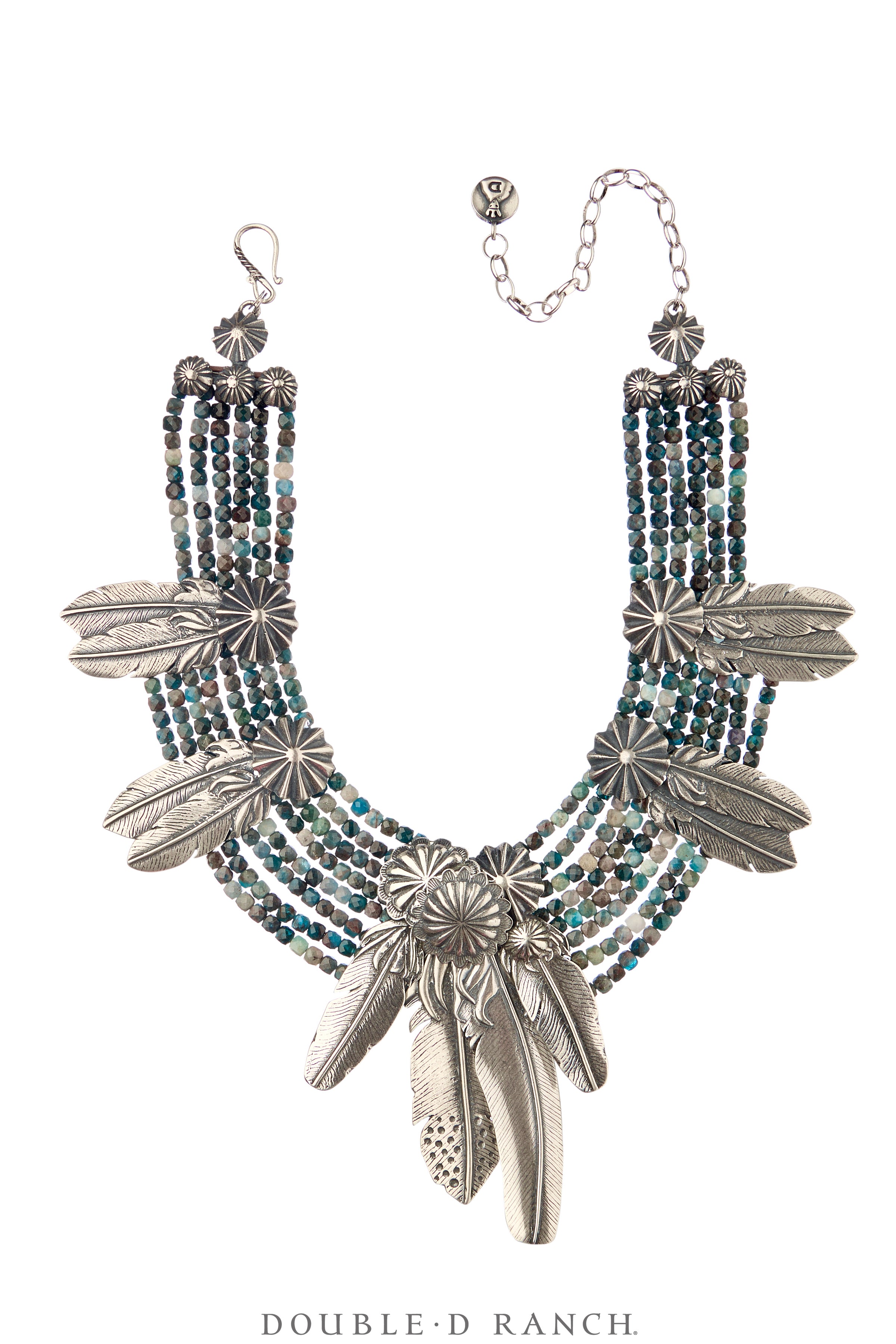 This stunning statement necklace is an 8-strand collar silhouette, crafted in a gorgeous arrangement of faceted blue apatite beads, accented with custom cast conchos and intricate sterling silver feather dangles.