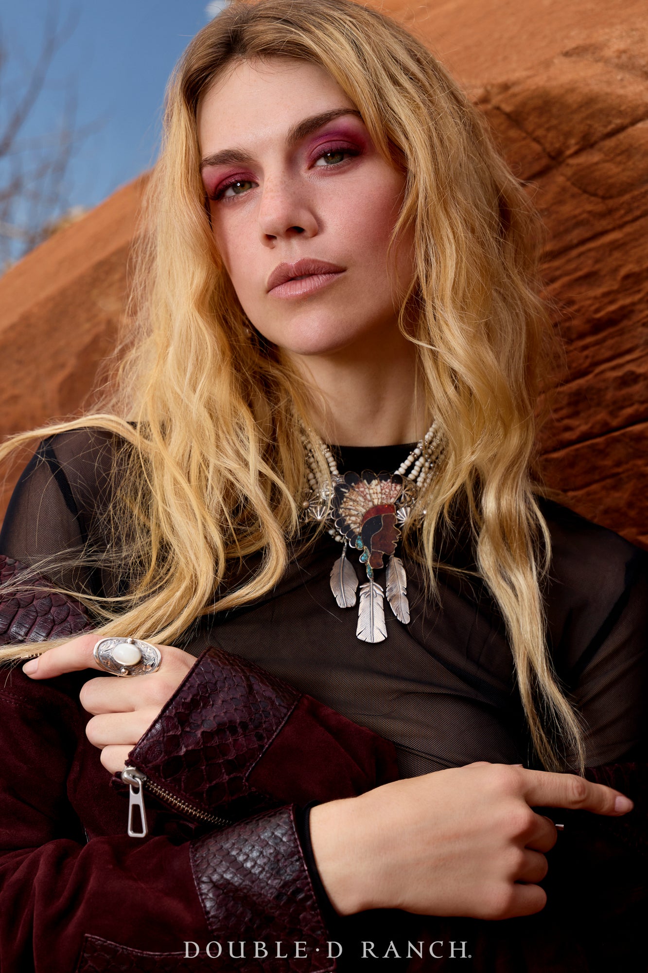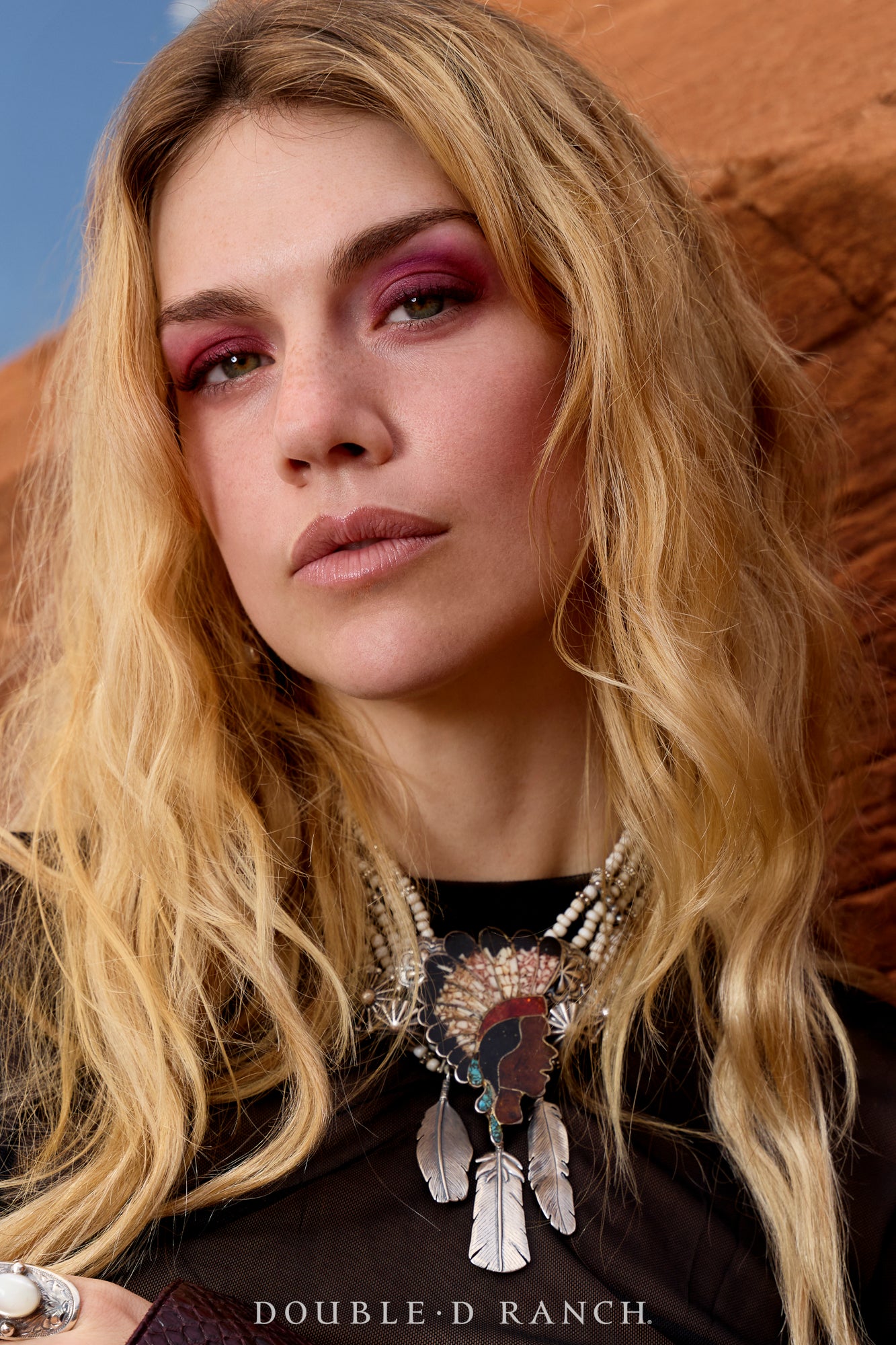 This remarkable statement piece is a stunning seven-strand collar necklace, crafted in ivory Maasai beads with sterling silver spacer accents, finished with a focal point of an exquisite inlay pendant of a chief in profile, complemented by sterling silver conchos and feather dangles.