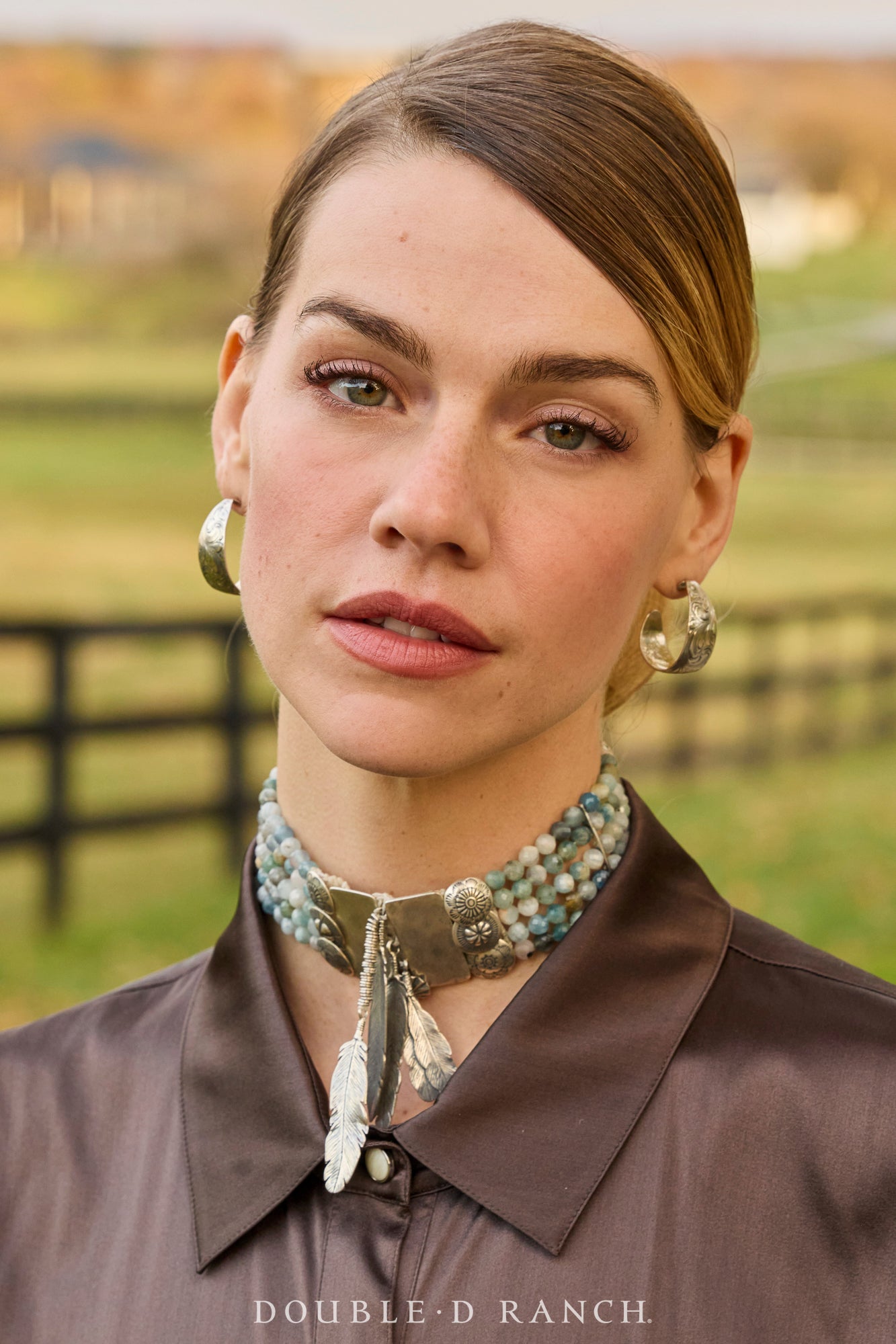 This absolutely exquisite Isabella necklace is chic statement choker, crafted from 5 strands of aquamarine beads, adorned with custom concho charms, sleek silver slabs, and an arrangement of sterling silver feather dangles.