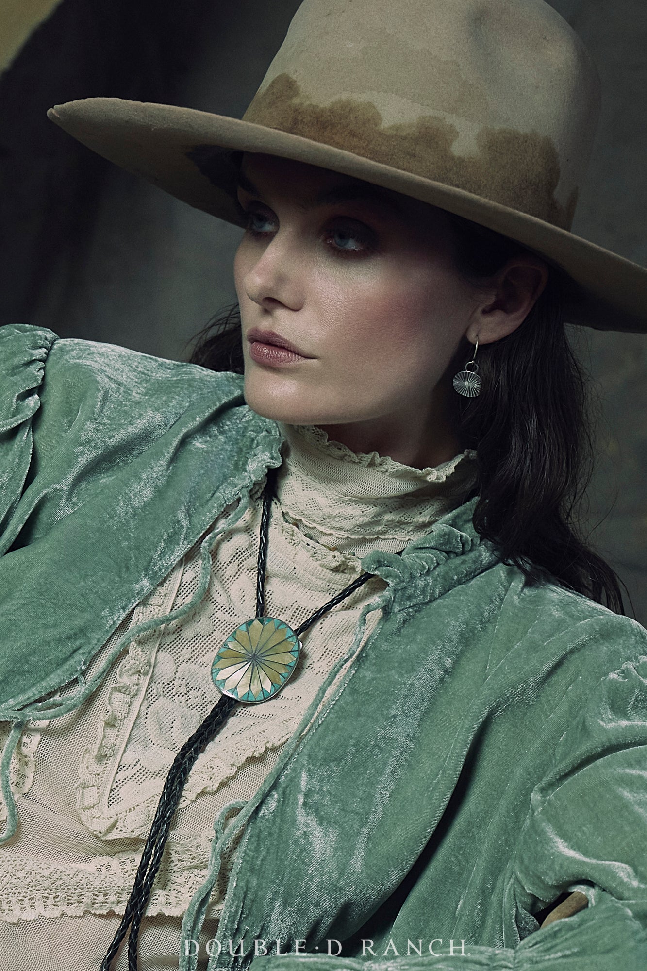 The bolo slide is set on a traditional braided leather cord tipped with sterling silver aiguillettes.