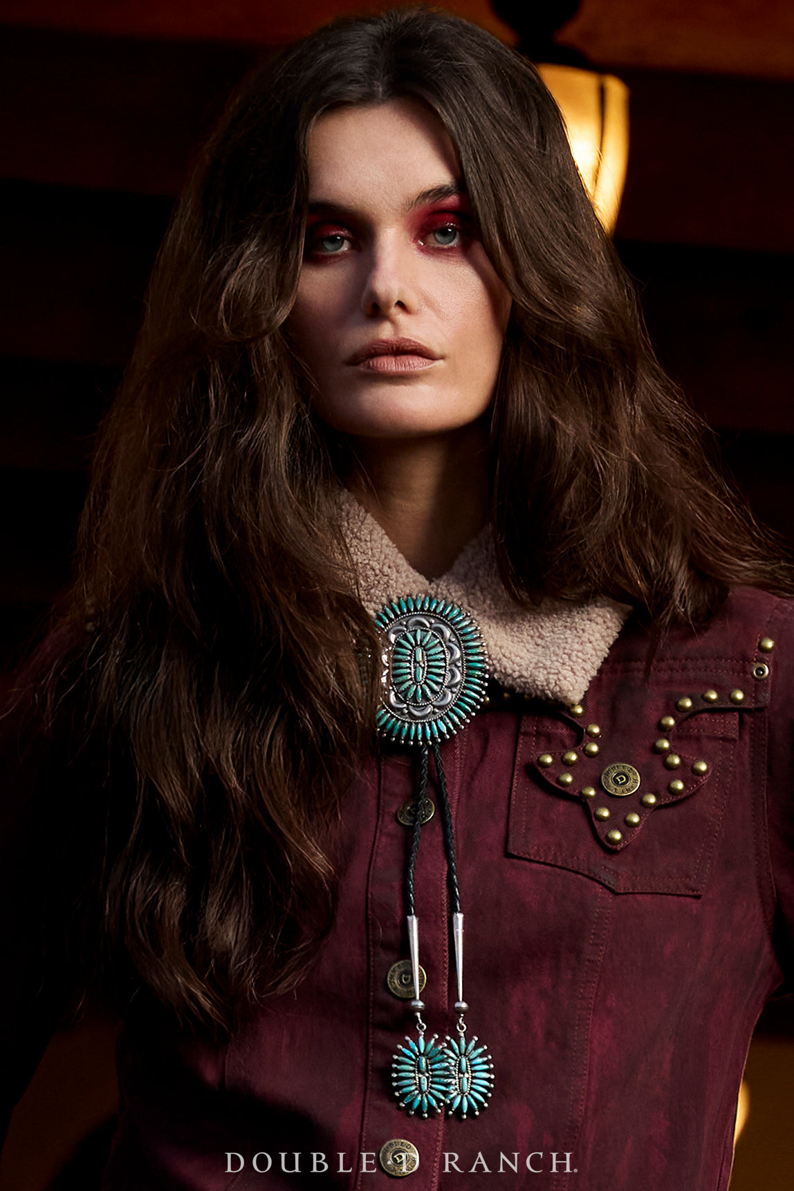 We are a sucker for a good bolo tie and this one doesn’t disappoint. The bolo itself is a large cluster full of intricate details of needlepoint turquoise stones, sterling silver drops, twist wire, and half moons. It is placed on a traditional black braided cord with auguilettes and matching tiny dangling turquoise clusters. Mesmerizing details, crafted by Francis M. Begay, truly a piece that you will want to add to your collection.