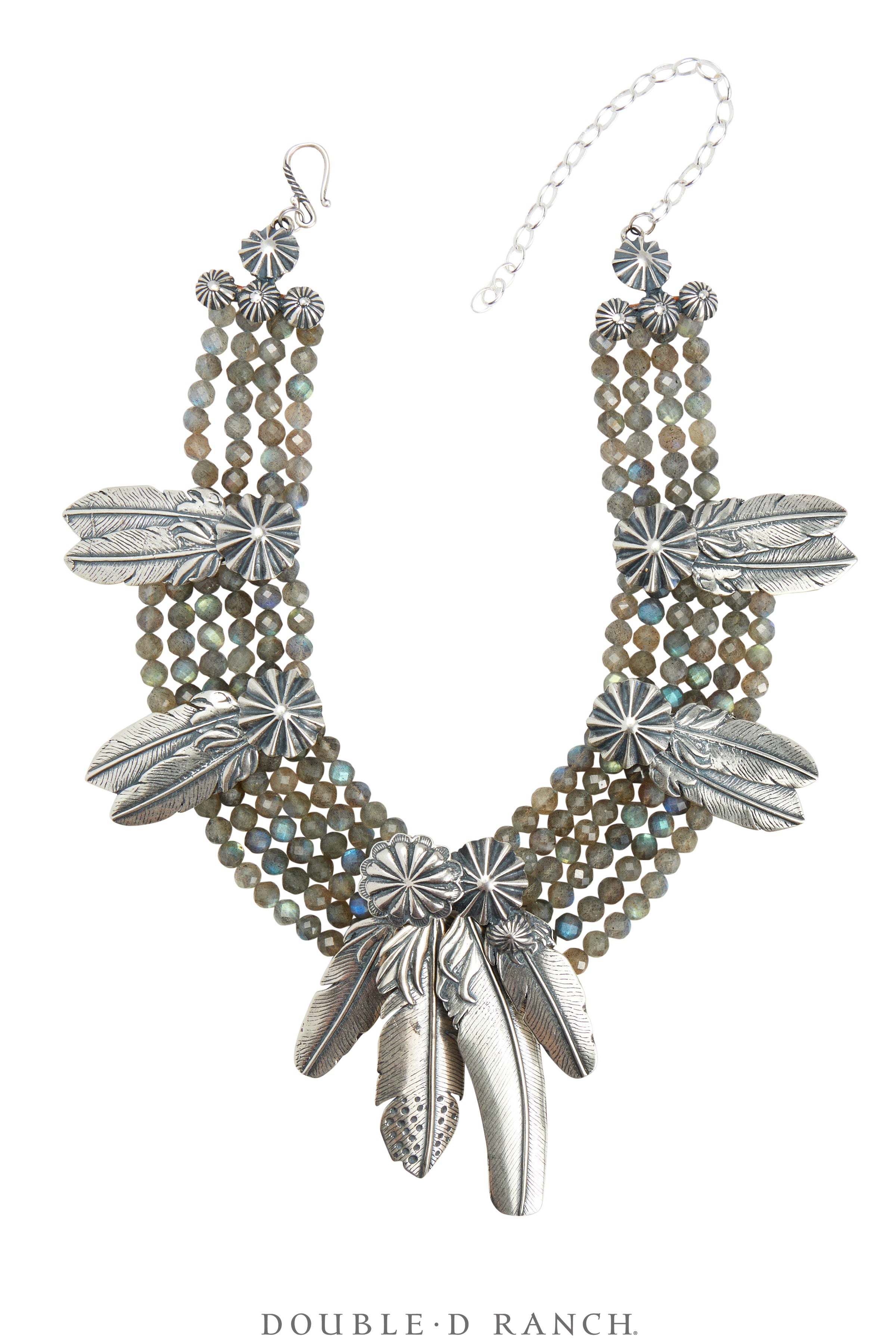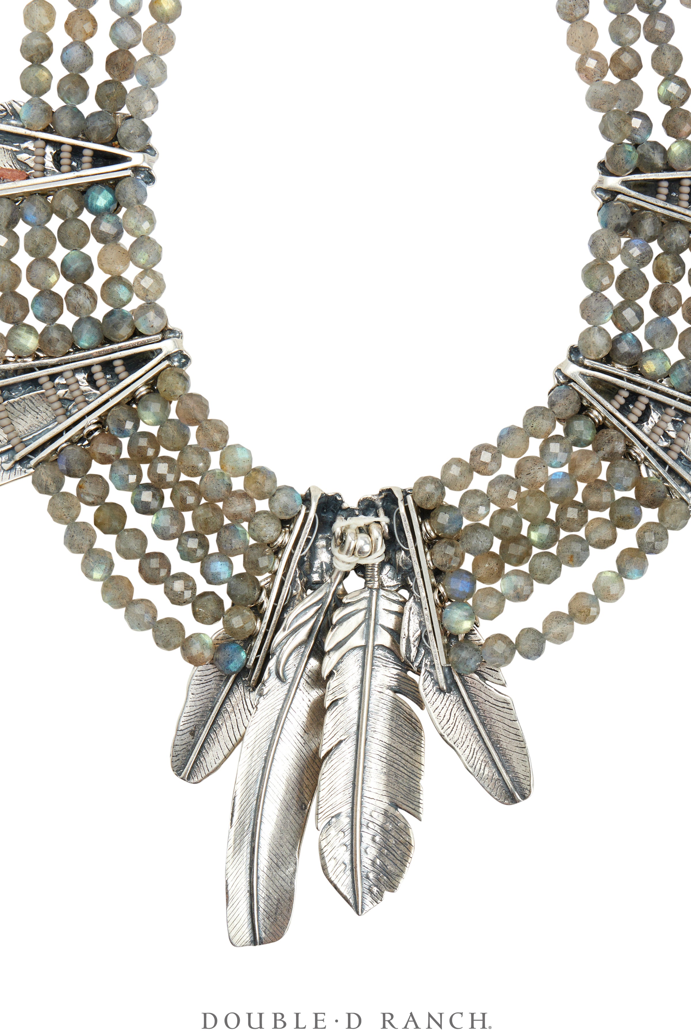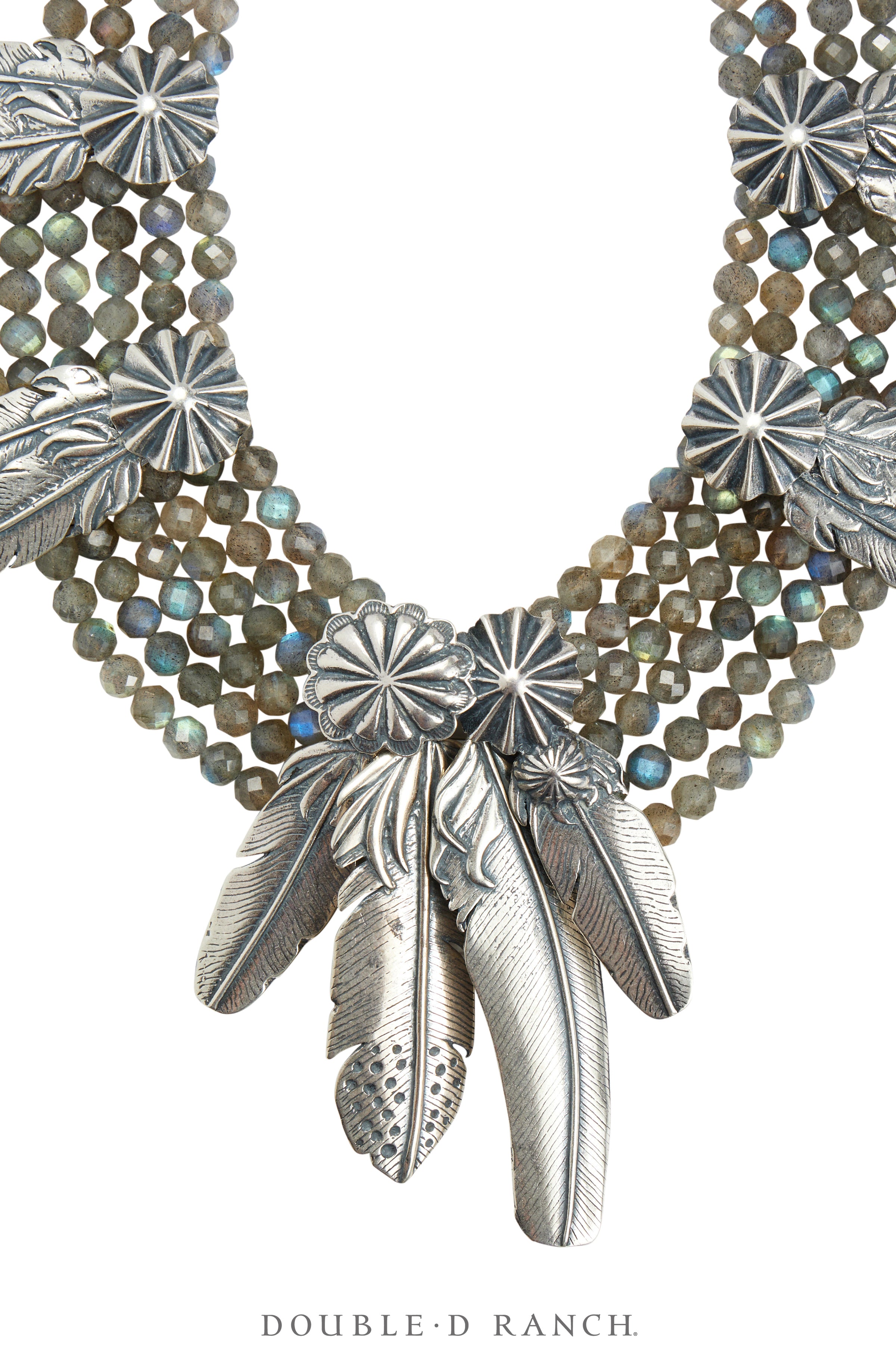 If you’re fairly well-versed in Southwestern jewelry, the legendary label needs no introduction. It’s long been known for its striking statement pieces (particularly chokers) crafted from and inspired by the archaeological digs of Doug Hancock, interpreted into wearable works of art and marketed by his wife Mary for decades. Well, we’re beyond thrilled to announce that the Mummy’s Bundle line is now a part of Double D Ranch, created from the original casts and by the same macrame artisan as the previously revered pieces. This fabulous Francesca necklace is a statement collar crafted from strands of faceted natural labrodite beads complemented with concho charms and sterling silver feather dangles.