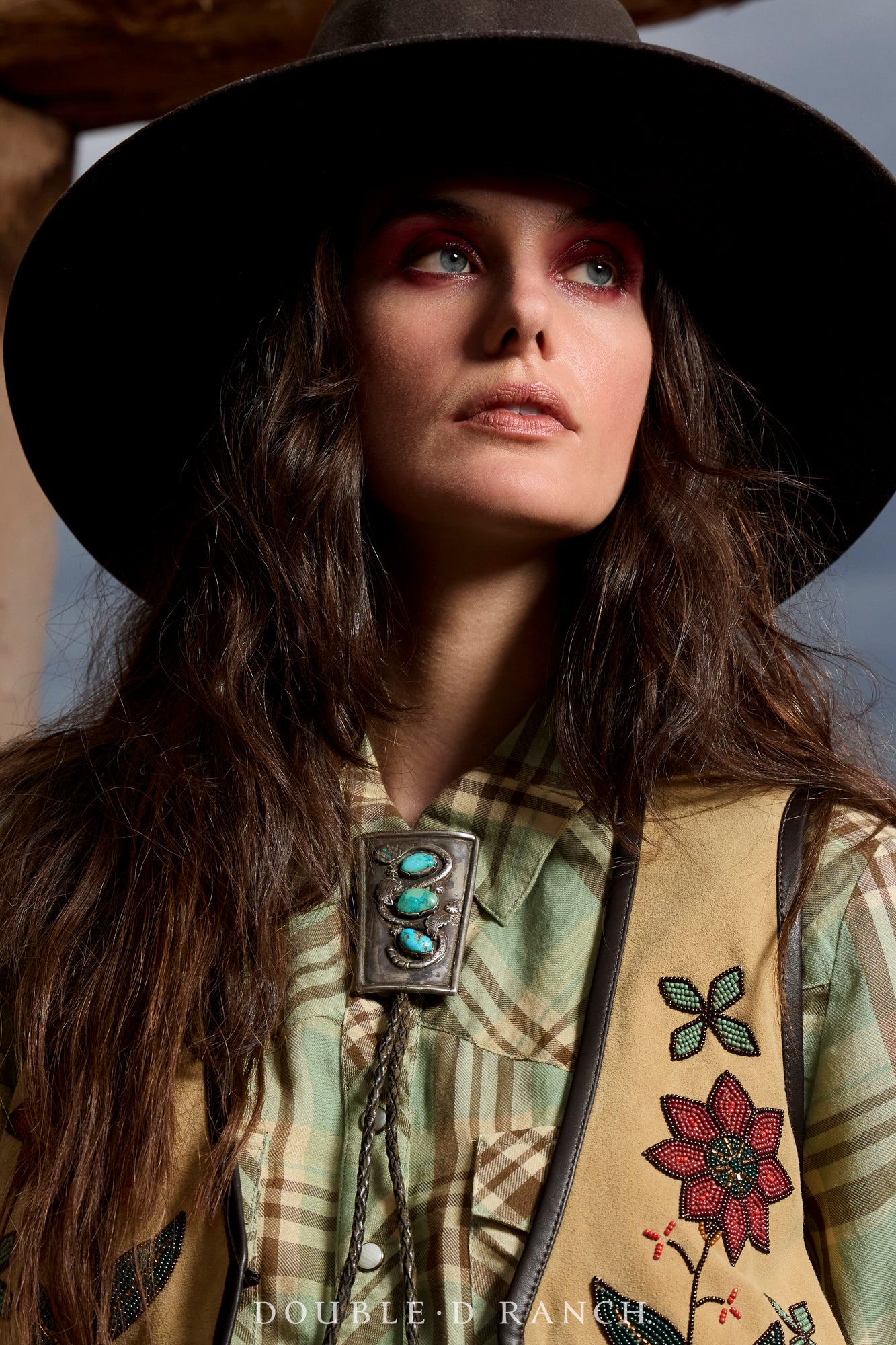 It’s hard to beat a bold bolo and this vintage beauty by Viola Calavaza, delivers classic style with ease. The sterling silver bolo features three beautiful turquoise stones with a silver snake winding through them. The starburst drops and leaf appliques complete the bolo. The traditional black braided leather cord is tipped with complementing silver aiguillettes. Timeless Western style for a guy or a gal!