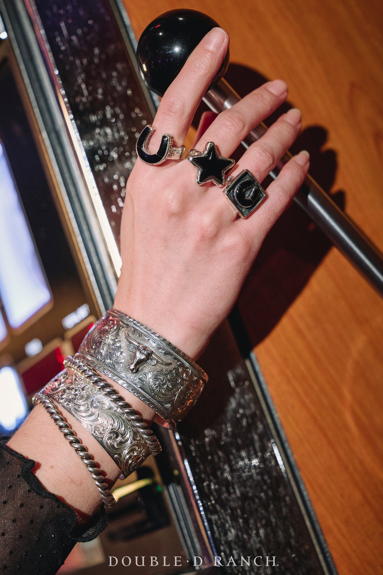 This contemporary cuff by Shawna Erikson will have you longing for longhorns. The wide set sterling silver band is engraved with a beautiful intricate pattern of scrollwork. The center of the cuff features a large longhorn head which stands out against the silverwork. A piece like this would be a bright addition to anyone’s collection and one that could be passed on for generations.