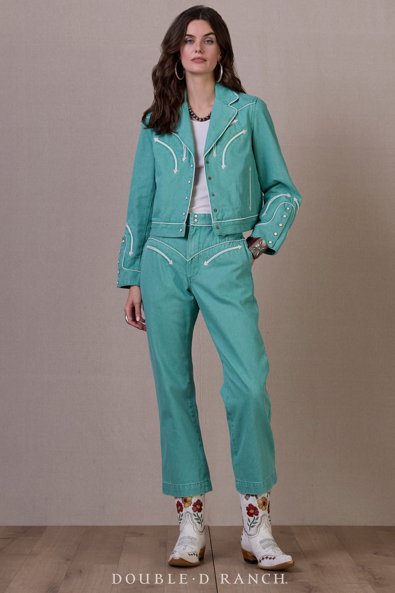 Of course we’re enamored with this jacket – it’s basically in our signature color! – but there’s a whole lot more to love about it. The silhouette is kind of a boxy trucker fit with a notch lapel and a 5-pearl snap cuff that gives it a retro-meets-modern vibe, complemented by classic Western welts and contrast piping. And then, you turn it around and get a whole different dose of fun with the throwback mock wanted poster of a pistol-wielding beauty dubbed “Barbed Wire Baby”!