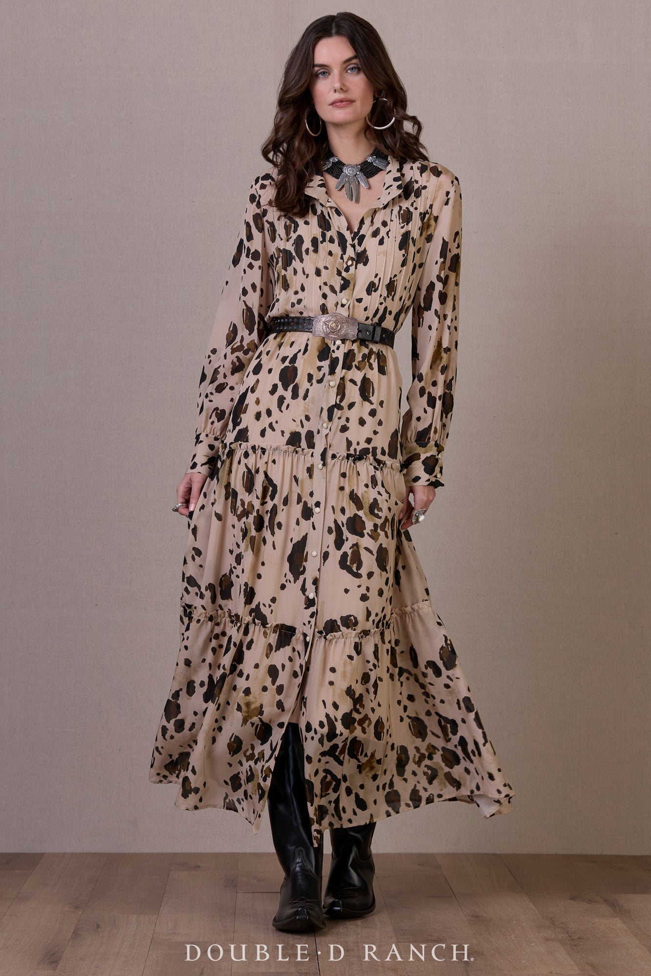 It just wouldn’t be right to design a whole equine-inspired collection without creating a pony print! (Don’t come for us about calling it chrome, we know it’s more of a paint pony print.) It may be one of our favorite animal prints ever, because it’s got a decidedly Western vibe – instantly reads more livestock than exotic – and the grounded earthy hues truly work as a neutral, which we’ve always believed in treating animal prints as anyway. This beautiful pearl snap maxi dress is an effortless cowgirl classic with a feminine, flowy silhouette, elevated by elements like pintucks, gathered tiers, and wide cuffs.