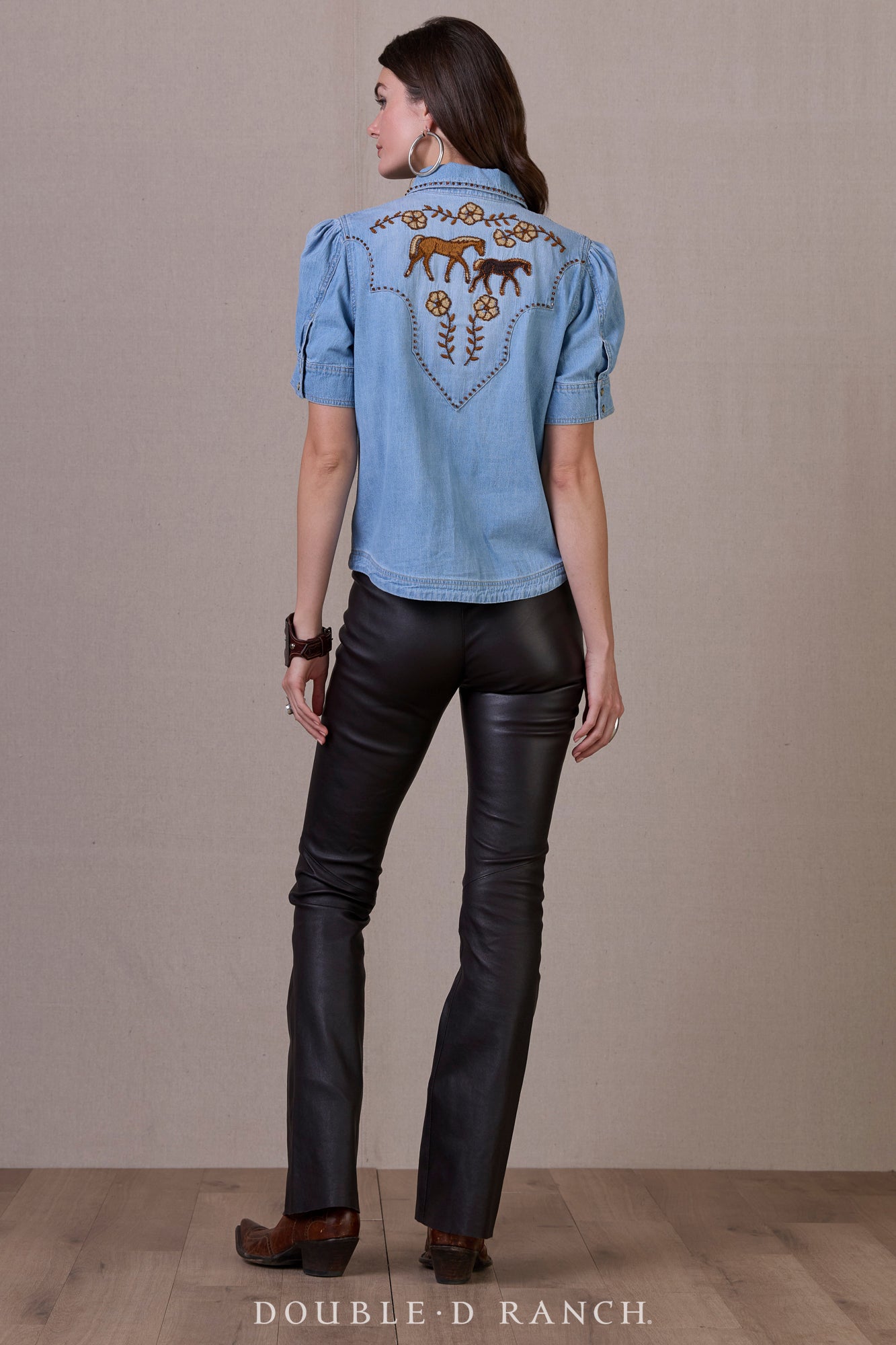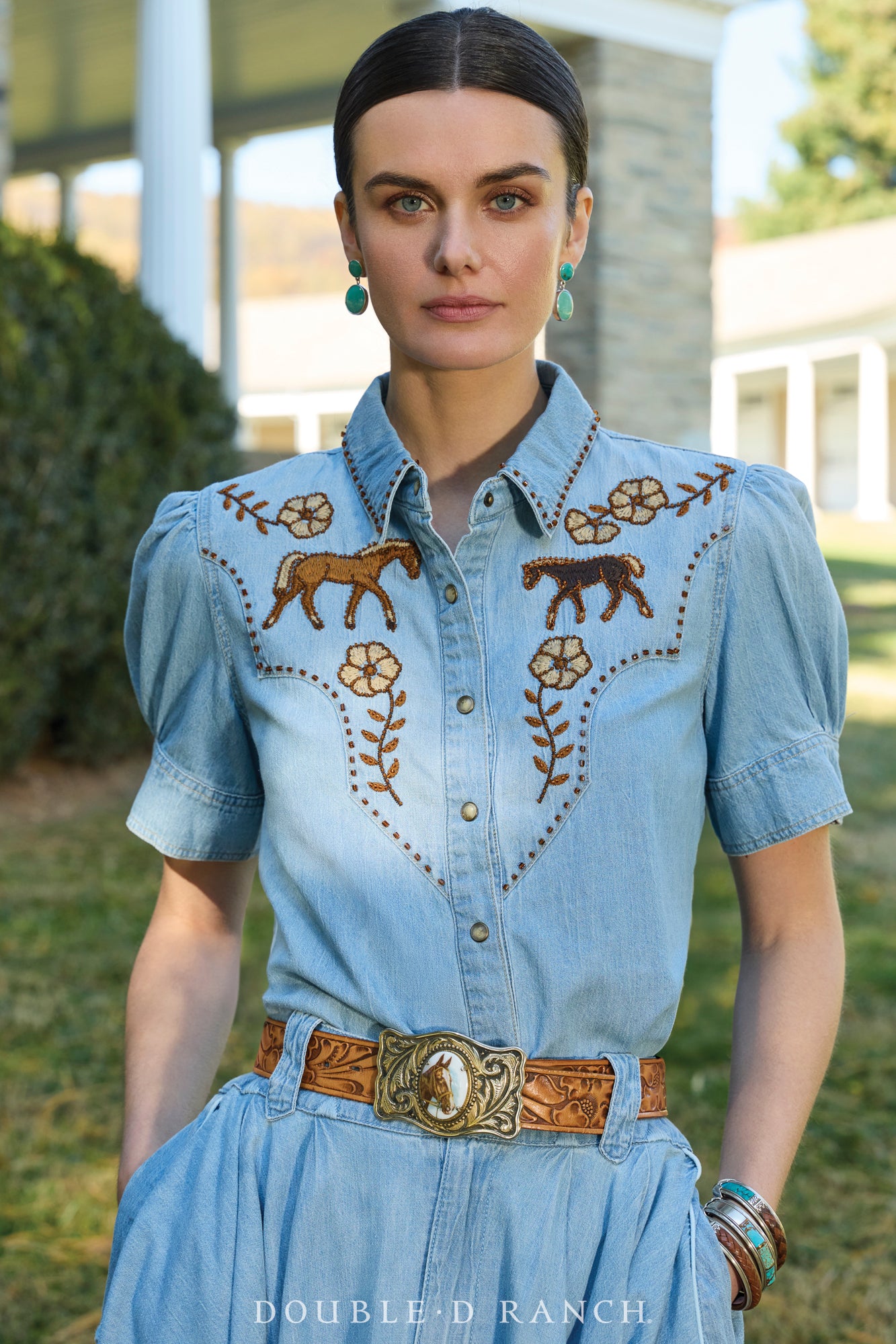 This darling top is a soft chambray denim button-down with cute puffed half-sleeves for a touch of added femininity. But it’s the accents that make this pretty pearl snap a horse girl’s dream! The yoke is adorned with intricate embroidery of ponies and florals, complemented by a dainty beaded trim.