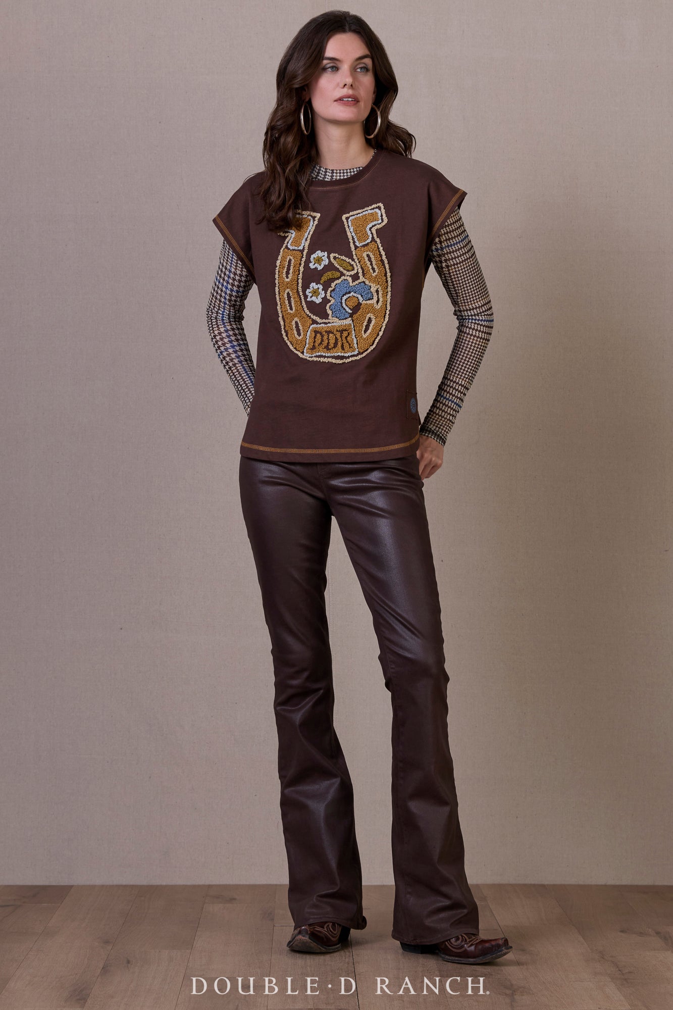Of course, this cute cotton top is adorable on its own, but we sure are loving it layered, too! (It’s great over the Gamit Tee or pairs perfectly with the McCoy pearl snap.) It’s a lovely ‘chicory’ cotton in a relaxed fit silhouette with a chic dolman sleeve, embellished with contrast stitching and terrycloth embroidery of an oversized horseshoe adorned with flowers and DDR. It’s eye-catching and easy to wear, a win-win for your wardrobe!