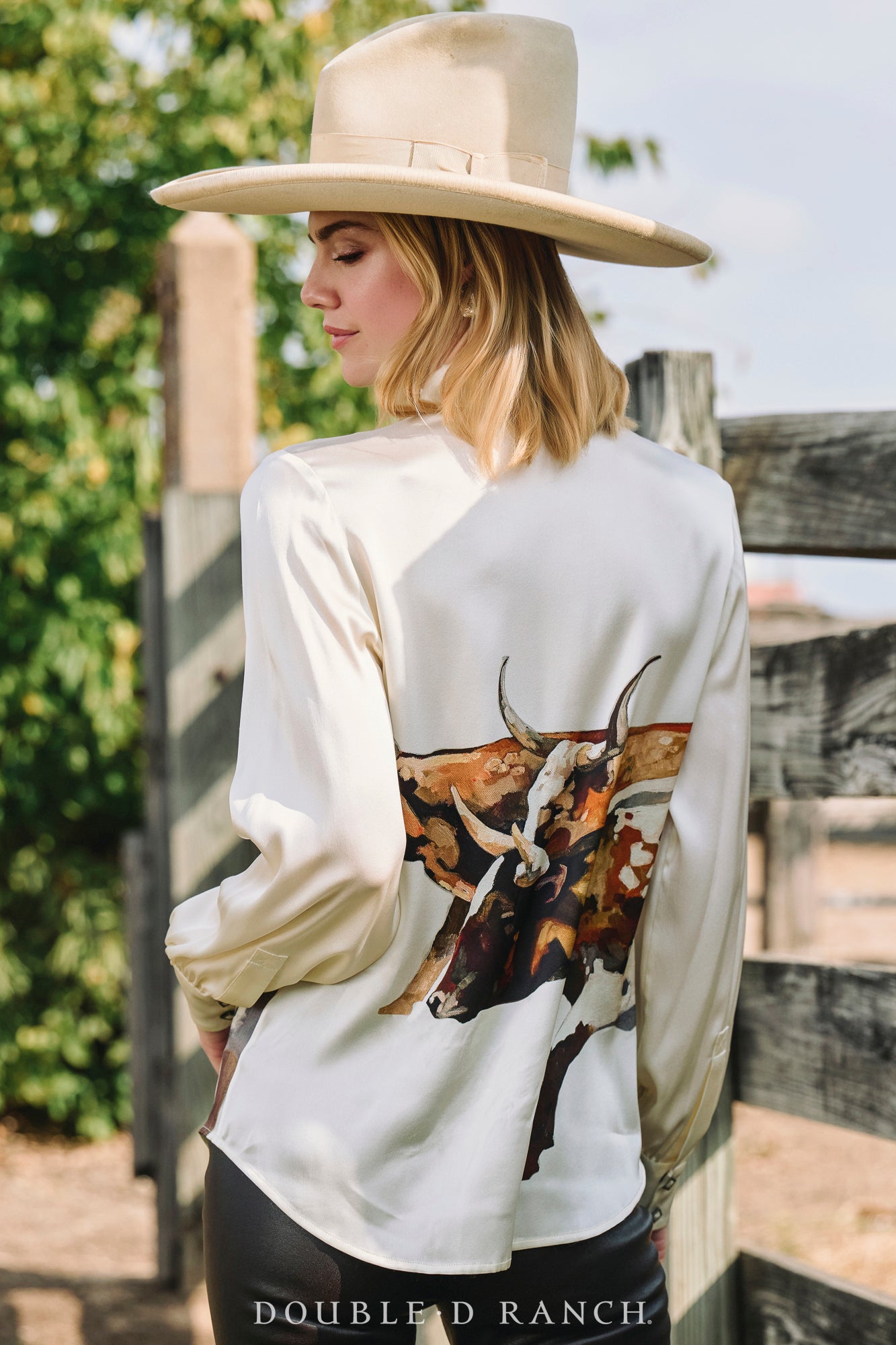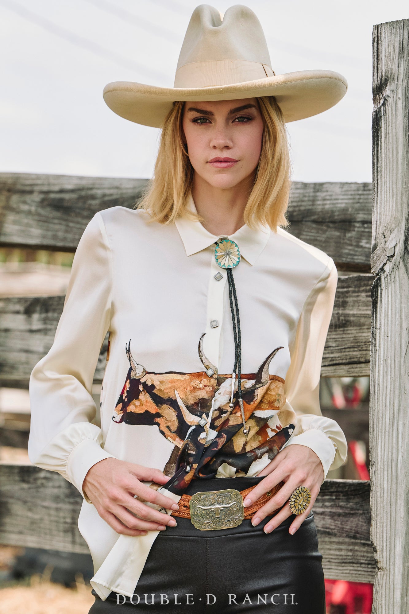 Whether you’re looking to get rigged up for the rodeo or gussied up for gameday at DKR Stadium, this top is a sleek way to pull off “cowgirl cool”. The silk blouse has a relaxed fit and slightly longer length that makes it easy to wear untucked or tucked, and we love it with anything from classic blue jeans to Bandit Pants. Hook’em.