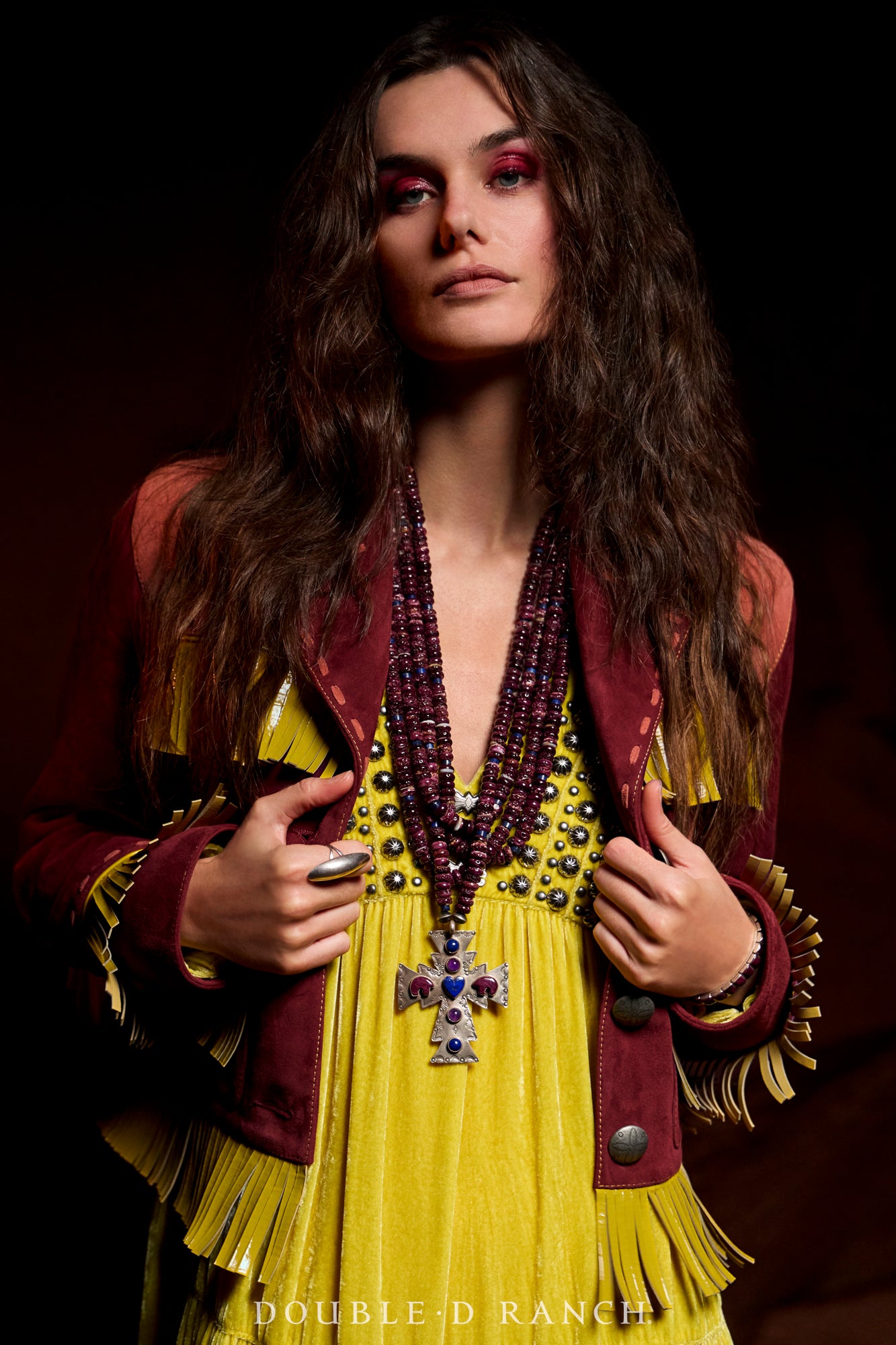 We are absolutely enamored with how this jacket came together. The gorgeous goat suede provides a timelessness, complemented by contrasting suede, western welts, and lacing… and, for a really fun pop, a bit of patent leather fringe!