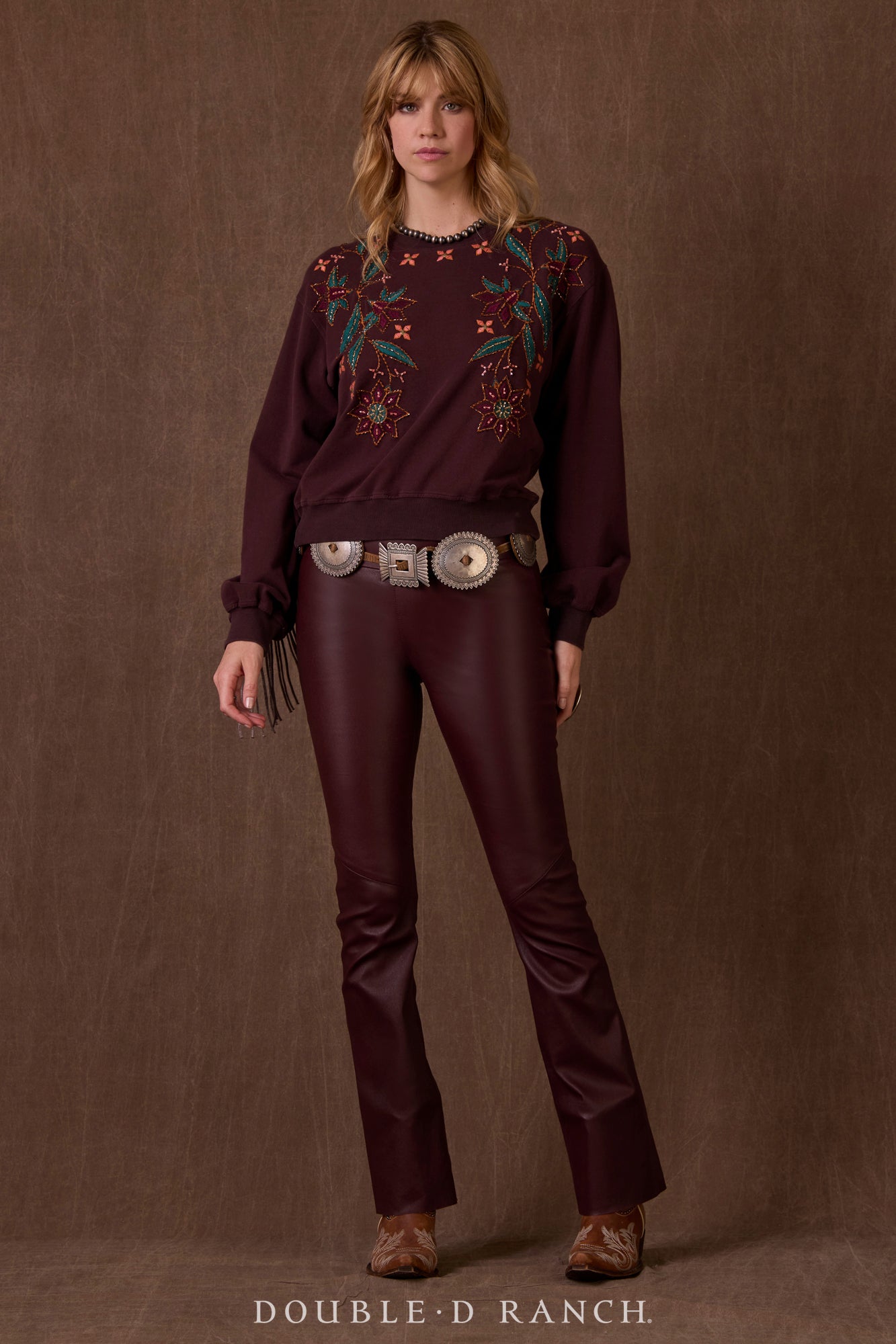 Ok, yes, technically, it’s a sweatshirt – but this baby is far from your ‘mow the lawn’ or ‘hit the jogging trail’ variety! First of all, that color couldn’t be more chic (or en vogue) and then that intricate embroidery and dazzling beadwork elevates it to its own category of casual-cool, but the contrasting cuff-to-cuff fringe makes it full on fab.