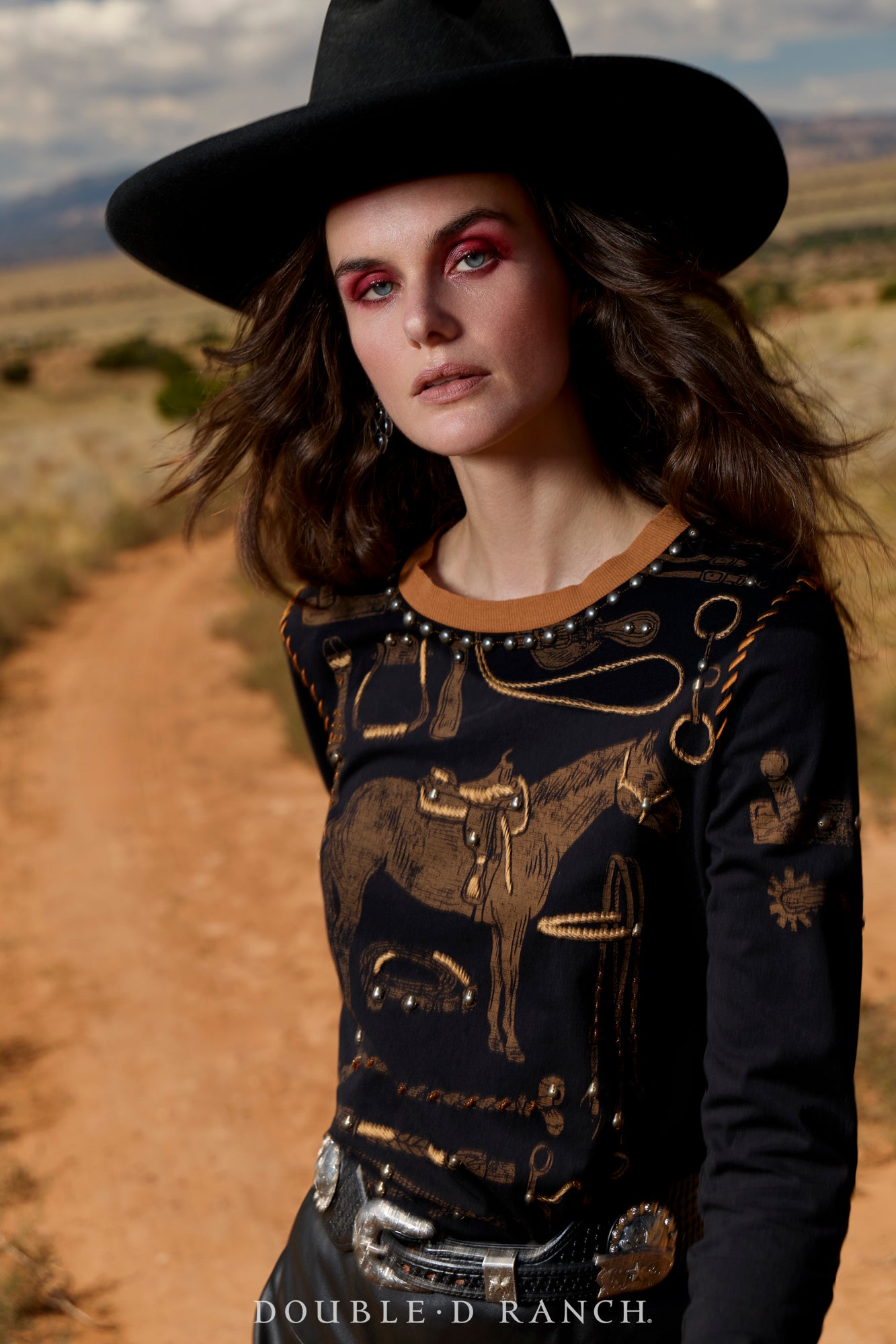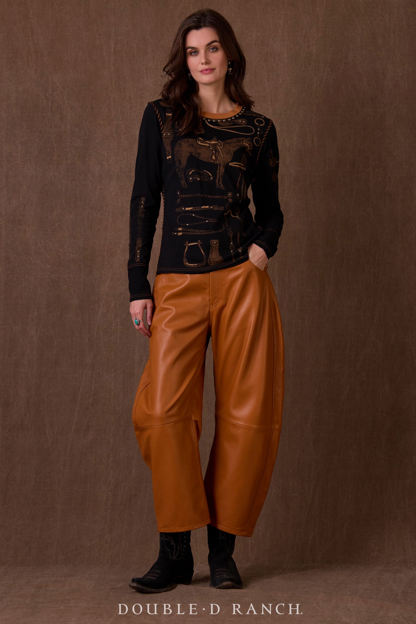 Whether you’re an authentic equestrian or just love the aesthetic, this chic cotton top is serving up horse-lovin’ vibes. The bold black long-sleeved top serves as a canvas for all kinds of equine imagery, complemented by a contrast collar and stitching, and finished with studding details.