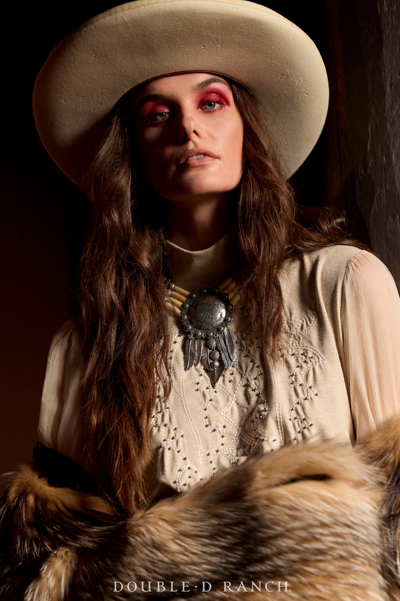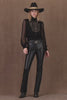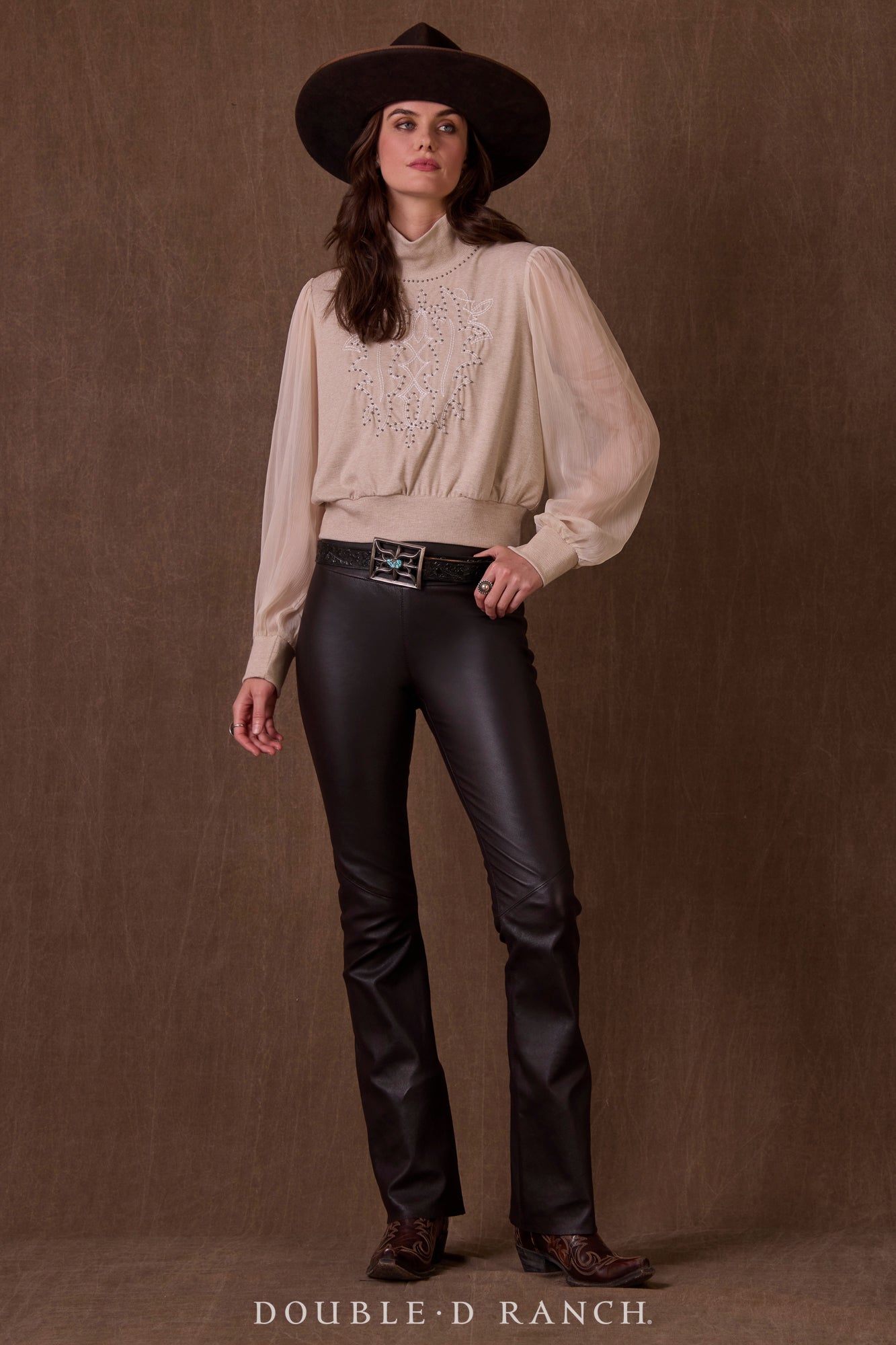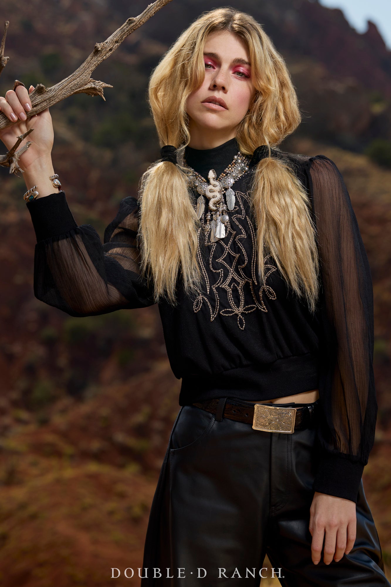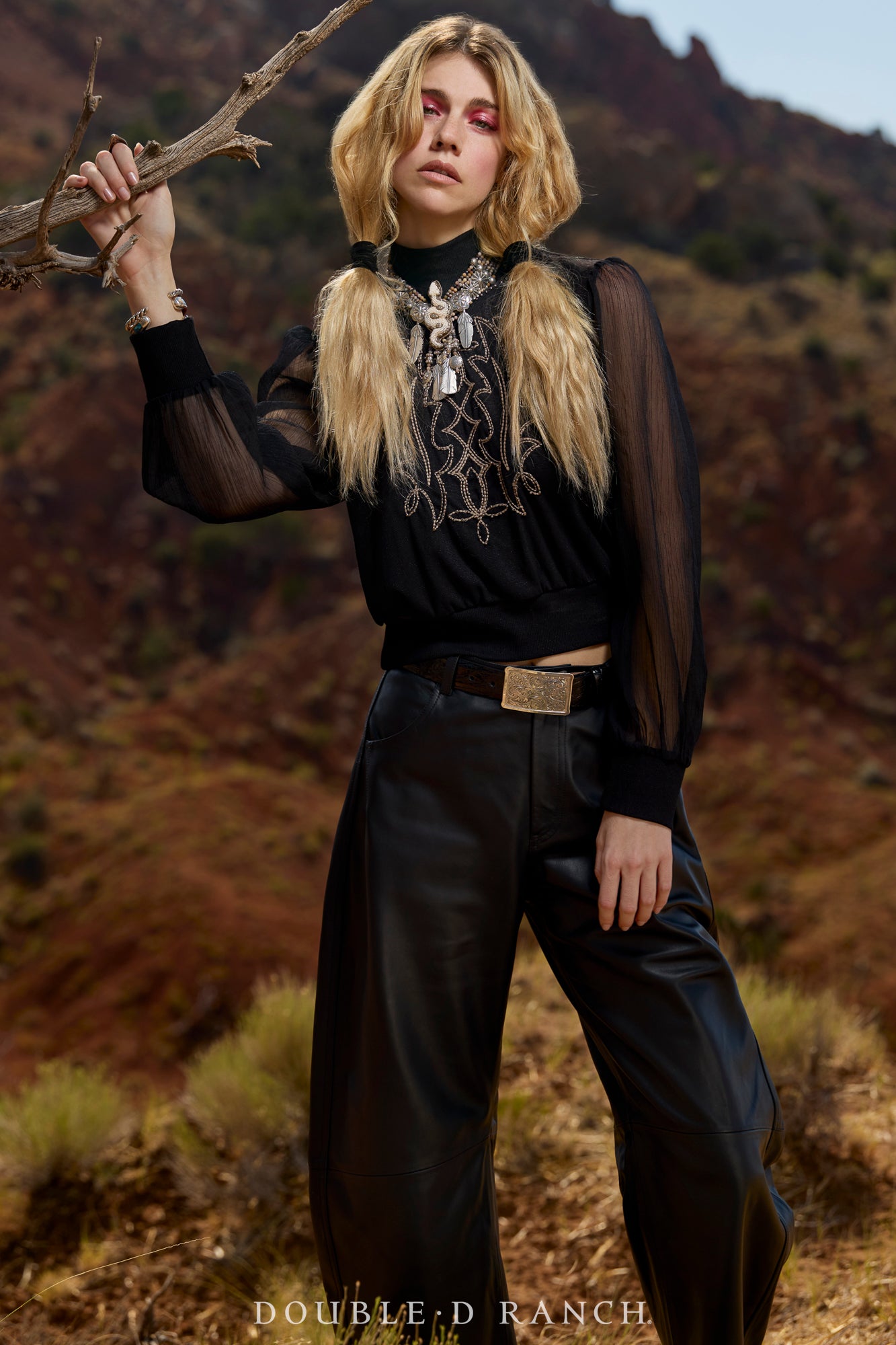 Elevate your outfit with this effortlessly elegant top. The bodice is a full-coverage fabric with a sleek mockneck, embellished with toebug style embroidery with beaded accents. It’s complemented by chic, sheer voluminous sleeves, and the cropped silhouette makes it perfect for pairing with your high-waisted jeans or barrel pants!