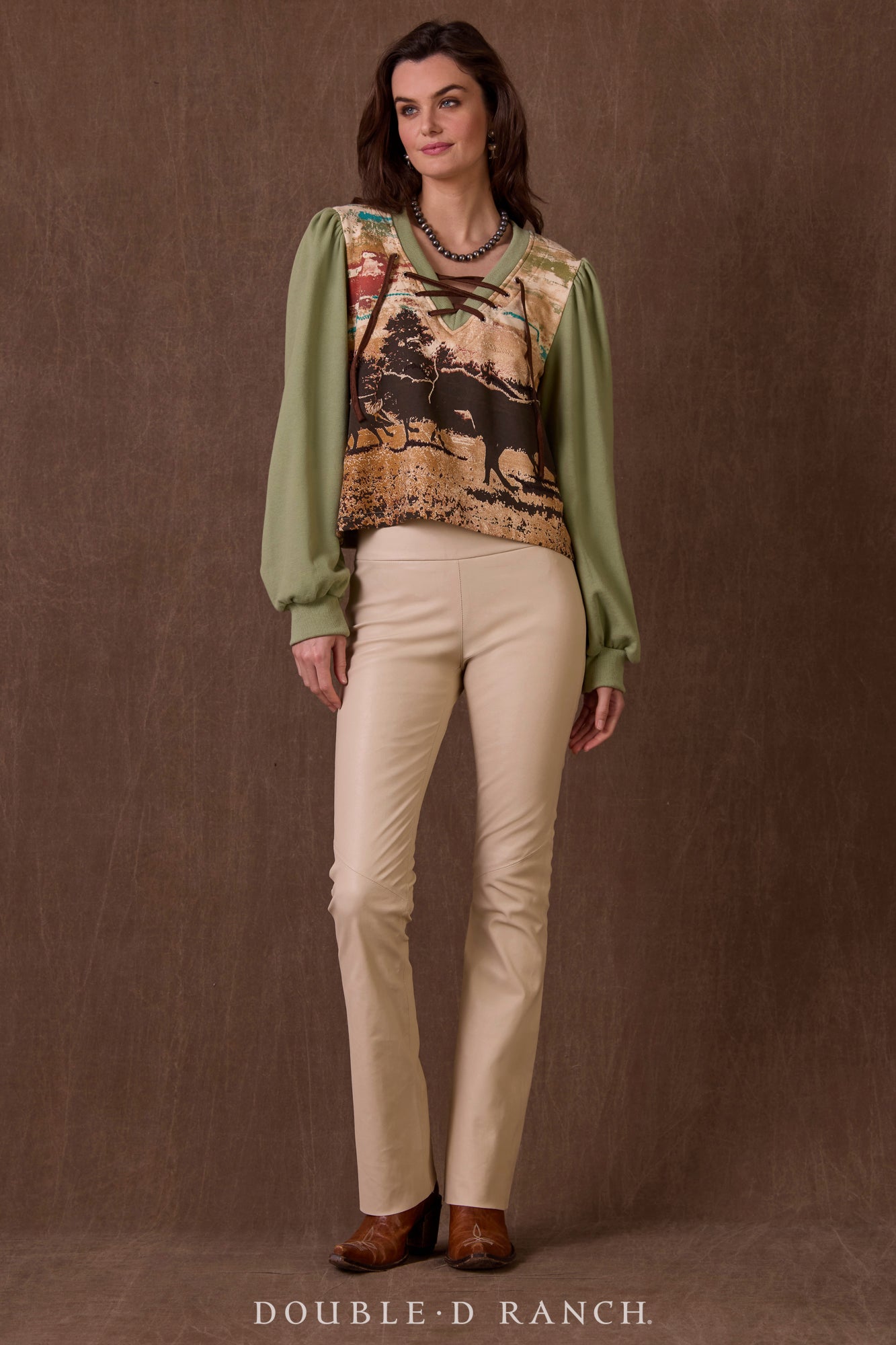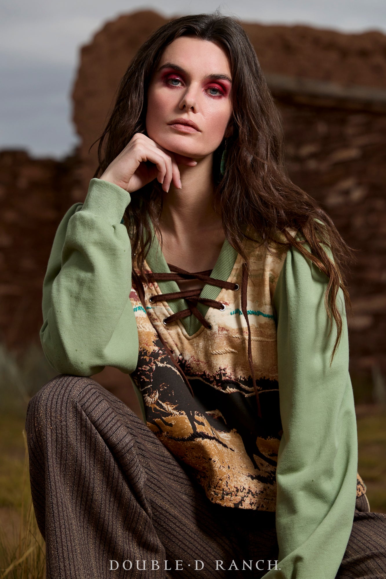 It’s *sort of* a sweatshirt, but we wouldn’t feel right calling it that – it’s just too lovely. The soft shade of ‘mineral’ green beautifully complements the incorporated image of Maura Allen’s art on the bodice, and the elements of cropped waist, puffed sleeve, and laced neckline add a unique femininity.