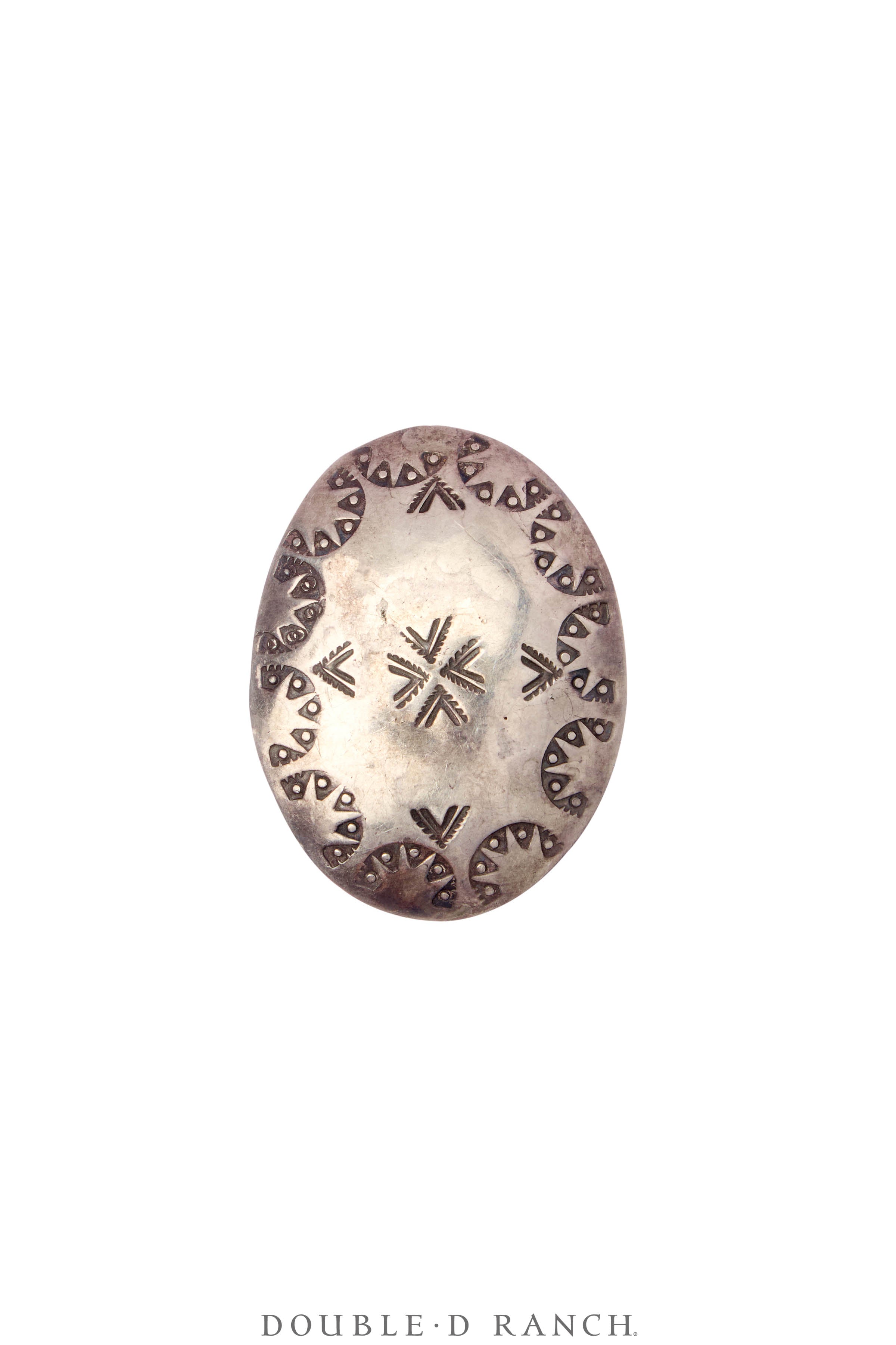 This pretty piece is a vintage creation that repurposed a classic concho into a chic scarf slide. The sterling silver concho features smooth edges and simple stampwork details. What a beautiful yet simple way to secure your Double D scarf with some southwestern style!